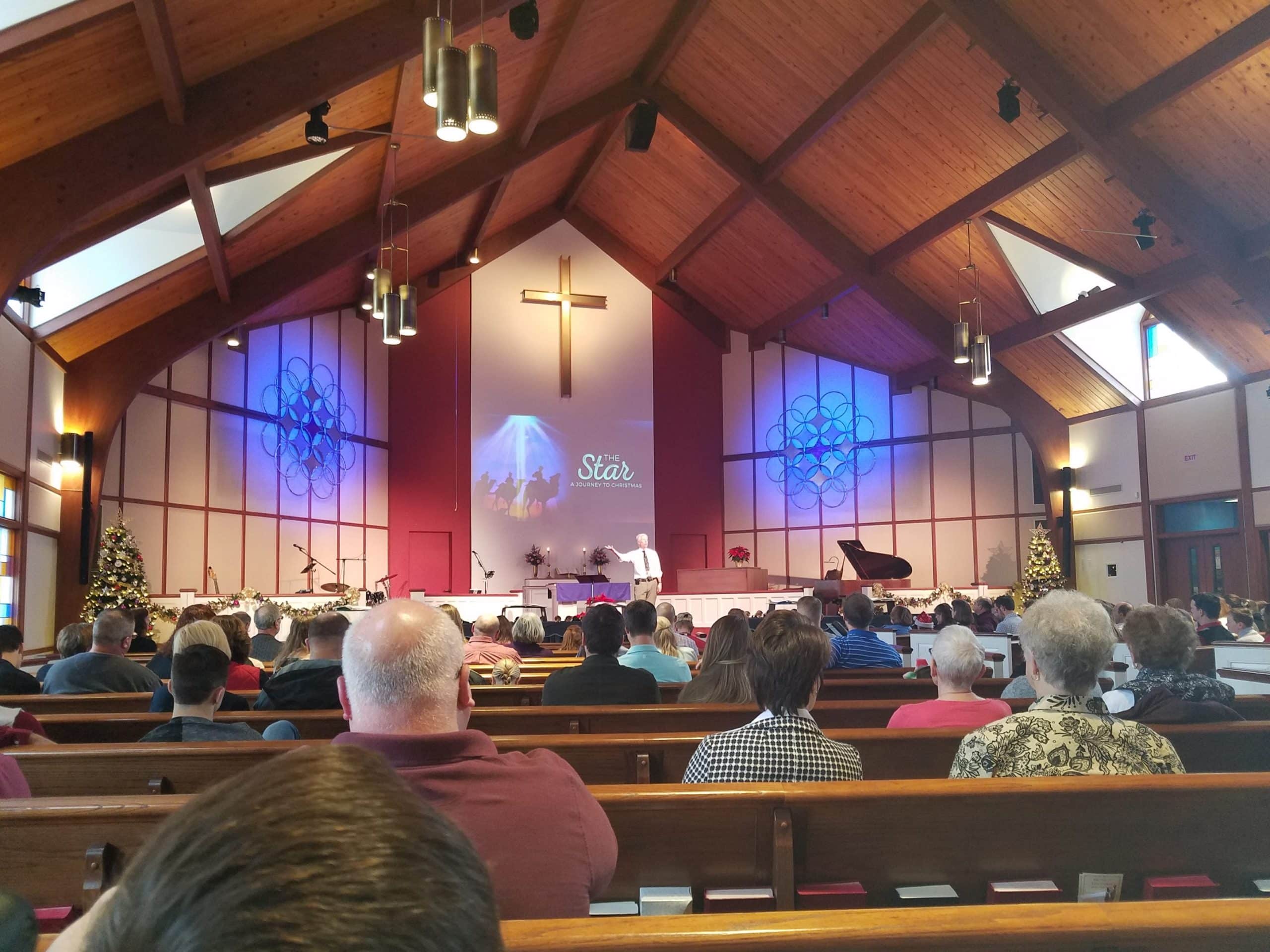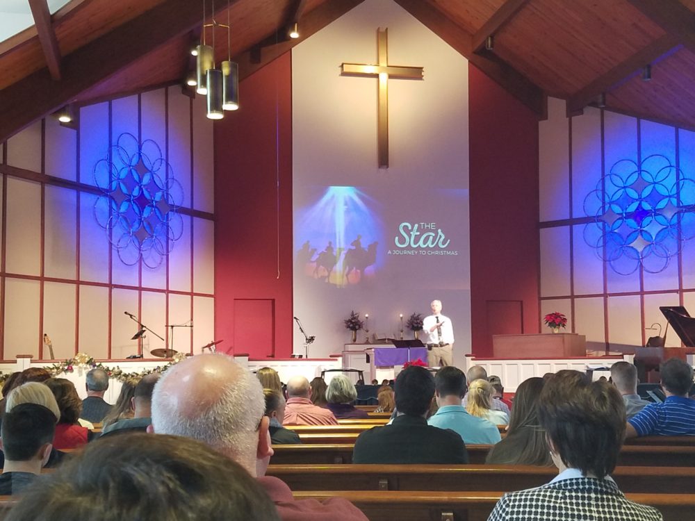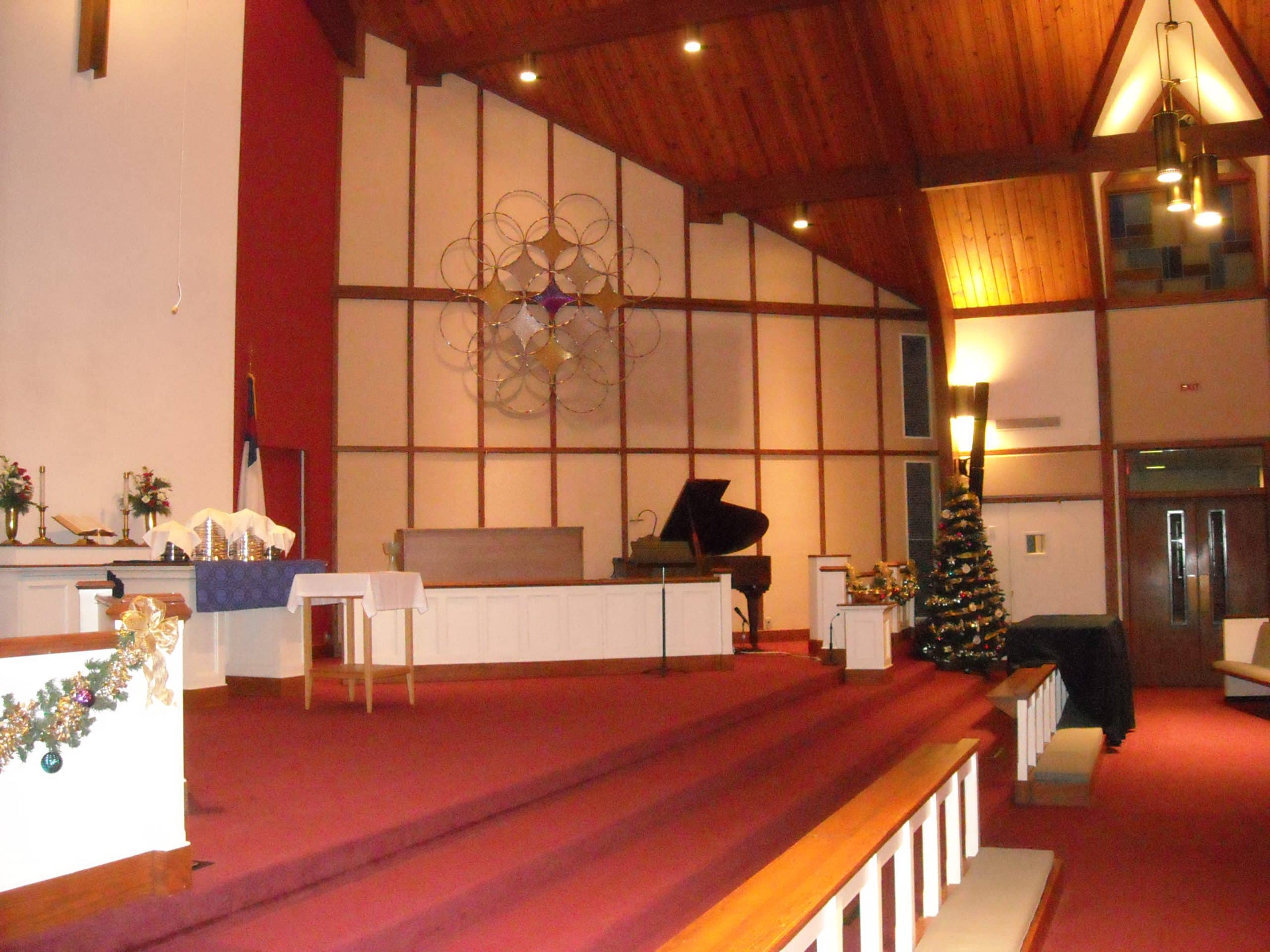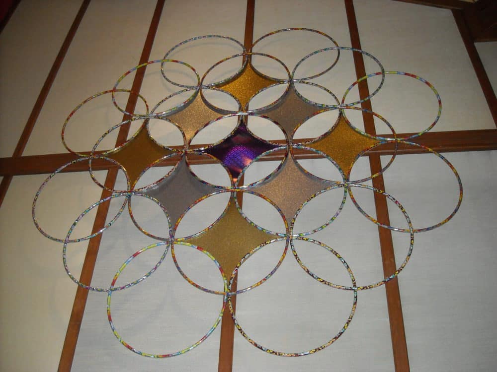 From Barb: Our church’s Advent-Christmas theme is “The Star – A Journey to Christmas”. In order to portray stars in the sky, the CSDI “Ring Bling” design came to mind since the intersection of the circles form a star. However, using wood to form the circles was not working for us, so we went to “Plan B”… hula-hoops! The hoops are light weight, keep their shape, inexpensive, and easy to work with. We purchased 42 hoops from Dollar Tree, 26.5” size (but any size would work depending on how big you want it to be). This made two, one for each side of the sanctuary. The hoops were wired together. Then gold, silver, and purple wrapping paper (glued onto poster board) was cut and taped to the back of the hoops for each star. The overall design formed a “wreath” and is around 9 feet wide. It was a challenge finding that many hula-hoops off-season. If you can’t find all the same size, it’s very easy to cut them smaller. Also, the ones we bought were already covered in a silver foil wrap which catches the light nicely. The congregation was curious and surprised by the material used.