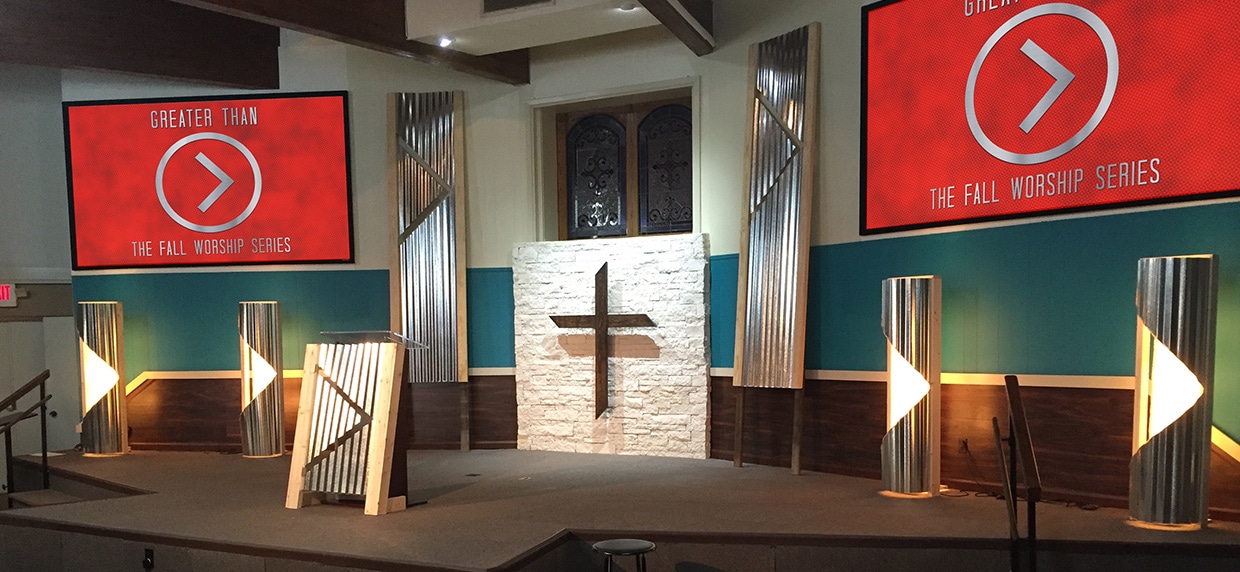 From Duncan: The stage was designed around the current worship theme of Greater Than. I wanted to go for a metallic look to complement the series graphic. I used corrugated aluminum cut at 45º to make the “greater than” symbol in the negative space. The symbol repeats in several set pieces.