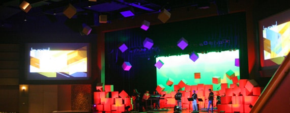To create this set for their series “the Box”, they stacked about 80 empty cardboard boxes. To add a more explosive element, they extended the boxes beyond the stage. So they used 20lb fishing line and hung boxes from their catwalk above congregation. Then they hit the whole set with some great lighting to bring it to life!