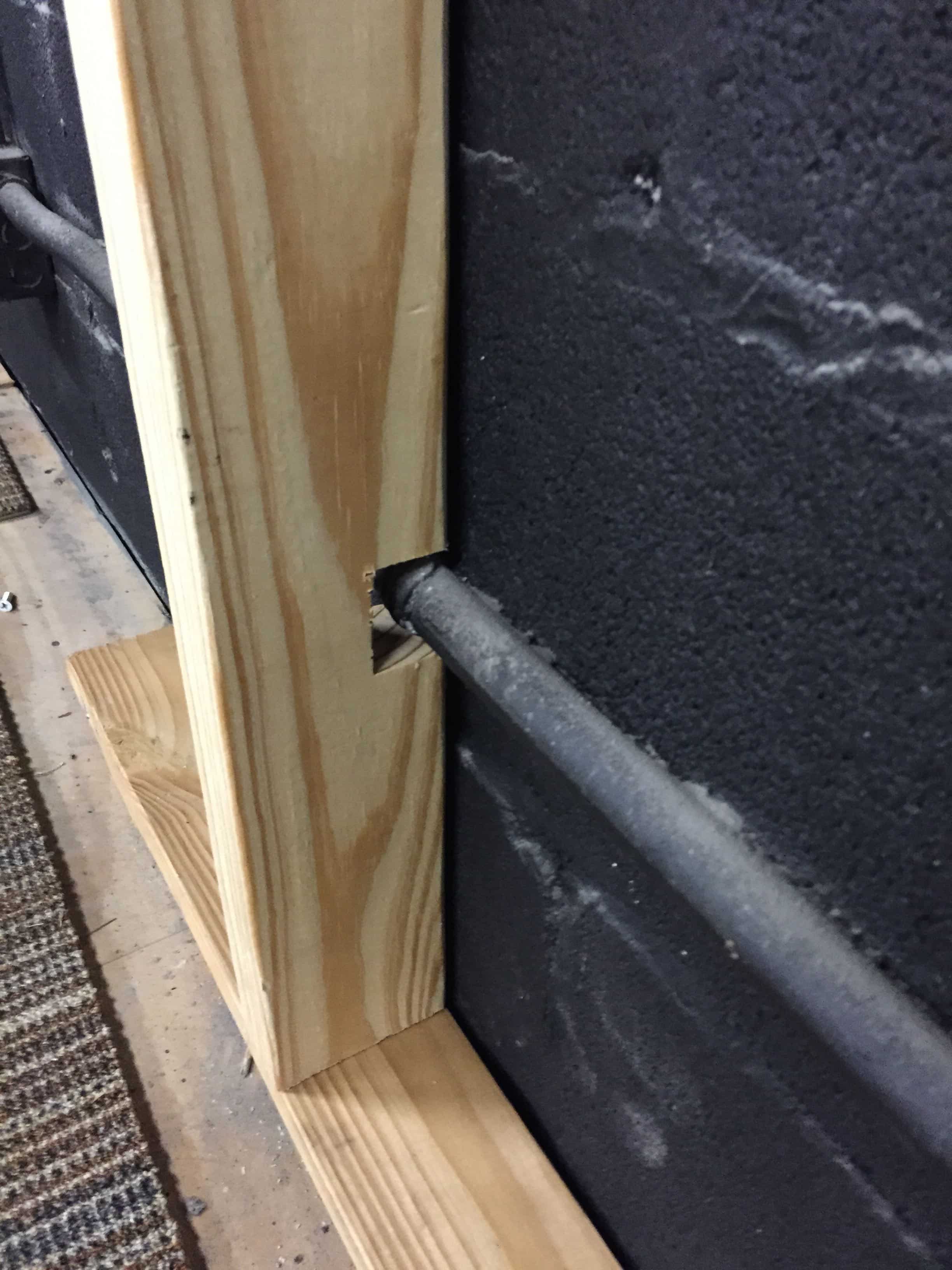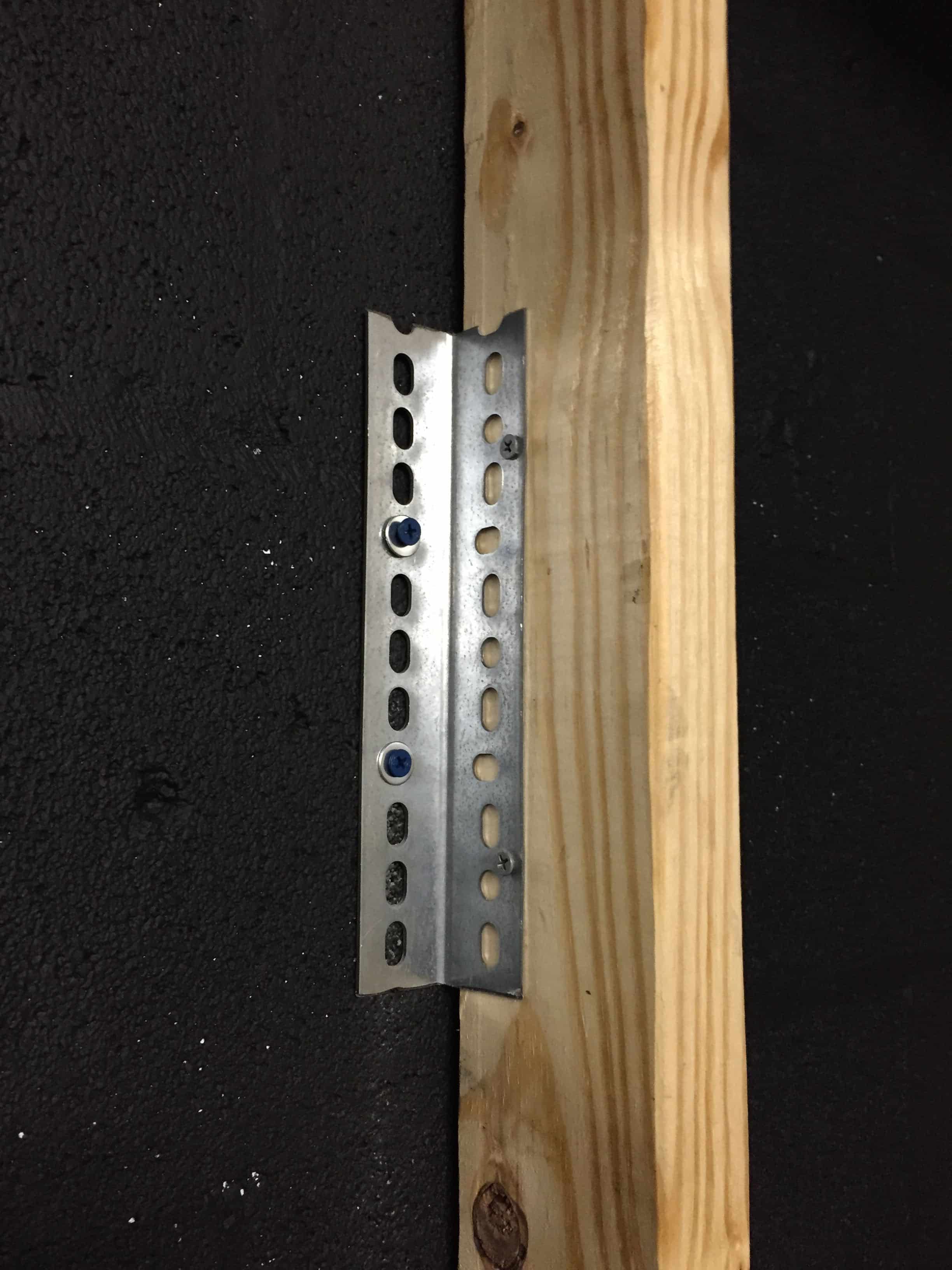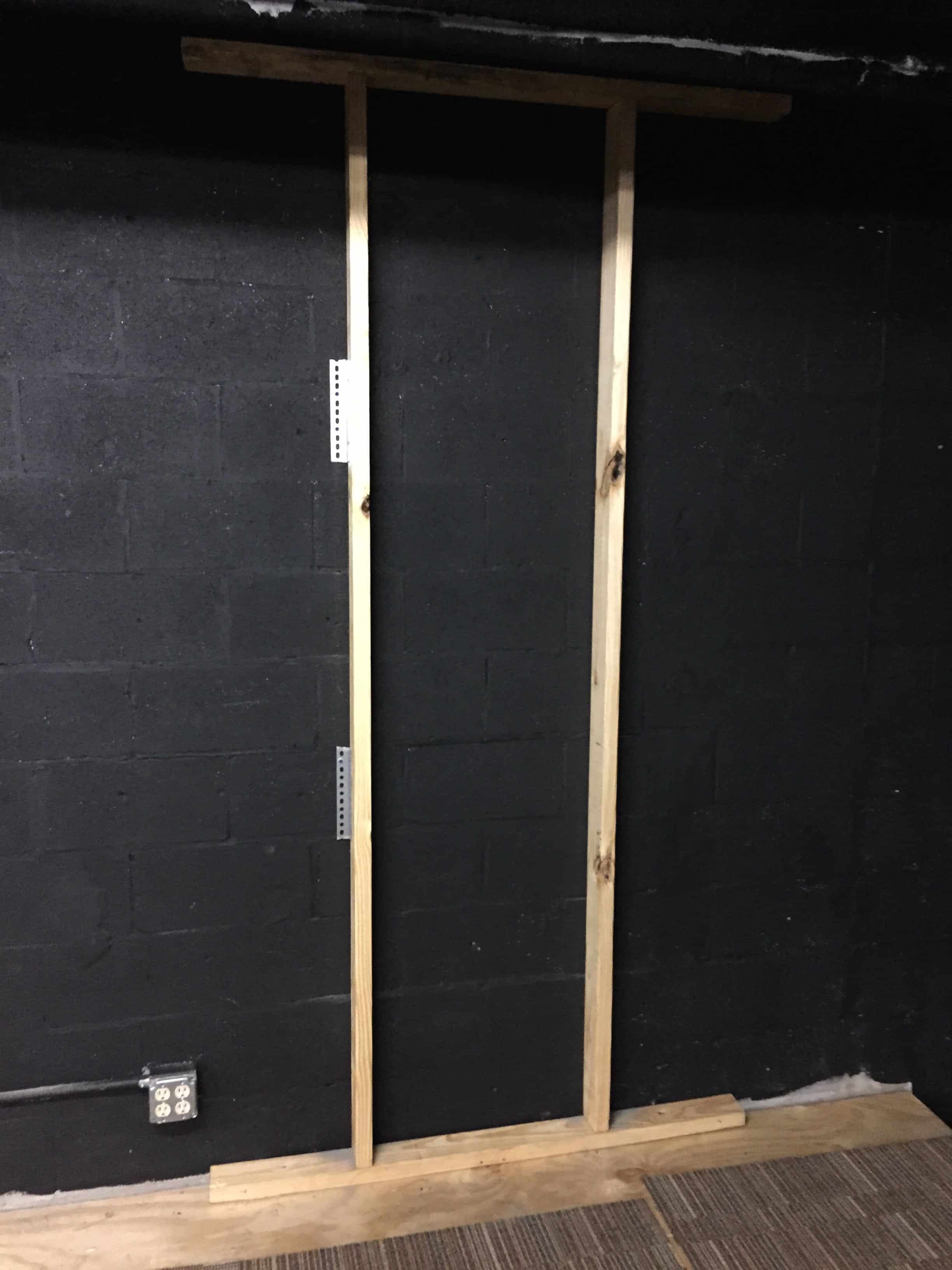 Once they had everything organized, they made three structures which were 3 feet by 8 feet to attach the wood to. They ended up being able to salvage the top and bottom pieces from the pallets, which meant they only had to buy six 8-foot 2x4s, braces to attach them to the wall, masonry screws, and some nails to attach the wood to the structures. They built the structures and placed them where they wanted them to go to make sure they would fit. Once they did this, they realized the electrical conduit that was attached to the wall needed to have a notch cut around it. They did this 3 times until the structures were flush with the cinder block wall.