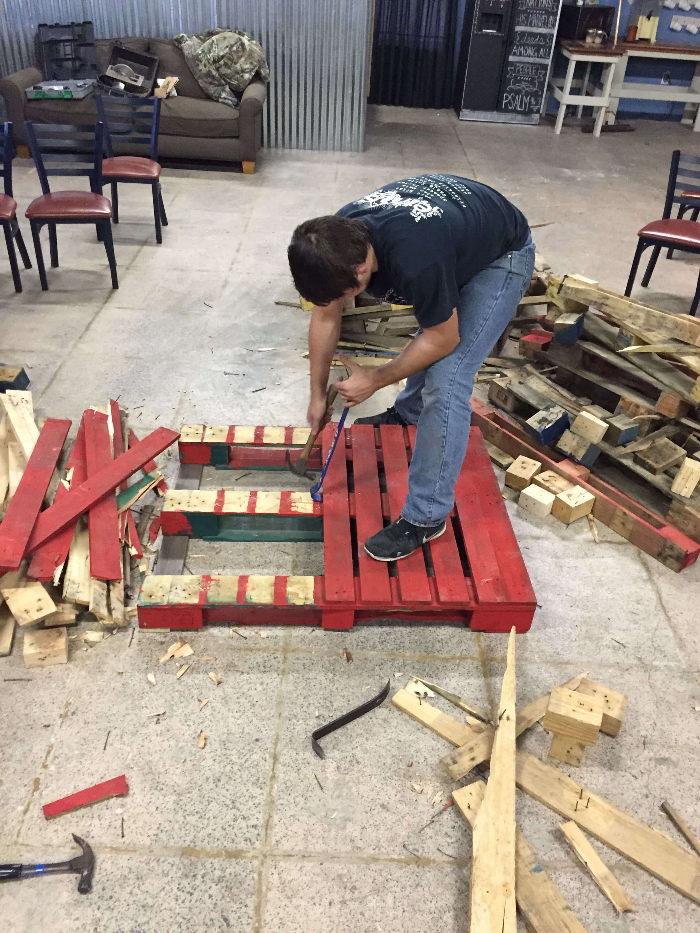 Before starting, they contacted a local warehouse that sells electrical supplies, and asked for any old (un-chemically treated) pallets that they could use. They had some on hand and offered to deliver them to their youth building. Over two weeks, they decided to pull apart over 30 pallets by hand for their design. Once they did so, they arranged them by width to make sure that their pillars would be level with no gaps.