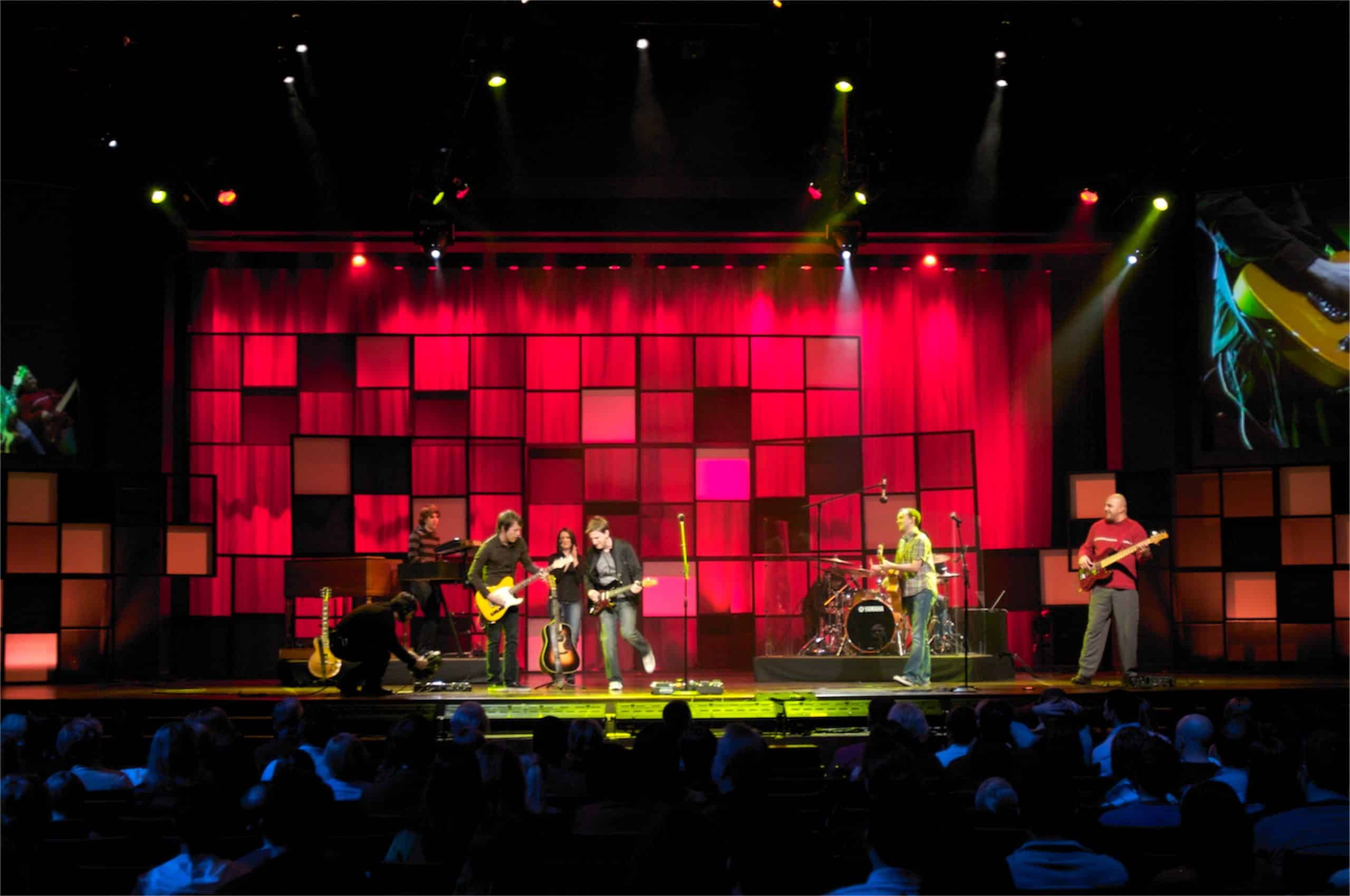 Then they took the frames and stapled the 3 different types of fabrics onto the back to create the desired design. The rectangles were stacked into the desired configuration and screwed into the floor and to one another. They also had 2 pieces on either side that were hung using aircraft cable through a counter balanced pulley system that allowed an operator to fly them up and down. This system was used on Sunday mornings so that their risers could be struck for Andy’s messages.