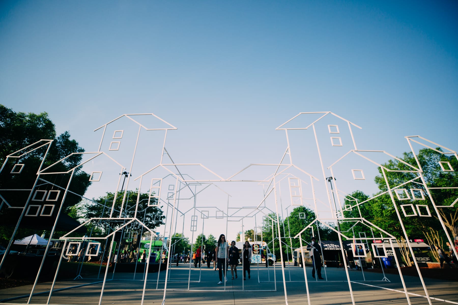 The “line-drawing” design of the buildings was based off an illustration that was done for this event and used throughout the space and curriculum for the event.
