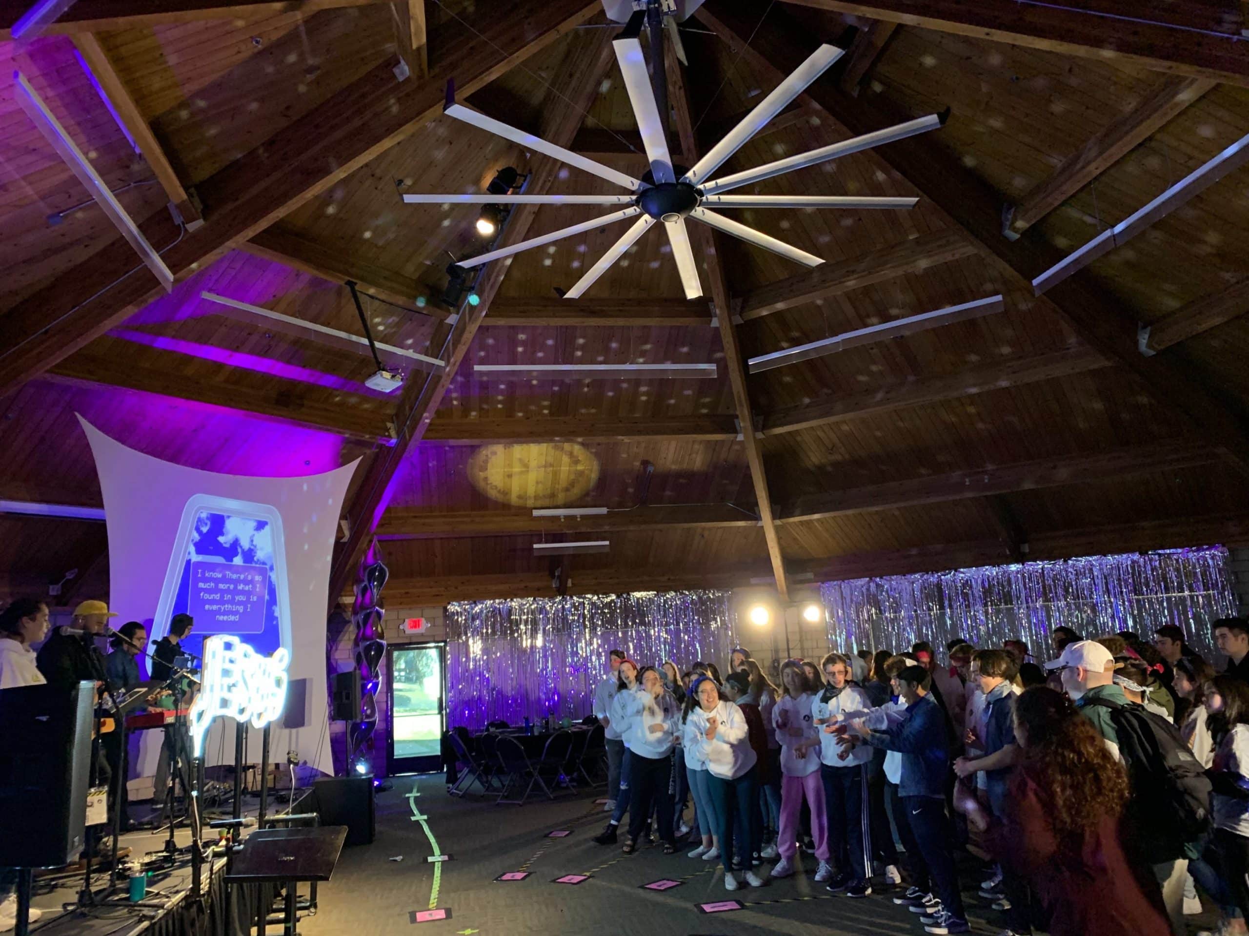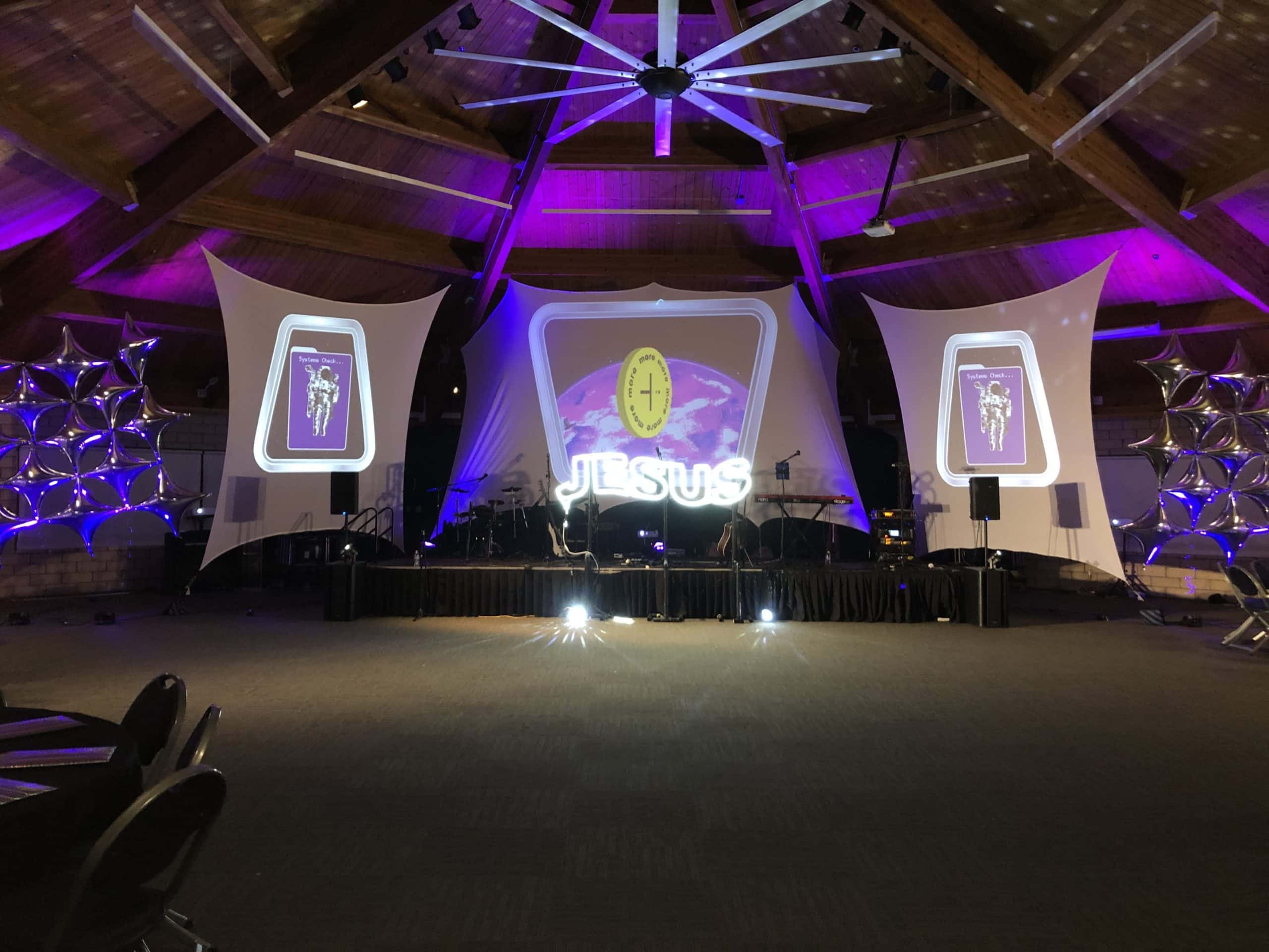 From Ani: This design was for our Youth Ministry program (called Life Teen) for the Winter Retreat. It was a temporary set up at a meeting space at a camp we rented in Calabasas, CA. Theme of the weekend was “More” which was a space themed retreat.