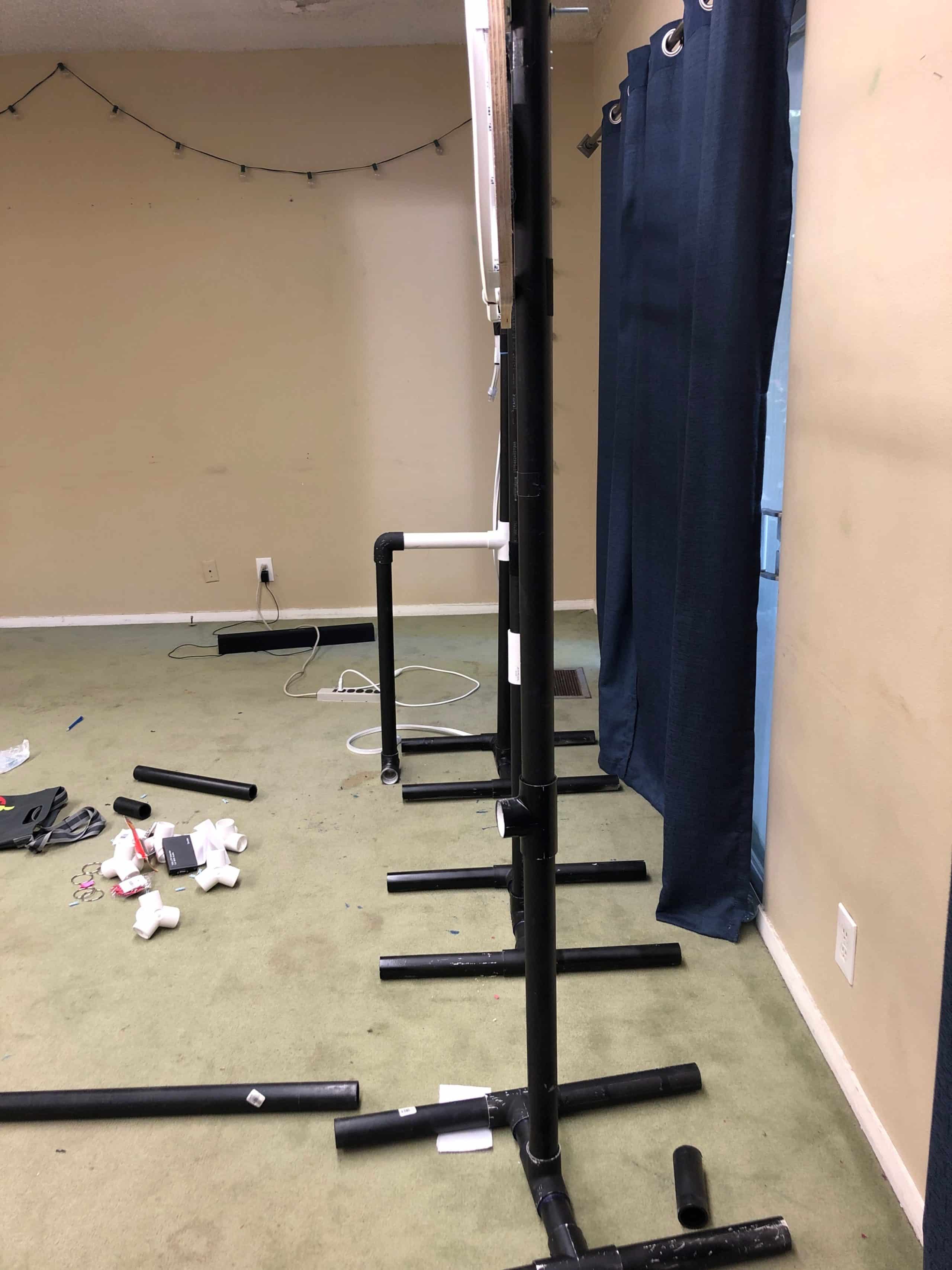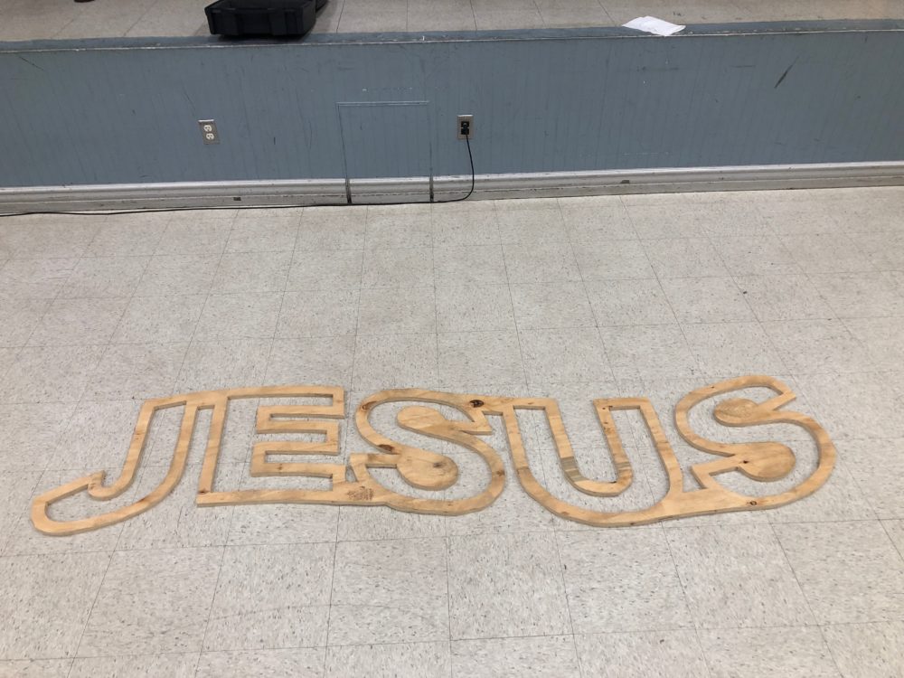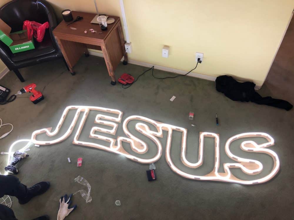 Used a 8ft by 4ft sheet of plywood (about 1/2″ thick) ($25) and projected the “JESUS” lettering on it and traced it with a pencil. Then used a jig saw to cut out the design. Then brackets for LED rope were drilled on (Some come with LED rope but we had to order an extra pack $20). The whole thing was spray painted white. Then the LED rope (about $50 on Amazon) was threaded through the brackets. For the stand, we used left over black PVC pipes to construct 3 legs. 3 brackets were drilled in at the tops so that the LED sign can sit on a lip and hang.