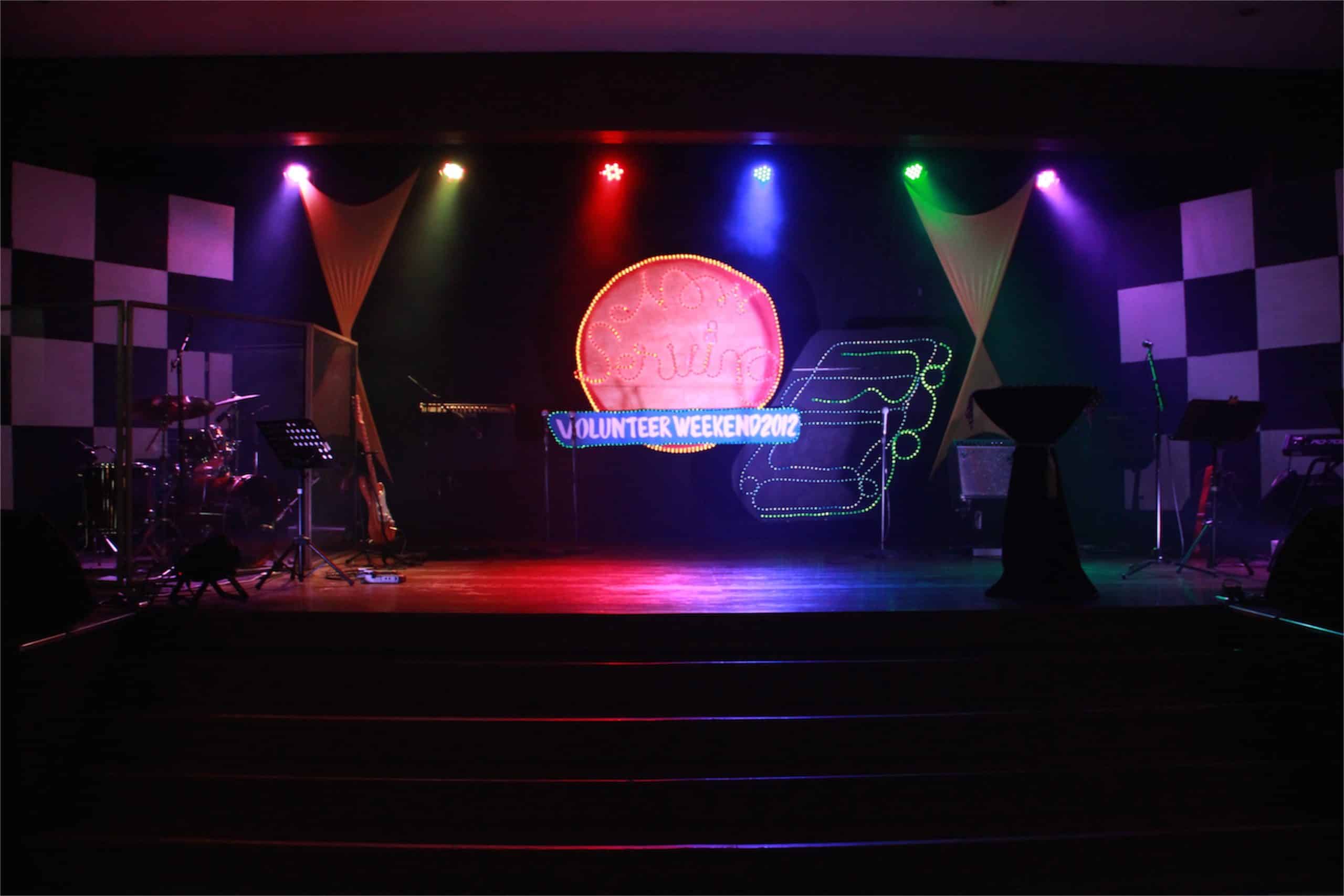 They were going for an American diner feel for their volunteer weekend. They built the “Now Serving” logo using the same font as Johnny Rockets. They built it from clipping red rope lights to a styrofoam base through thin wires. They designed the wall using checkered styrofoam. In addition to the stage design, the ministry heads of the church also wore outfits that resembled a manager’s uniform with caps, aprons, and different neckties that corresponded to their ministry.
