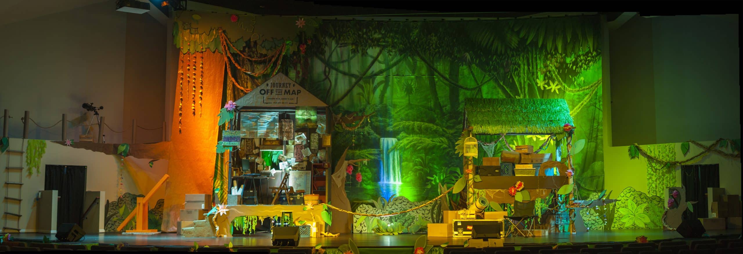 For VBS this year, they did Lifeway’s “Journey Off The Map.” They had over a dozen volunteers help over two weeks time to put up the set in their Worship Center. The main design was created by Crystal Tuxhorn and Ann Mannix. Their maintenance team built the two tree houses out of existing platforms, just adding the walls, roofs, and raising them off the ground. Their team of volunteers worked hours cutting out and painting jungle pieces from paper and foam board. They rented the backdrop and attached a giant paper tree to it. Tyler used American DJ Par64 LED cans to light the backdrop, as well as a Chauvet Eclipse with the laser portion turned off to give the waterfall the effect that it was moving. Elation DLED 36 Tri Bricks were placed under the tree houses and bridge and within both tree houses. The team crinkled up rolls of paper to act as branches and random boxes, crates, and cases were placed throughout the stage to give the look of a scientist lab in the jungle. In addition to the Worship Center, their Kids Thang theater, Cove Theater (kindergarten worship room), Fellowship Hall, Student Ministry Center, and all of the hallways were decorated to appear like different areas in the jungle.
