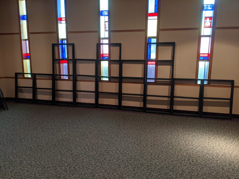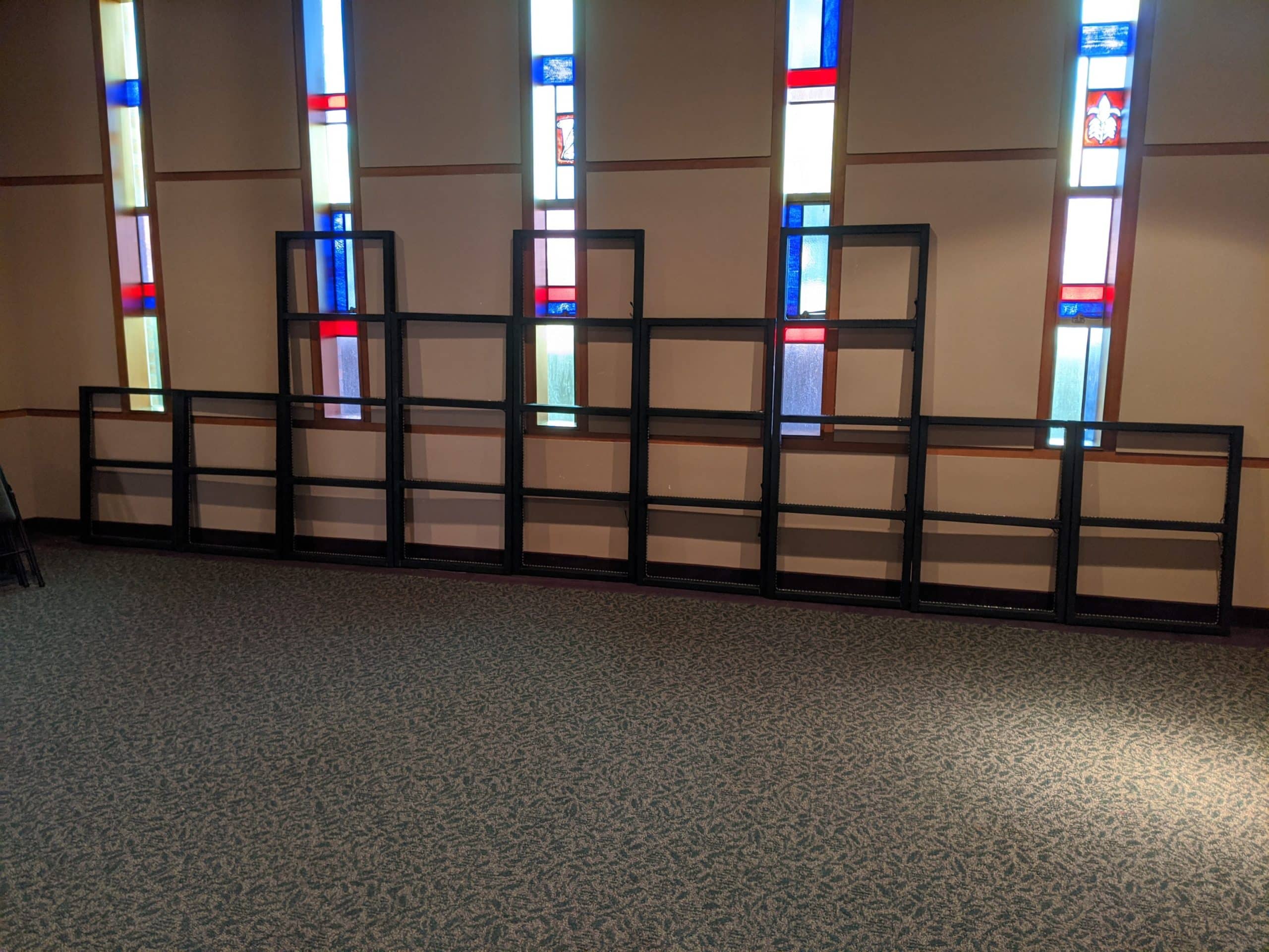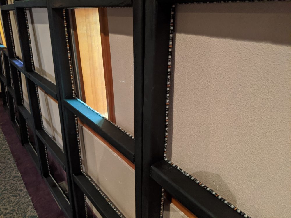 To create this, they build their structure from 2×3 studs, painted them black, then wired LED tape onto them, using DMX 512 decoders and zip ties to attach the LED tape to the structure.