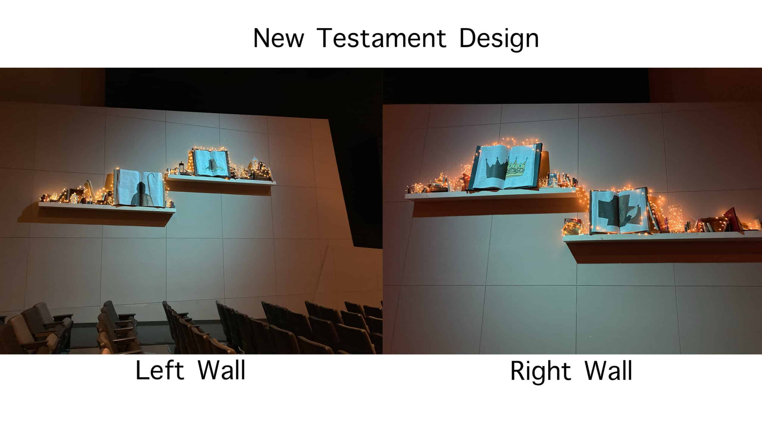 The initial Old Testament design was inspired by Psalm 119, seeking to convey the great value that Scripture has, especially because it is inspired and illuminated by the Spirit himself. The smaller books along the shelves (about $50 from Goodwill) loosely represent the different books of the Bible. The wood crates were used for height differentiation, but really anything leftover from previous stage designs could be used. ($10 at Michaels, and packs of three of different sizes from Amazon for $55). The large books on the shelves were created from styrofoam sheets purchased from Home Depot and cut with a band saw, following a video called “How to Make A Giant Book” on Youtube. (https://www.youtube.com/watch?v=O7XzdXcFJZs) The Scripture on the pages of the large books was typed out in a Photoshop document and printed at FedEx as 24” x 36”architectural prints for about $5 each. The other items on the shelves (lanterns, gold dishes, shiny vases) were meant to depict Scripture being a light to our path and of greater value than silver and gold. These were all purchased from Michaels or At Home. The initial fairy lights were a combination of about 16 20ft or 33ft long strands bought from Amazon and cost around $115 in total. They were battery-powered and remote-controlled. The glass cylindrical vases were left over from a previous stage design but were purchased from Michaels.