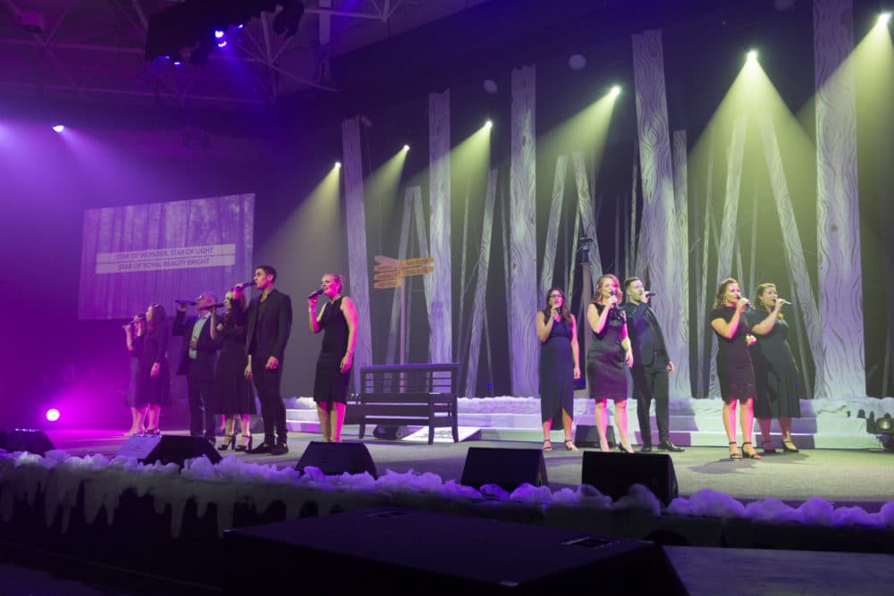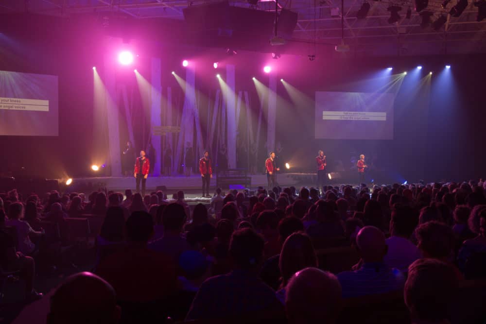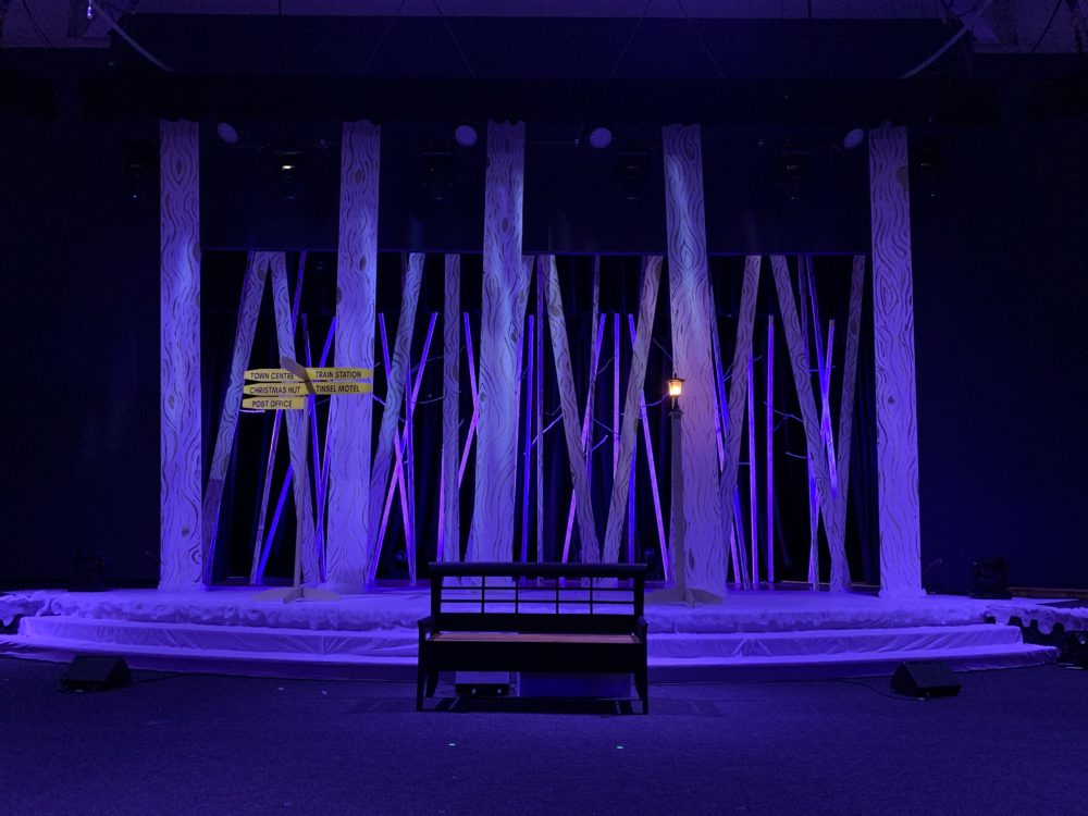 All together the set cost about $900 to pull together with some help from volunteers. It ended up being an extremely effective design aiding our White Christmas Carols drama story and giving a fresh look to our stage for the Christmas season.