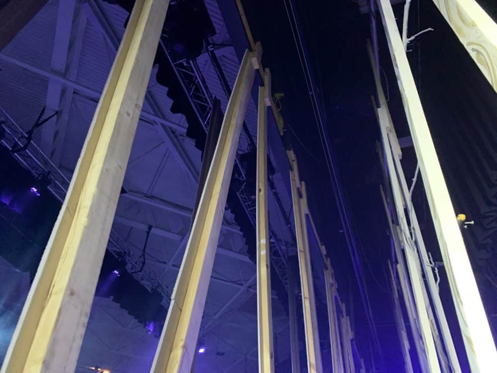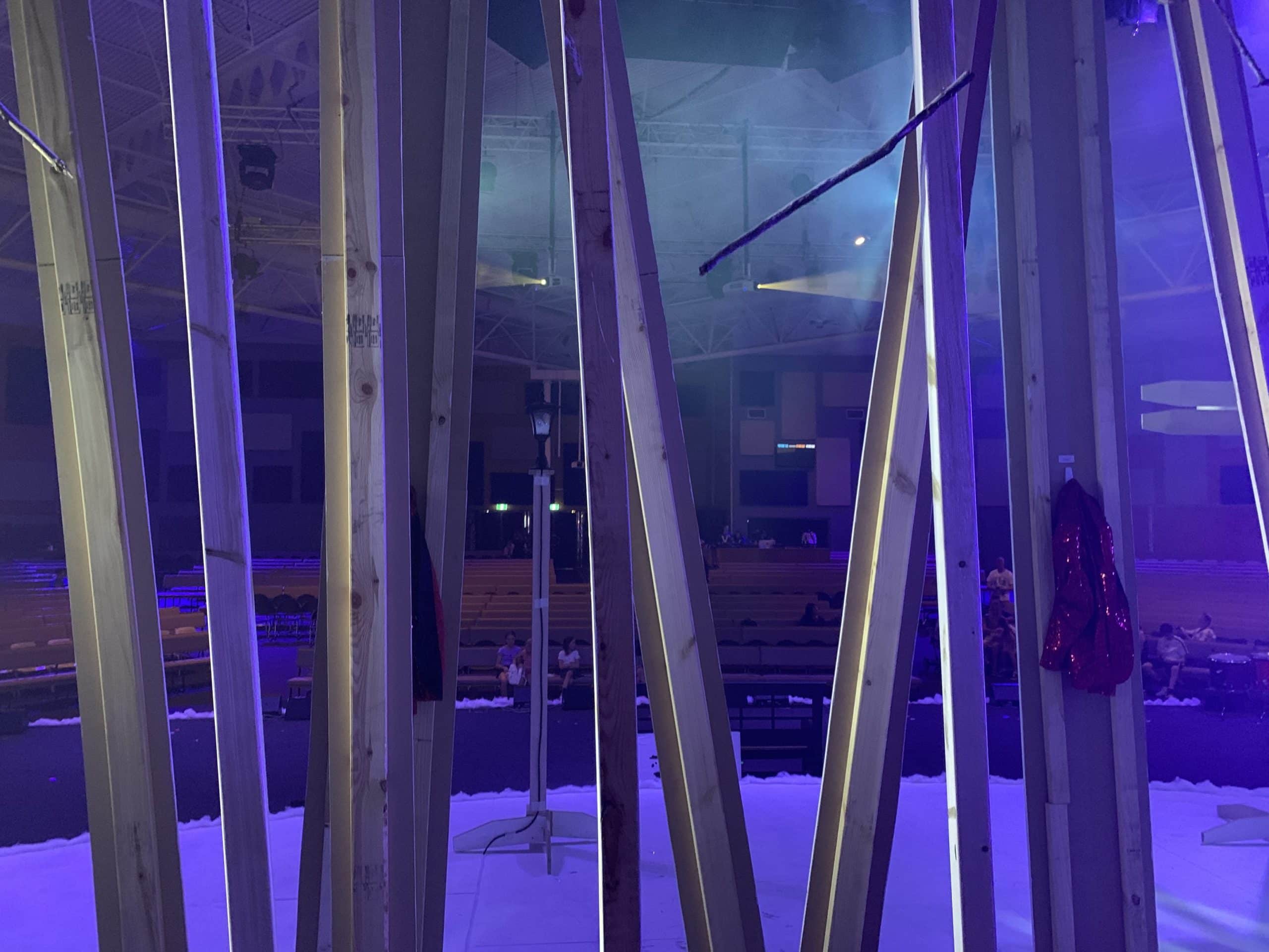 It was a simple construction with 6m lengths of pine attached to the roof and lighting poles above our stage at different angles much like the way a group of trees would grow in slightly different directions. The front row of trees was covered with 600mm wide MDF sheeting, the second row of trees was covered with 300mm wide MDF sheeting and then the trees in the last few rows were kept bare as 70mm wide lengths of pine.