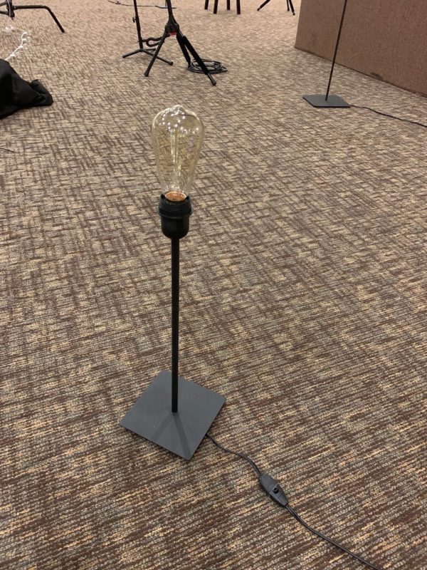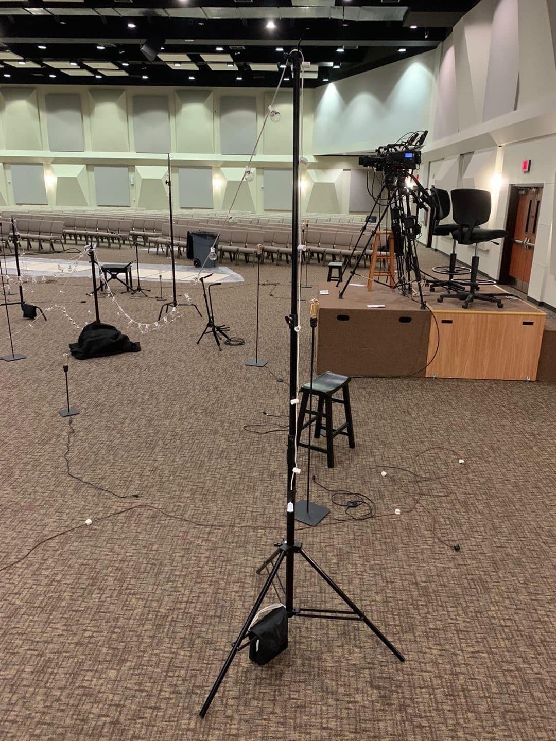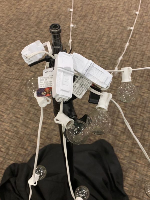 They used one 8ft pole in the center and 6 poles around the outer edges. They used zip ties to secure the lights to the top of each pole. Most of the poles/stands were borrowed from their video department. Each channel controlled two strands of light. They ran three strands to the DMX controller and then each of those strands connected to another strand in the middle. They measured from the center pole to each outer pole to make sure they were close to the same distance, but they didn’t stress about how evenly things were spread. They also use straight lamp stands with Edison bulbs to add light and they liked the way they looked in the shots.