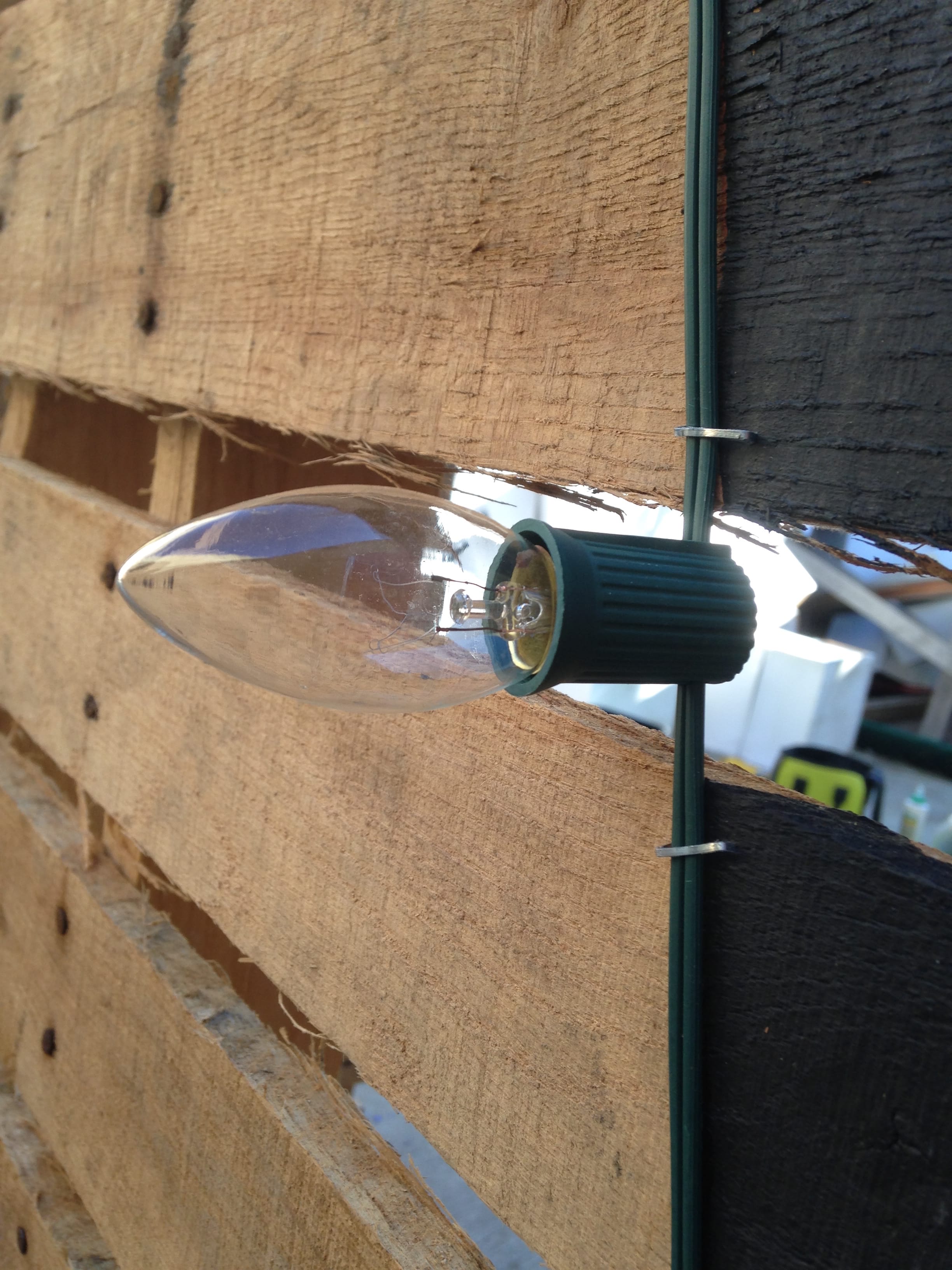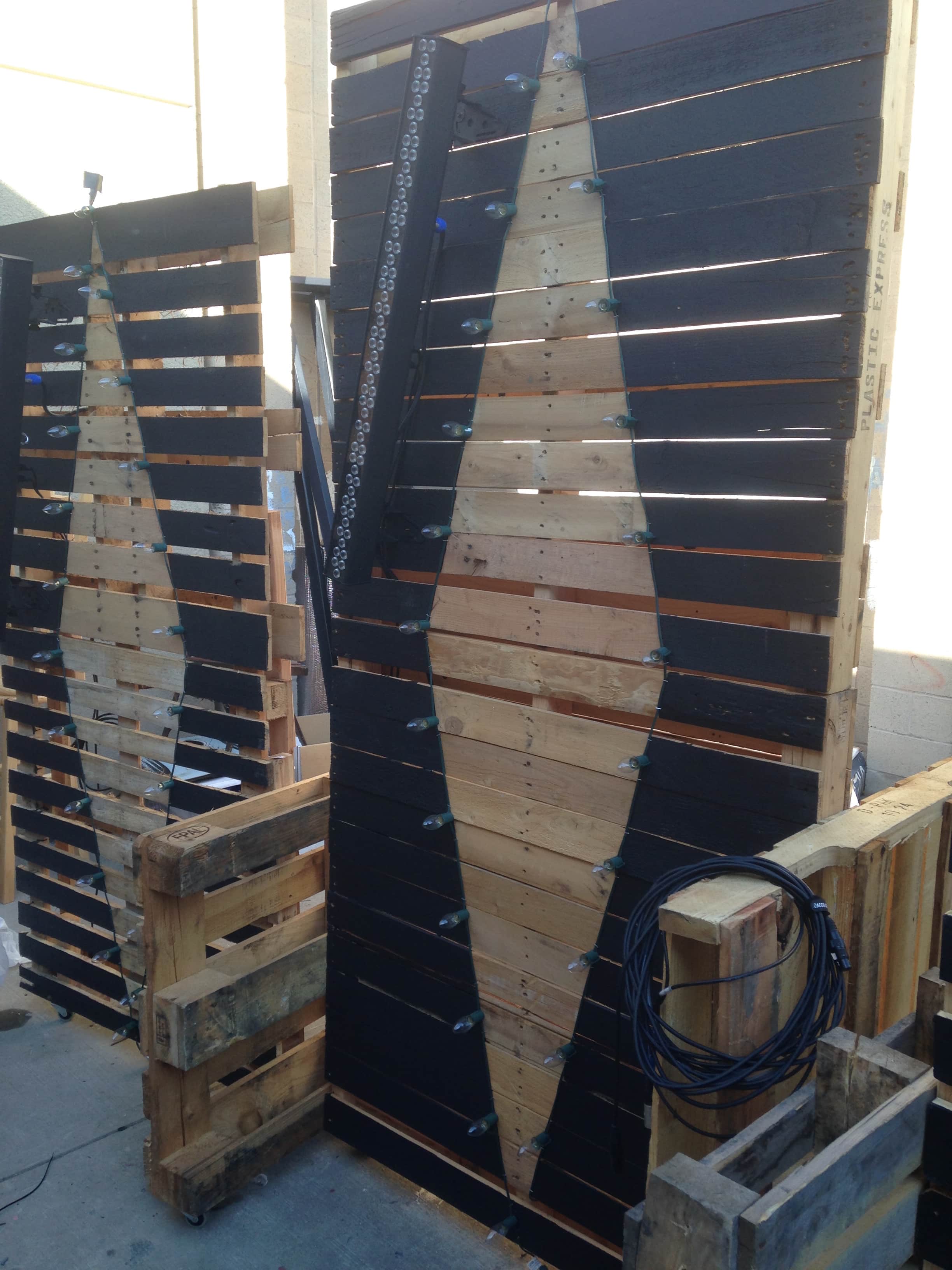 After the paint dried, they stapled Christmas lights along the outside of the shape. The Christmas lights were attached to cheap dimmers so they could control them with their lighting software. Then the panels were stood up and an extra pallet screwed to the side to make a leg that would hold the panel upright. 3 rolling casters were added so they could roll easily.