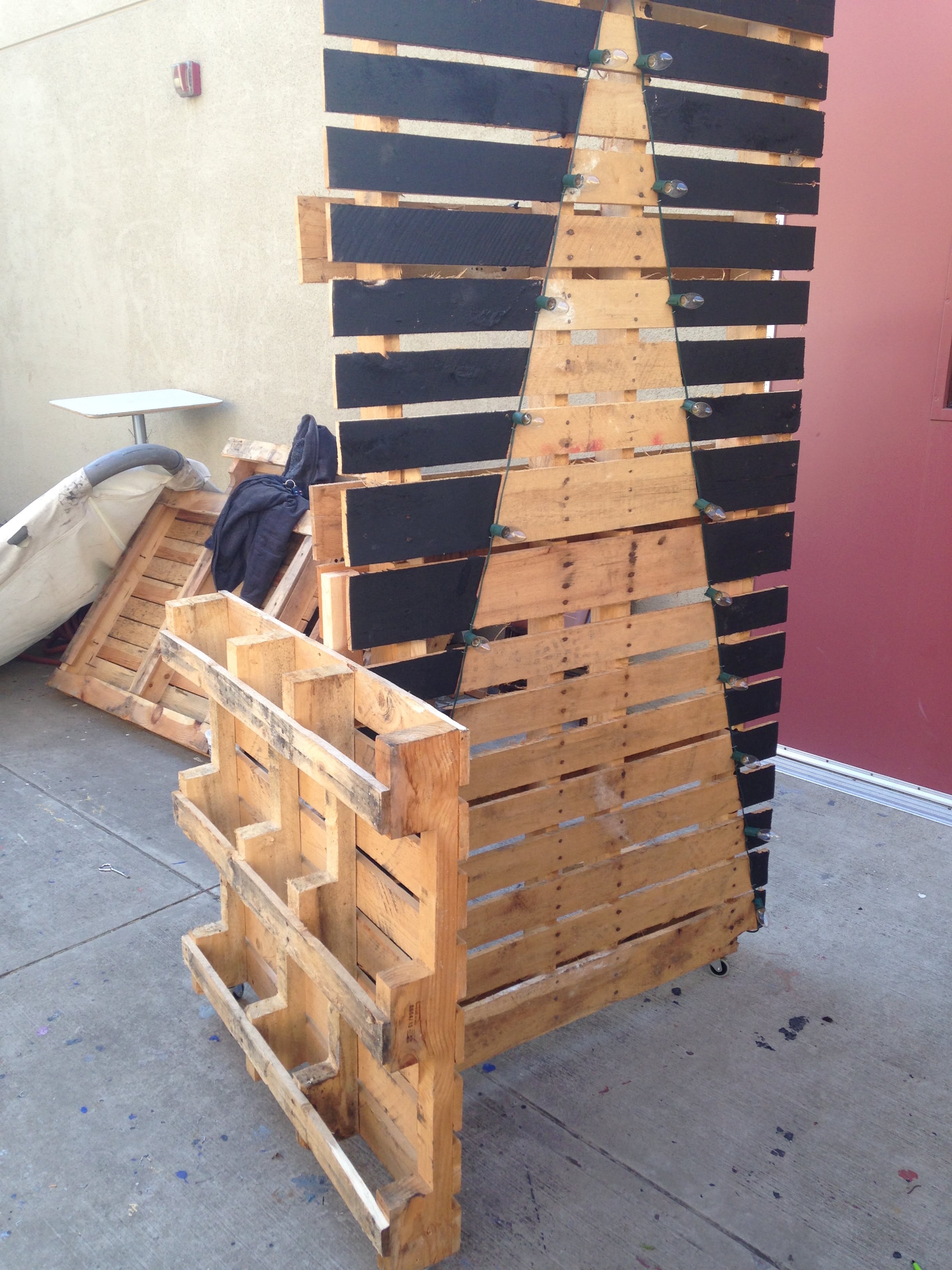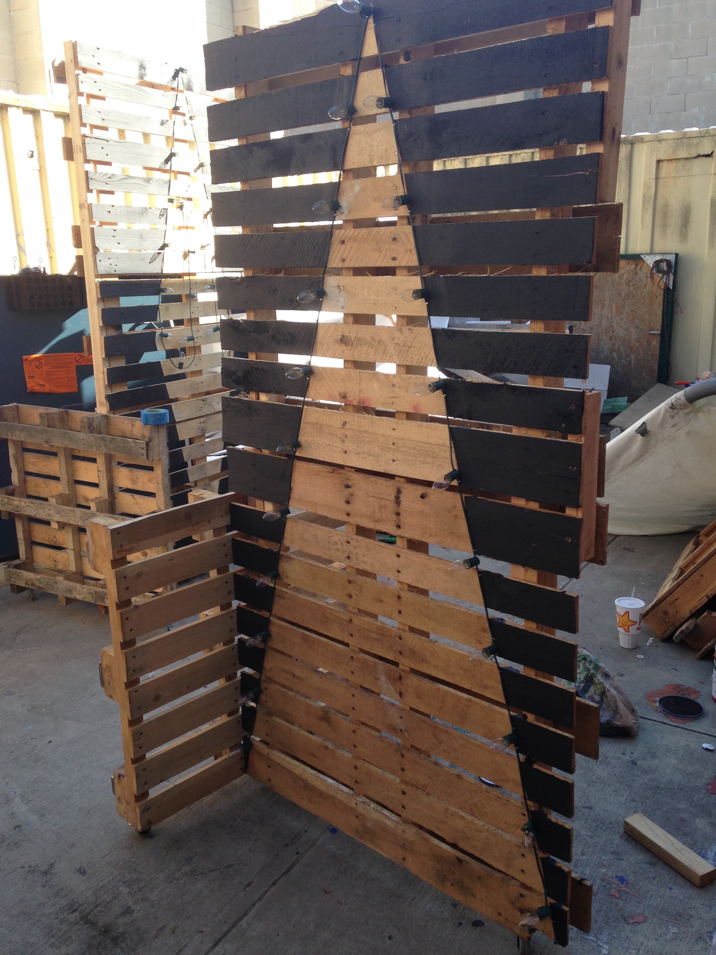 They contacted a local rock company who had plenty of pallets they were happy to let them take for free. They laid them out until they made panels that were 7′ or more tall and spliced them together with small pieces of 2×4 on the back. Once that was done, they snapped chalk lines and painted out the negative space in black, leaving their Christmas tree shape in the natural wood.