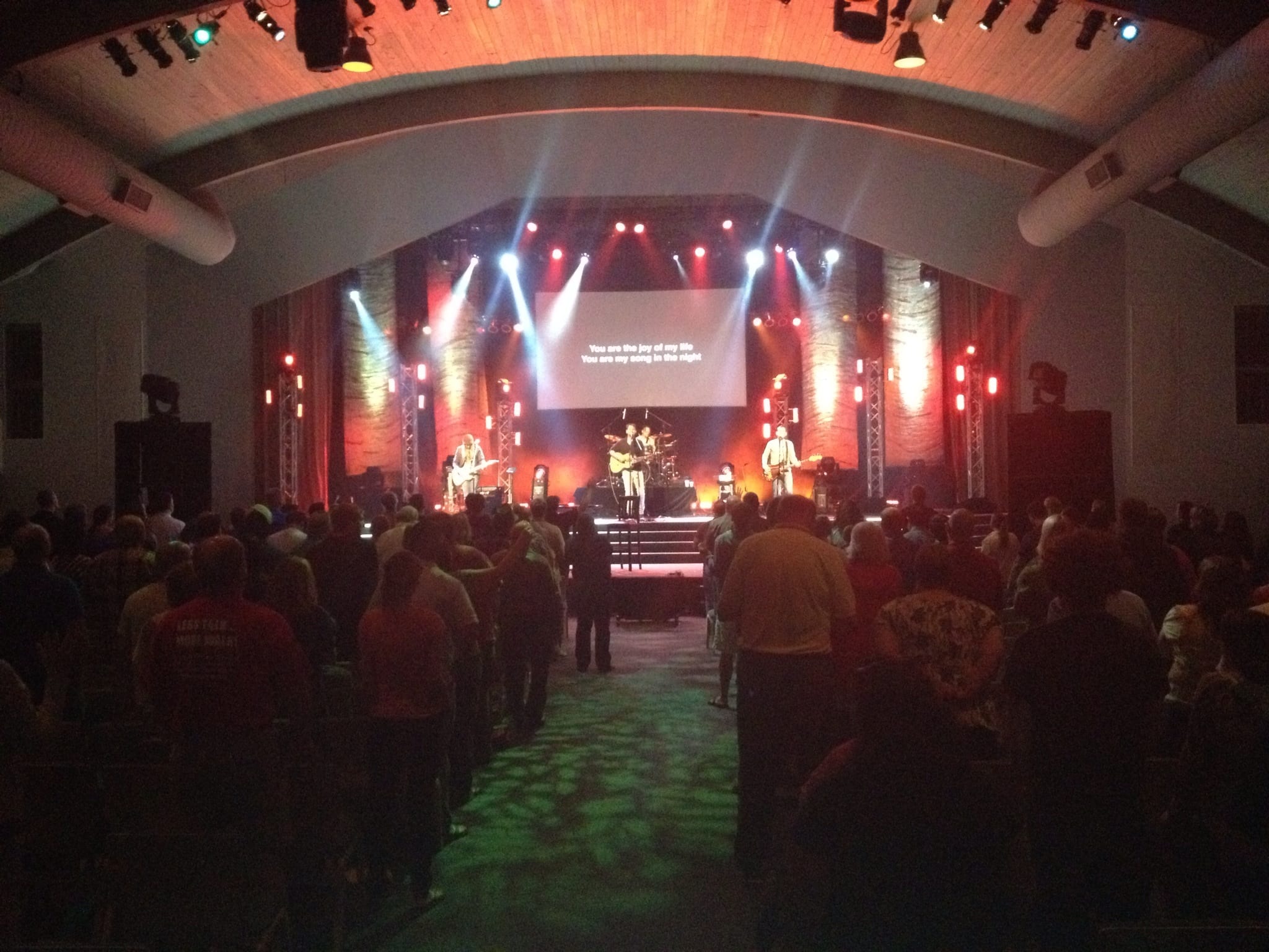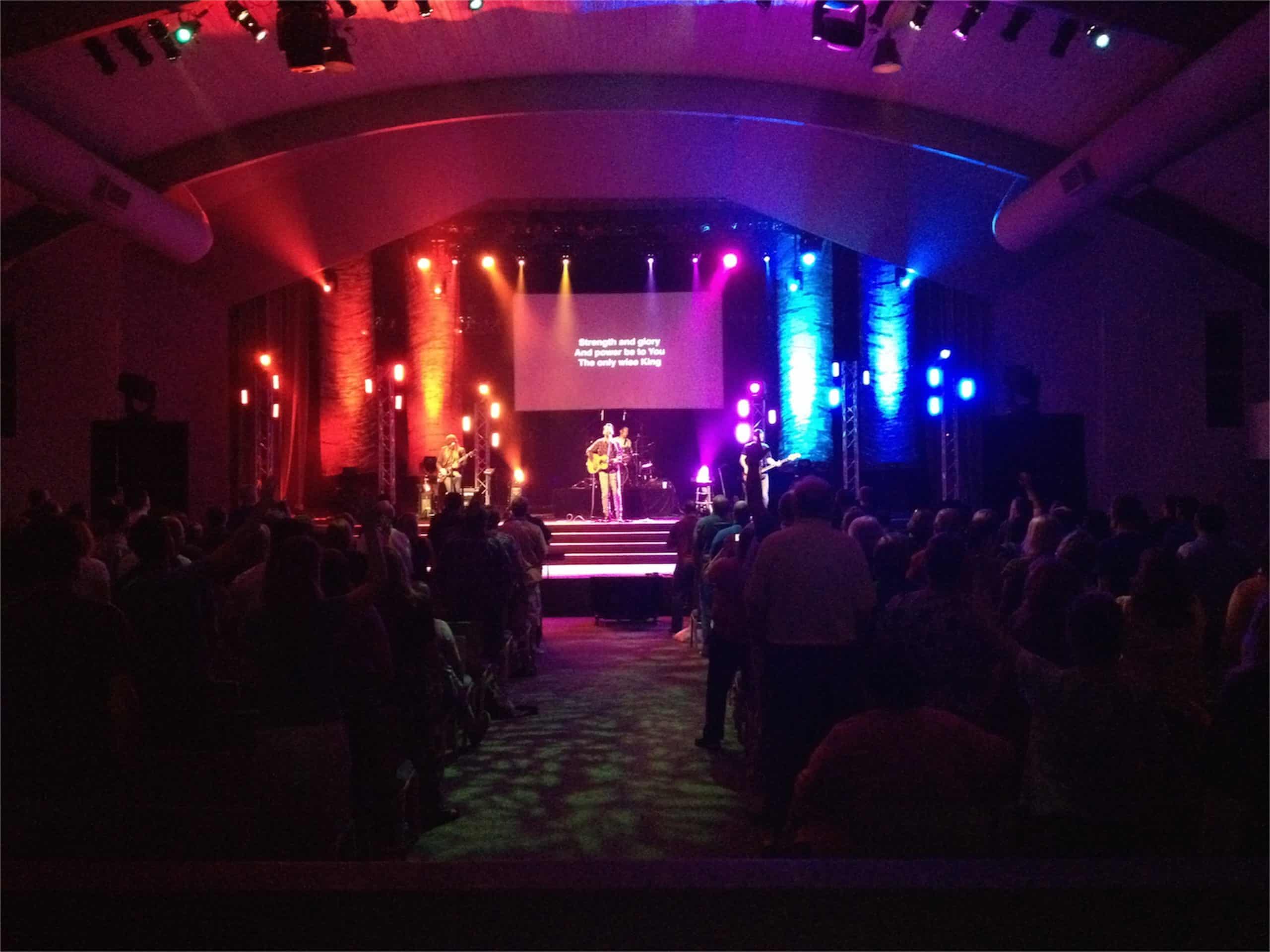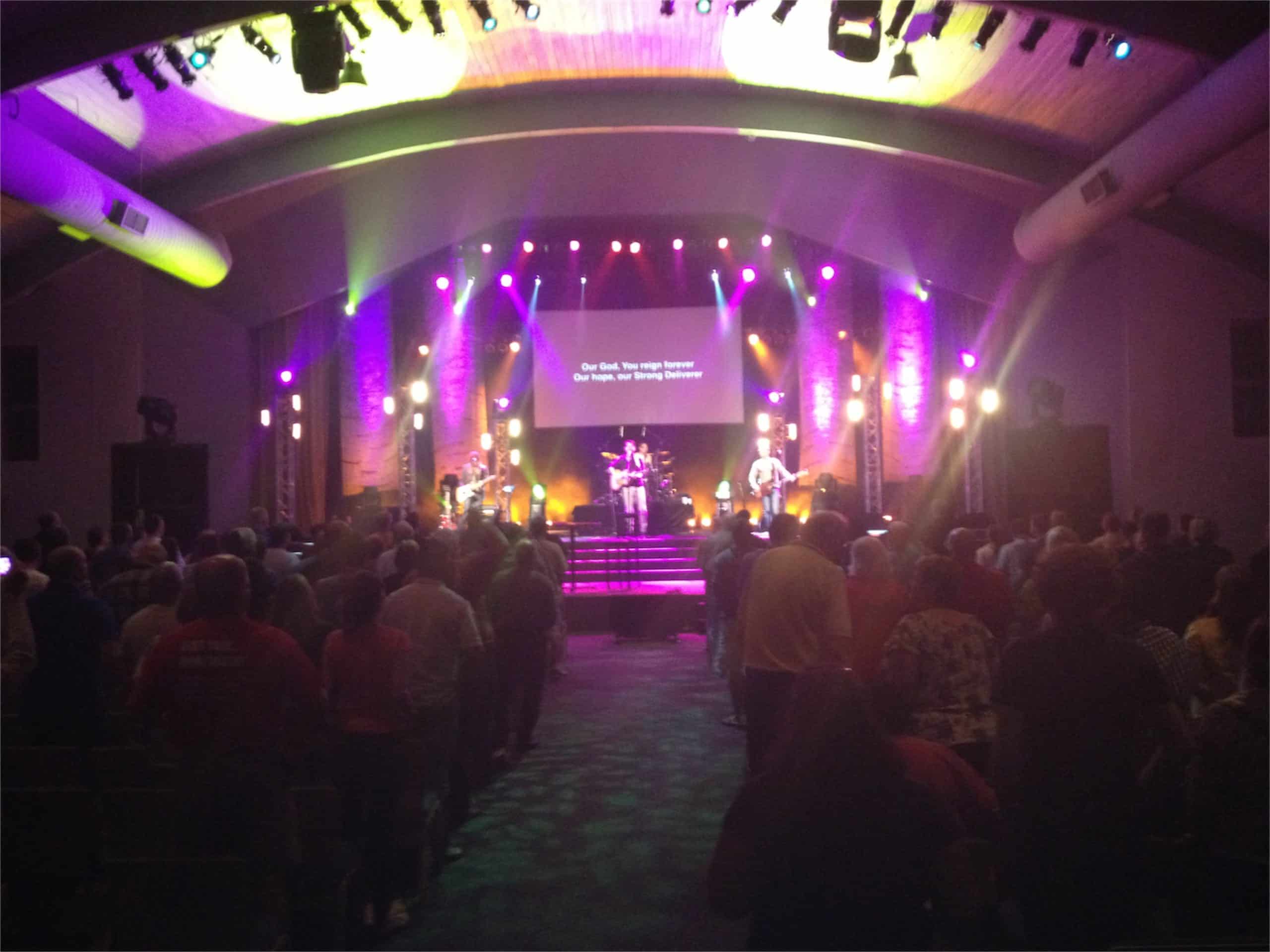 Their paint rags set was built for the 2012 Youth Specialties conference at Northland. Their goal was to create a set that could look great when lit, but disappear when they wanted to rely on their lighting setup. They were really inspired by the similar weed block sets from Cameron Ware and Derek Studt. They wanted something with a bit more texture though, so they decided to use multiple colors of paint. Another goal was to make this set quickly. The method they used, though, was almost completely the opposite of quick.