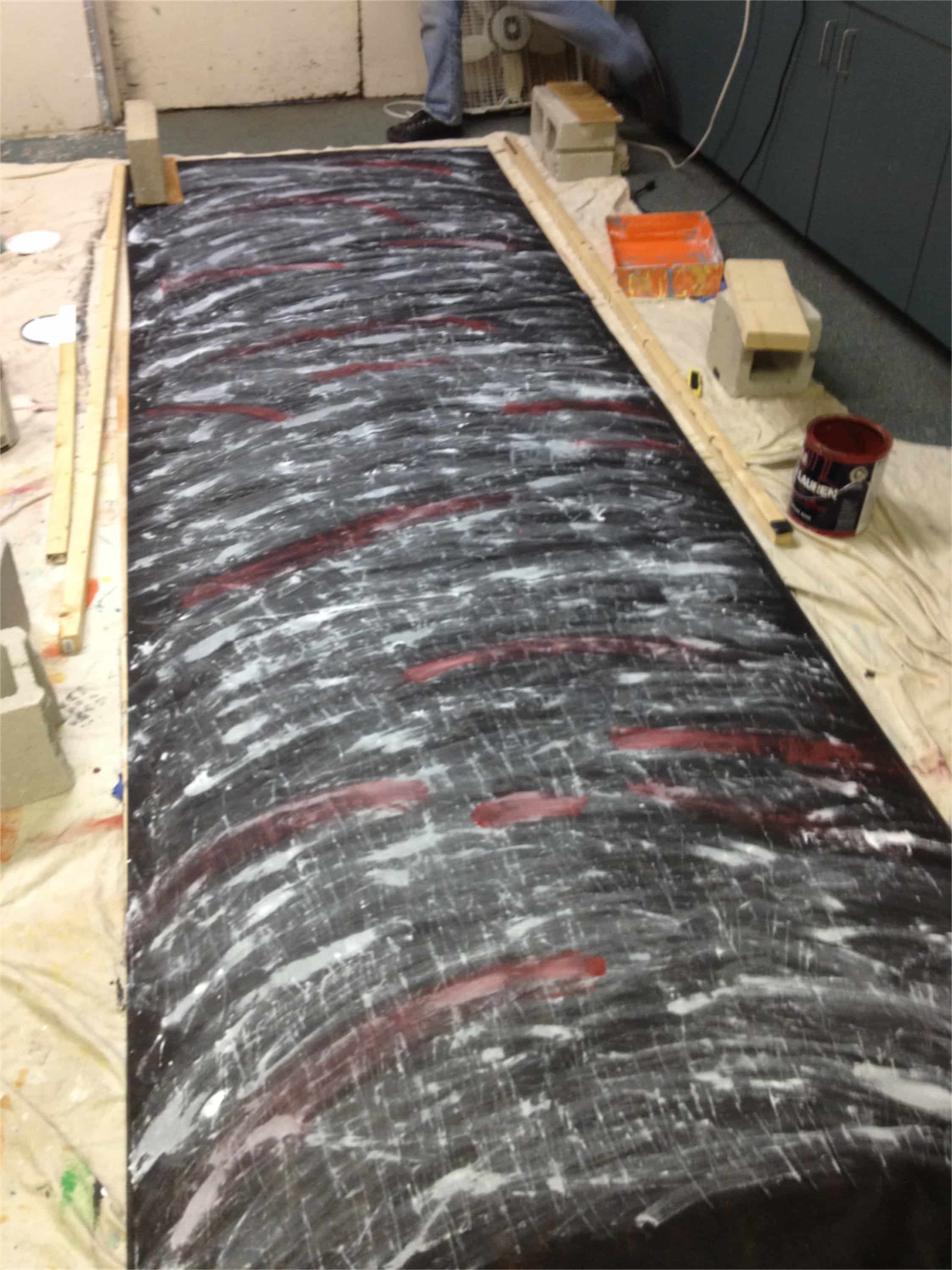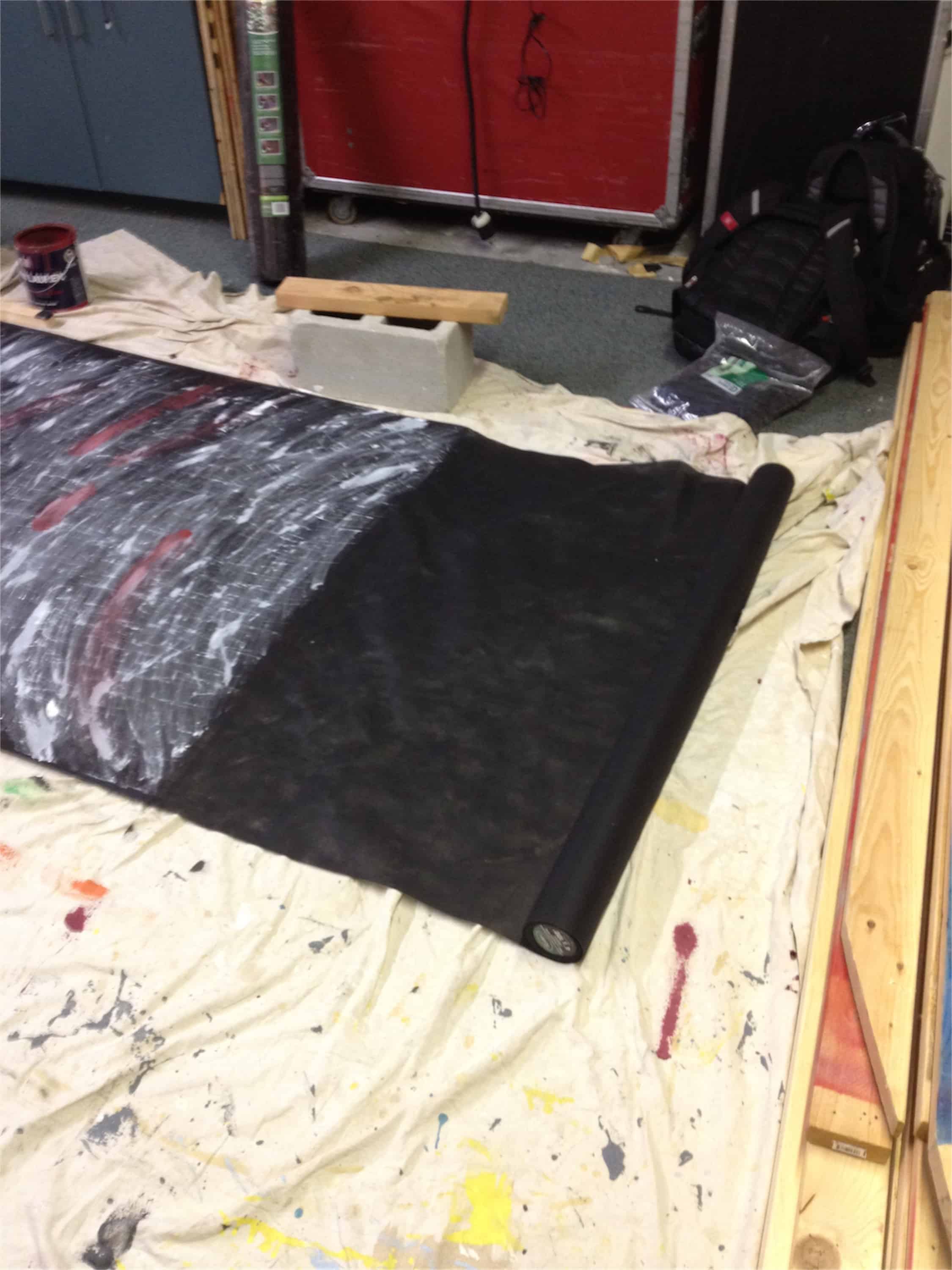 They used 25’ rolls of black weed block from Home Depot. They used white, grey, and red paint to smear on the weed block with rags. They applied the paint in a curved pattern which also made it easy to apply. This gave the fabric some awesome life and texture. They found that the paint significantly bleed through the weed block, so they used plywood behind the sections they were painting. Also if they allowed the painted weed block to dry on the plywood, it made it impossible to remove. They stretched out the weed block and weighted down the corners with Cinder Blocks.
