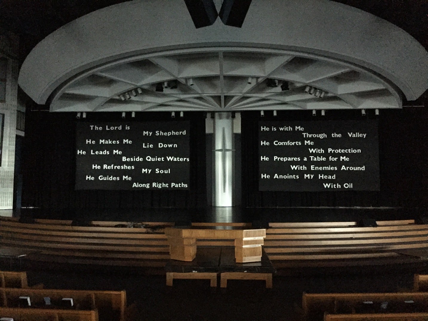 From Kris: Psalm 23 was an eight-week message series. What to do with an 80 ft wide stage for an eight-week series on Psalm 23?! Searching for ideas, but knowing I did not want sheep on the stage, I came across Words Words Words. Now, our final result looks nothing like words, words, words but the final result is also nowhere near where I started. I started with different scripts for different parts of the scripture and had the full scripture planned. After talking with our lead pastor we decided on fewer but powerful words.