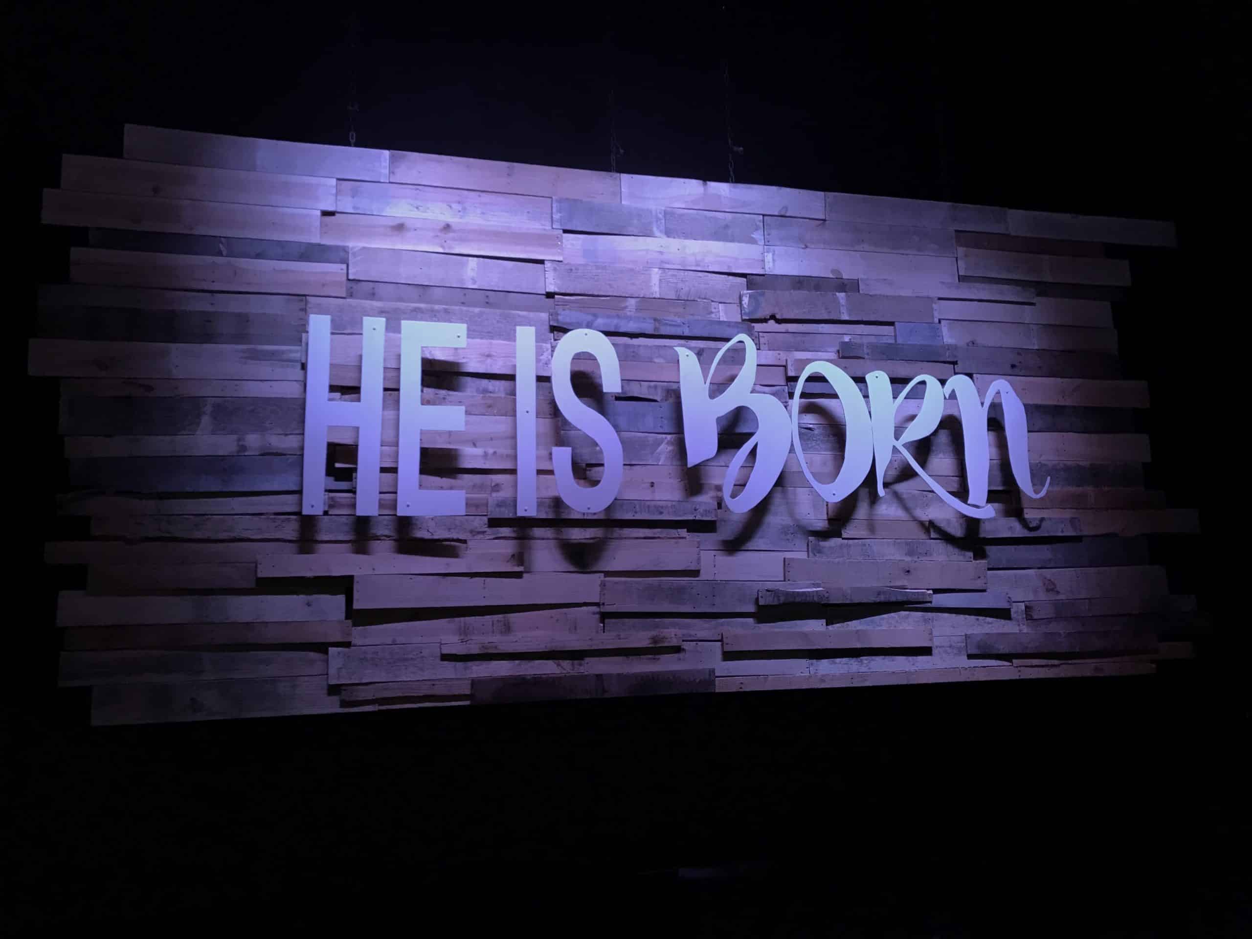 For Christmas this year, they wanted to use their pallets from Pallet City. They disassembled all their pallets and built a 16′ by 8′ sign and hung it 6′ above the stage. Their Christmas theme was based on the phrase “He is Born” so they cut the logo out and suspended it from the sign in white letters.