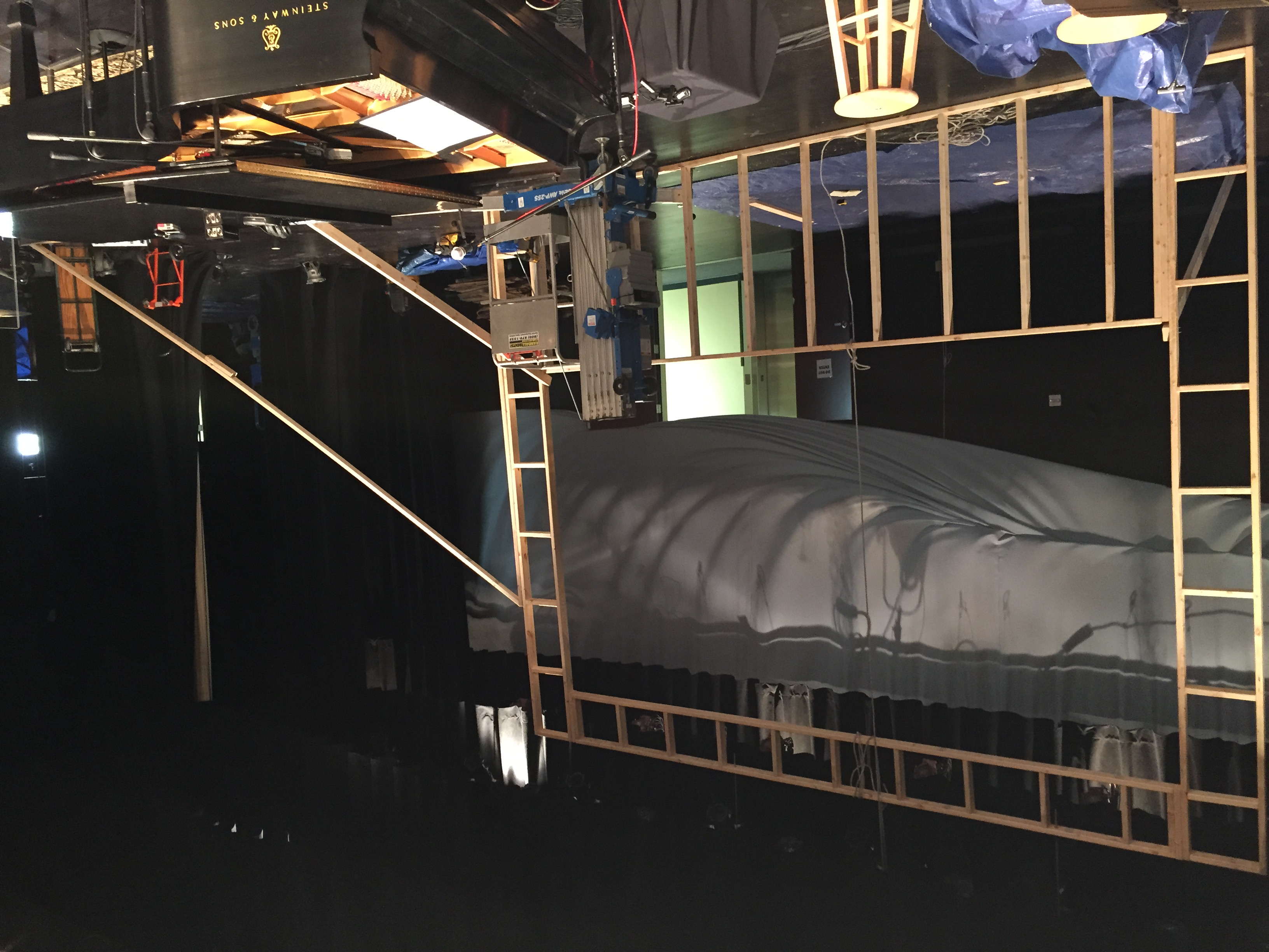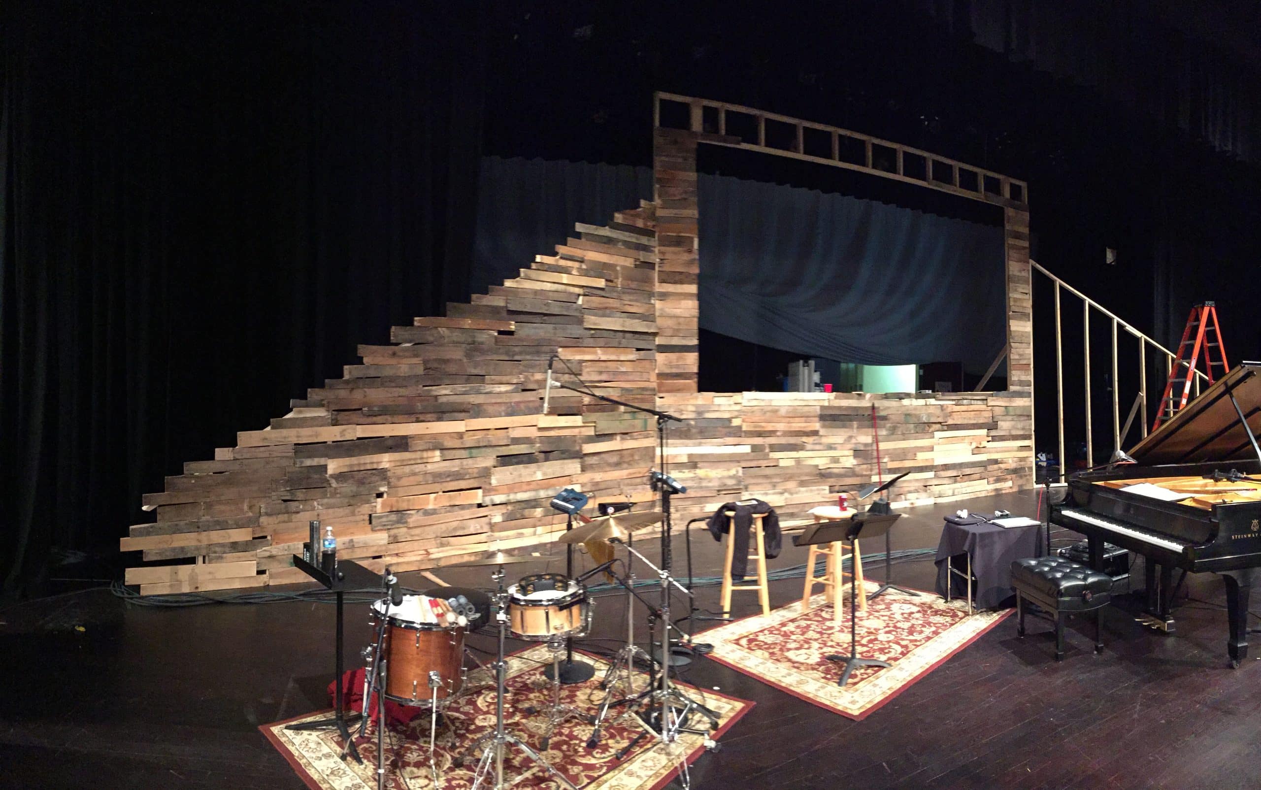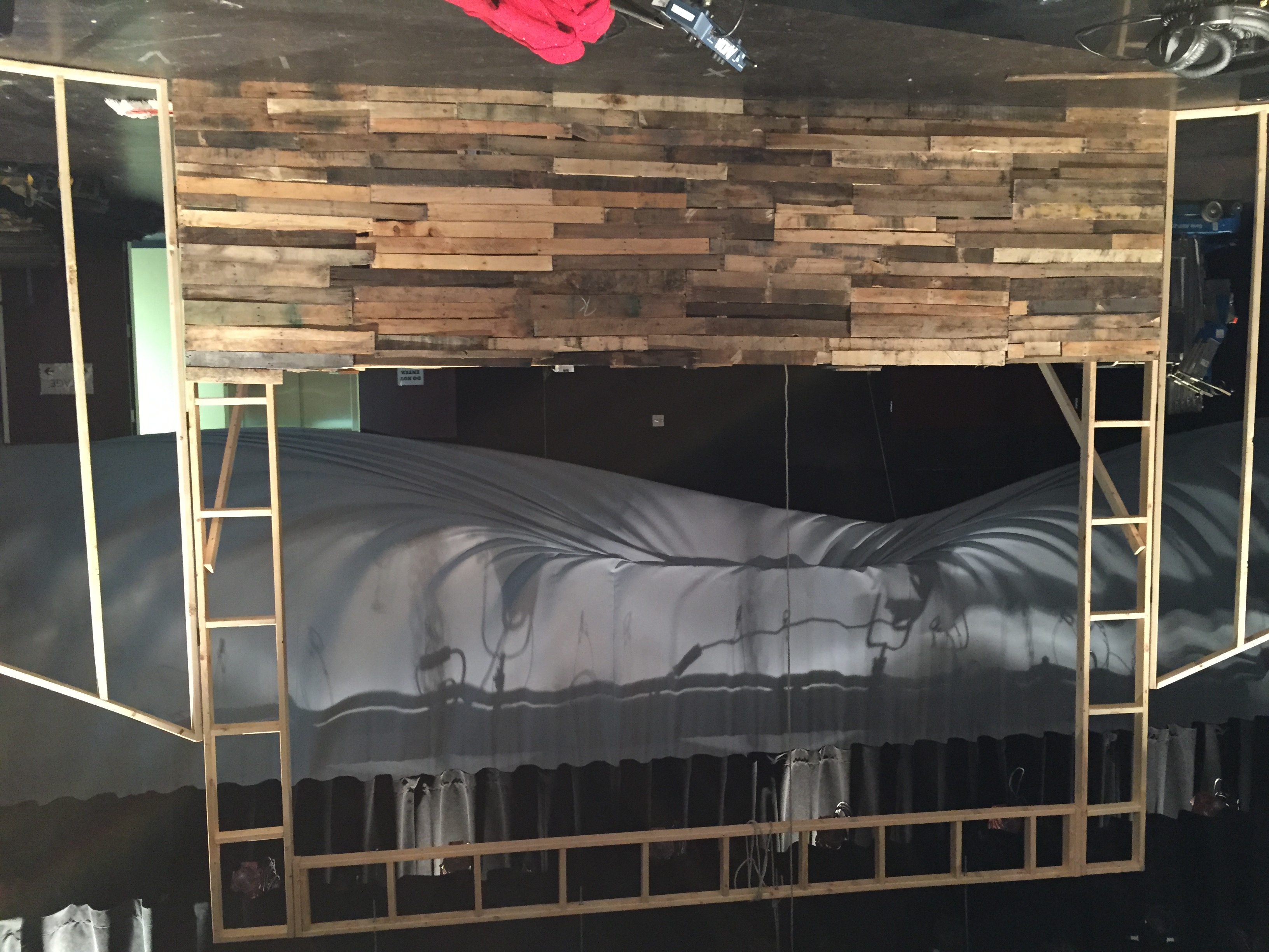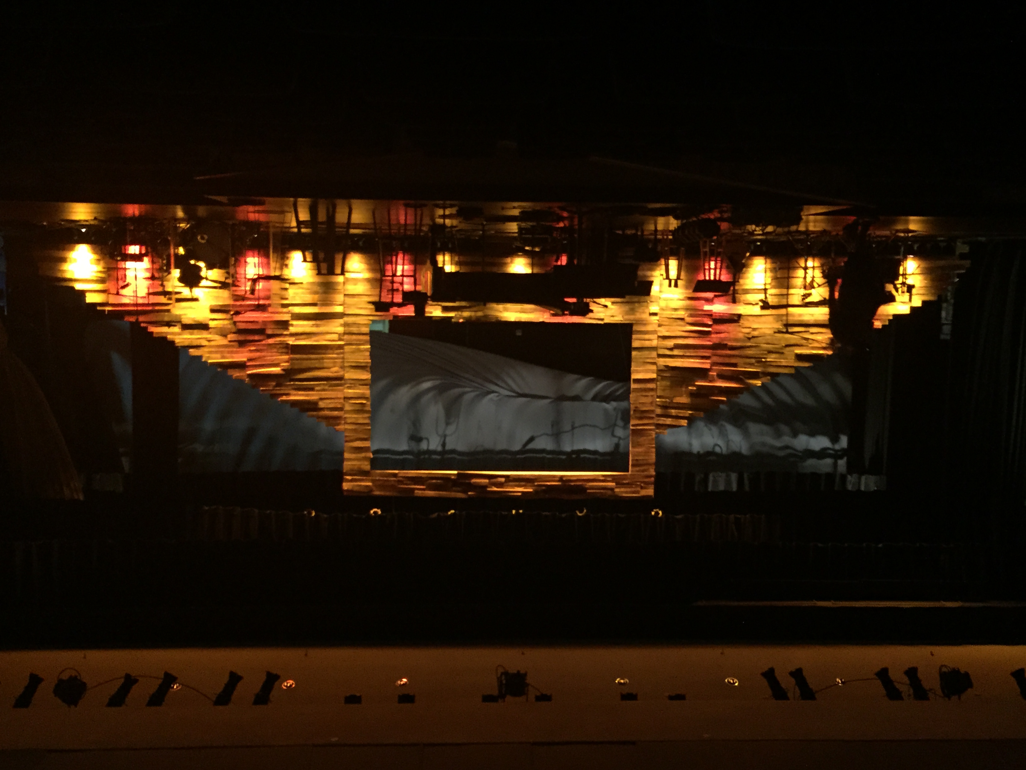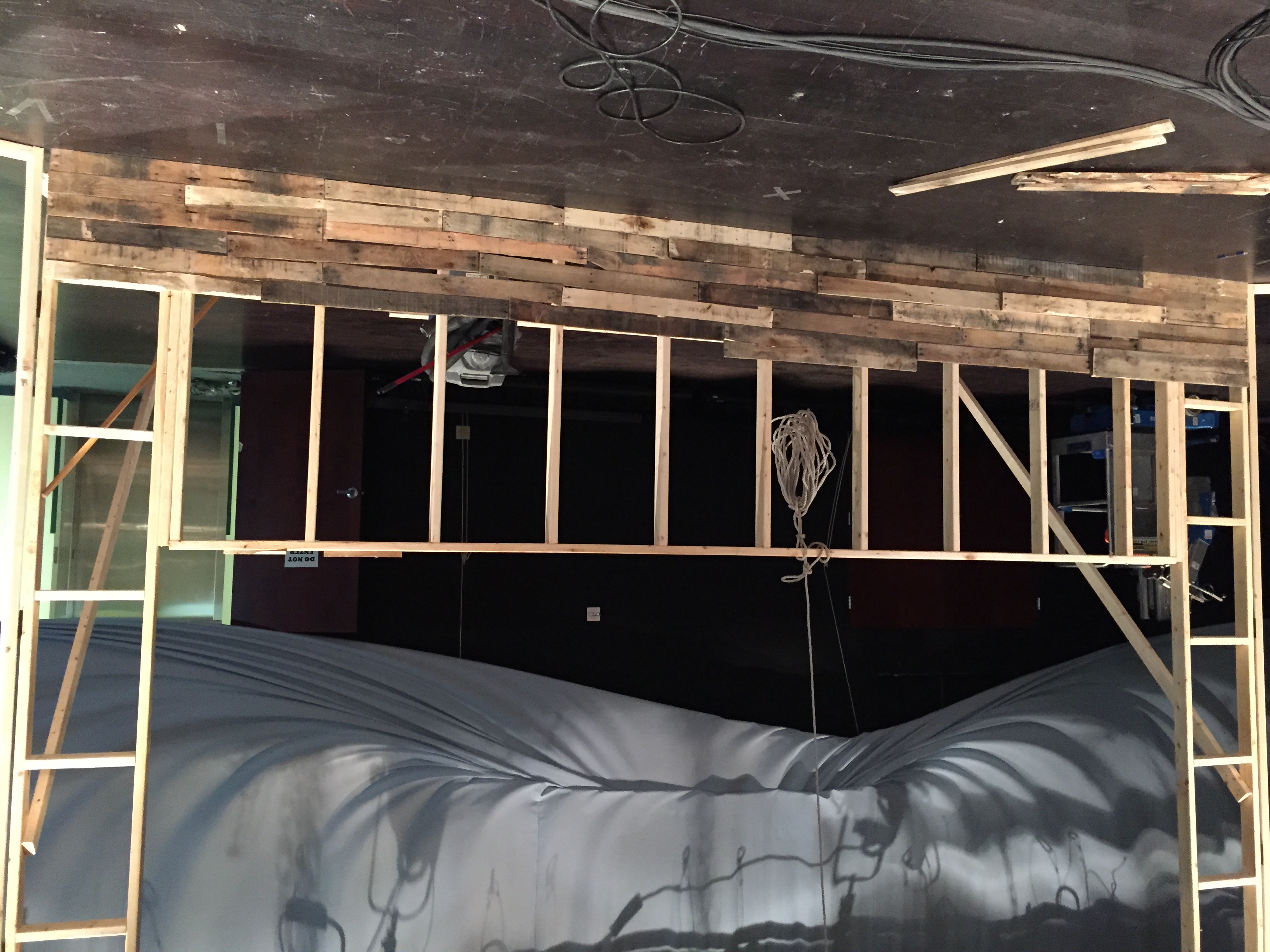 Jayme pulled inspiration for looking at a natural stone wall. They got about 30 pallets and sawed the slats off the top and bottom of them all. As for the building of the structure, they used a standard 2×4 and spaced them so that they could stagger the rows of pallets and still have 2 points to nail to. The center section was designed to hold a 16ft x 9ft screen that they rented in and rear projected onto. They used an air gun and some finishing nails to adhere the pallets to the structure. They uplit it with 6 SourceFour Multipar strips. Along the top of the frame they used 15 ColorBlaze 48 LED strips.