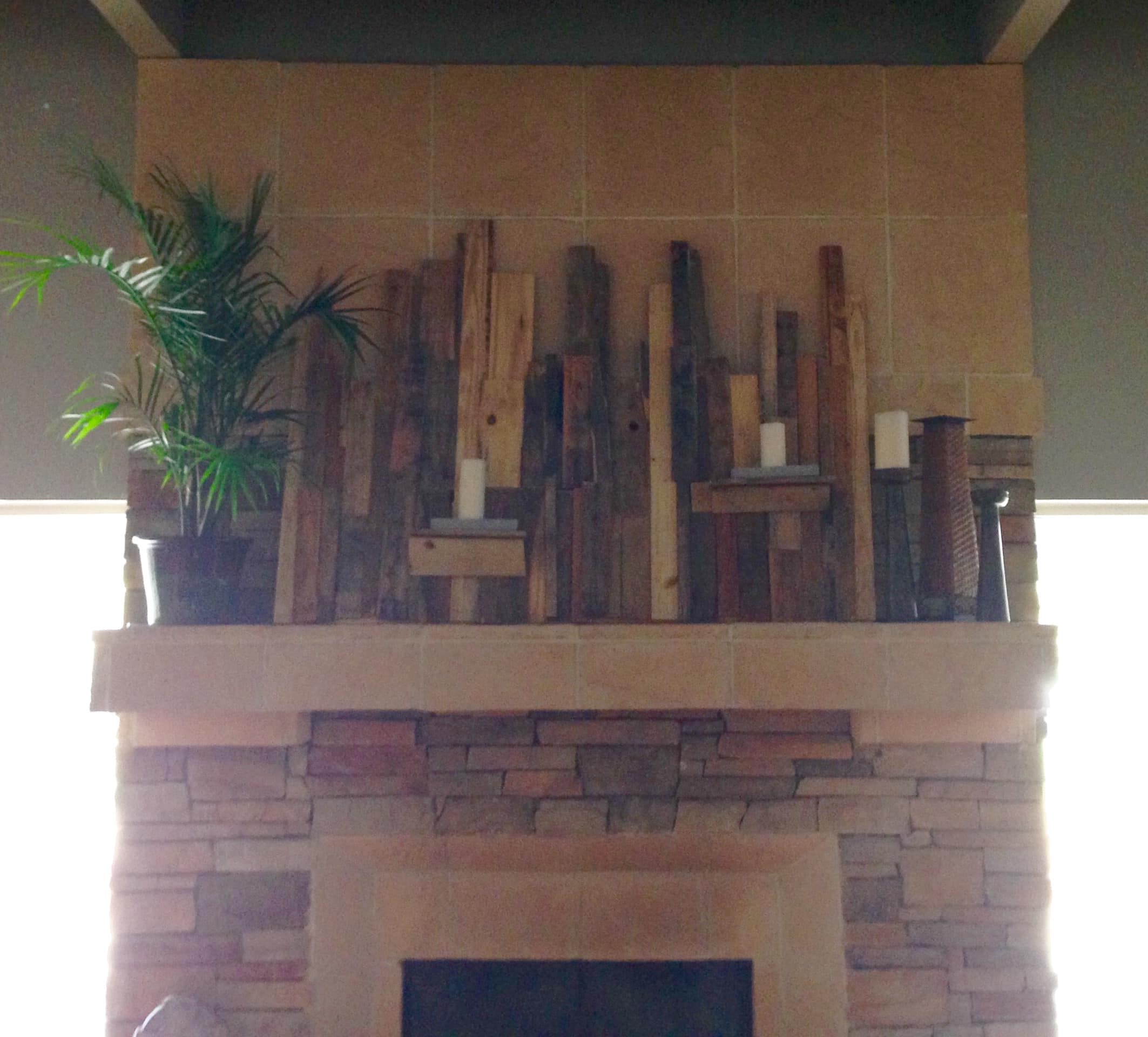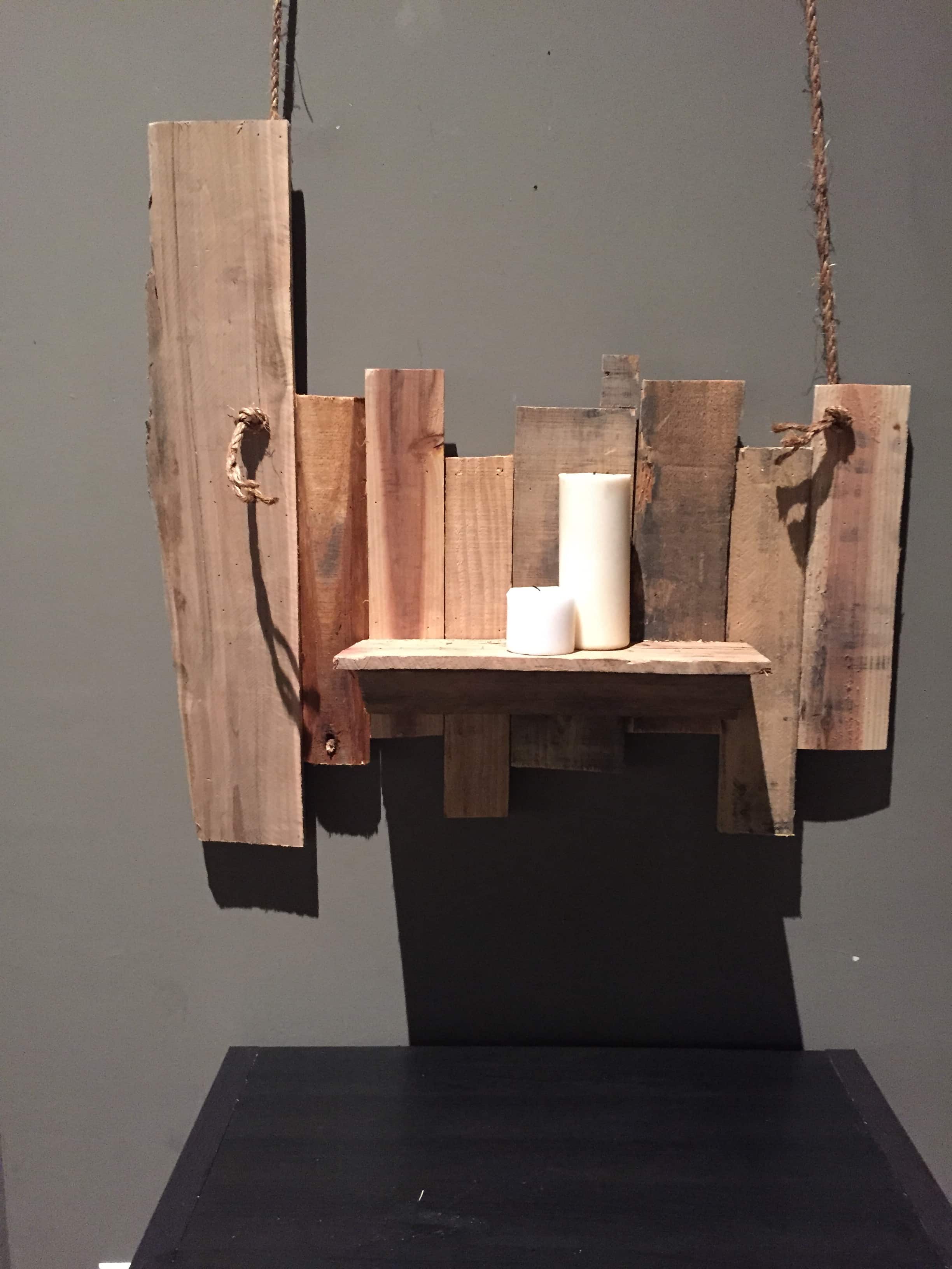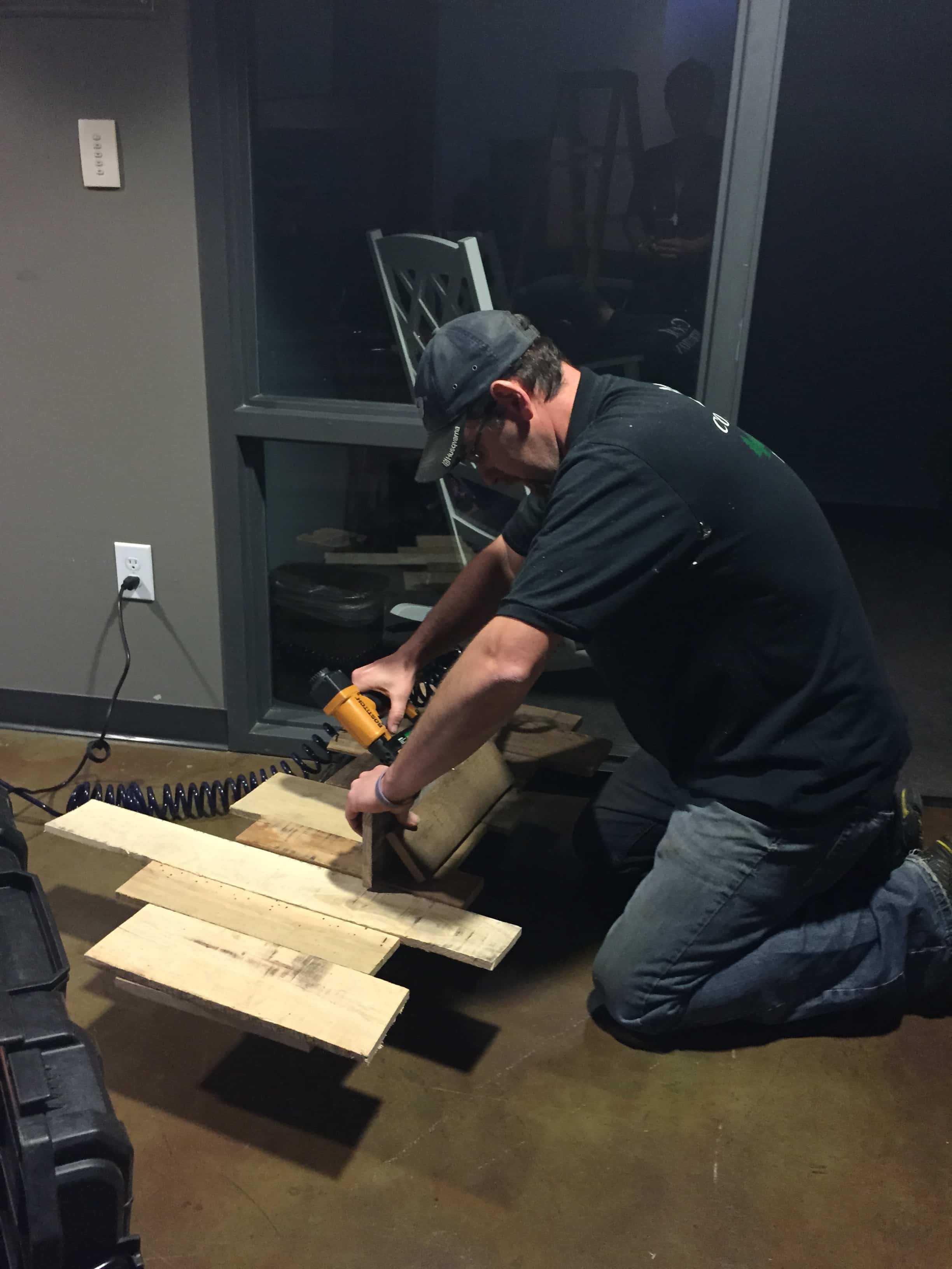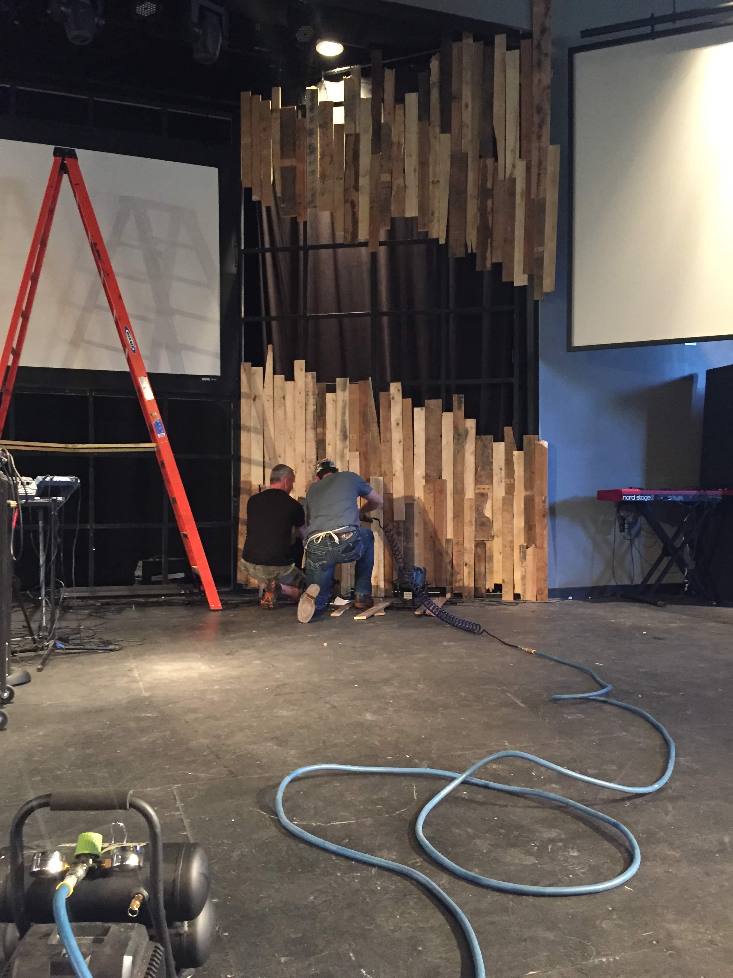 Their building dudes cut all the pallets apart and since they were going after a more irregular look, they randomly assigned them a home and used a nail gun to attach the pallet pieces to the stage grid (see below for more on the grid). They sandwiched the edison bulbs between the two levels of pallet wood and that was that. They usually try to take their set design a bit further than the stage: At the four prayer stations they had in the worship center and into the lobby over the fireplace.