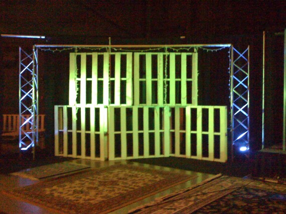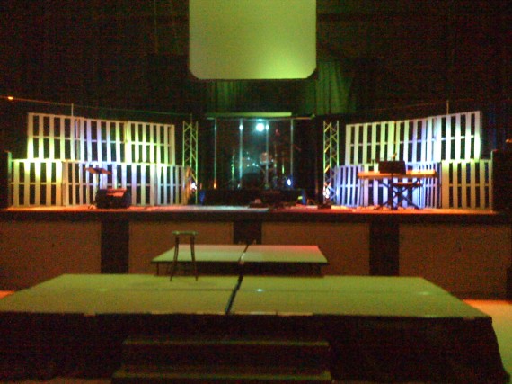 This stage was created using free wood pallets painted white, lit with LEDs. Blake wove them and screwed them together to get the height he needed. (You can get your own wood pallets for free/cheap from your local hardware store. Just ask!)