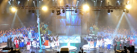 The idea of the musical was that some modern day characters got sent back to the time of the prophets: Micah, Jeremiah and Isaiah. The modern day characters were walking on a catwalk behind the choir, through the sets projected onto acrylic screens that were in different shapes and sizes. Projection allowed them to swap around the sets without having to change out physical pieces.
