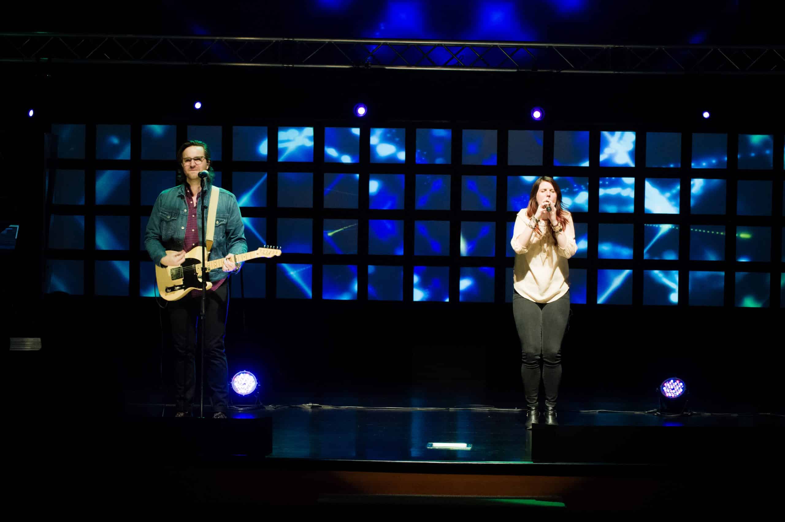 They used an MVD20X 6-output multi-viewer that allowed them to use 4 outputs from a single computer, much like the Matrox Dual/TripleHead2Go gives you 2/3 outputs. This allowed them to connect the three ultra short throw projectors as well as their main projectors and control the video visuals on all of the screens in the sanctuary from on computer. They were using Arkaos GrandVJ XT to control the visuals.