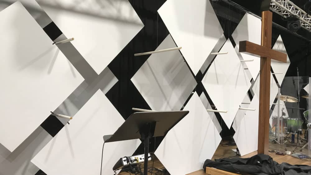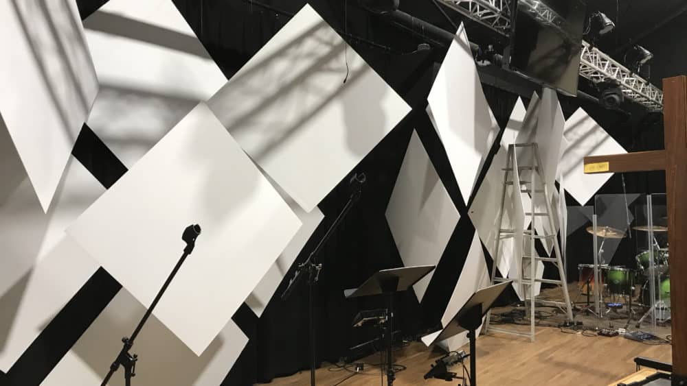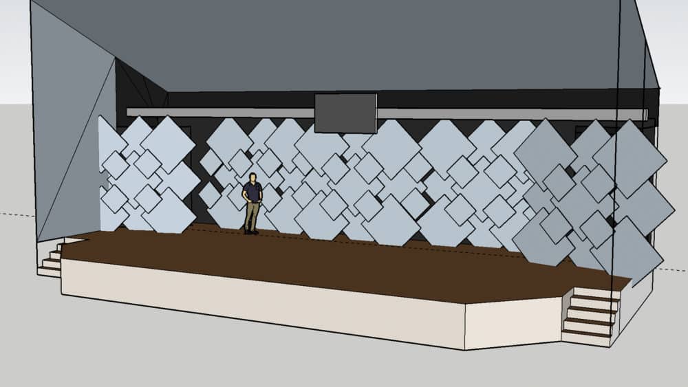 He cut the 4’x8′ corrugated sheets in half for the larger squares and in quarters for the small squares. He hung the back layer of squares based on measurements, then just eyed the next layer on top of that. To stabilize everything, he got the corner of the bottom squares so that it could be folded back and taped to the stage as an anchor. He tied the corners of the upper squares to the anchor which kept them all straight.