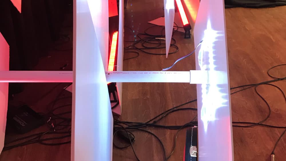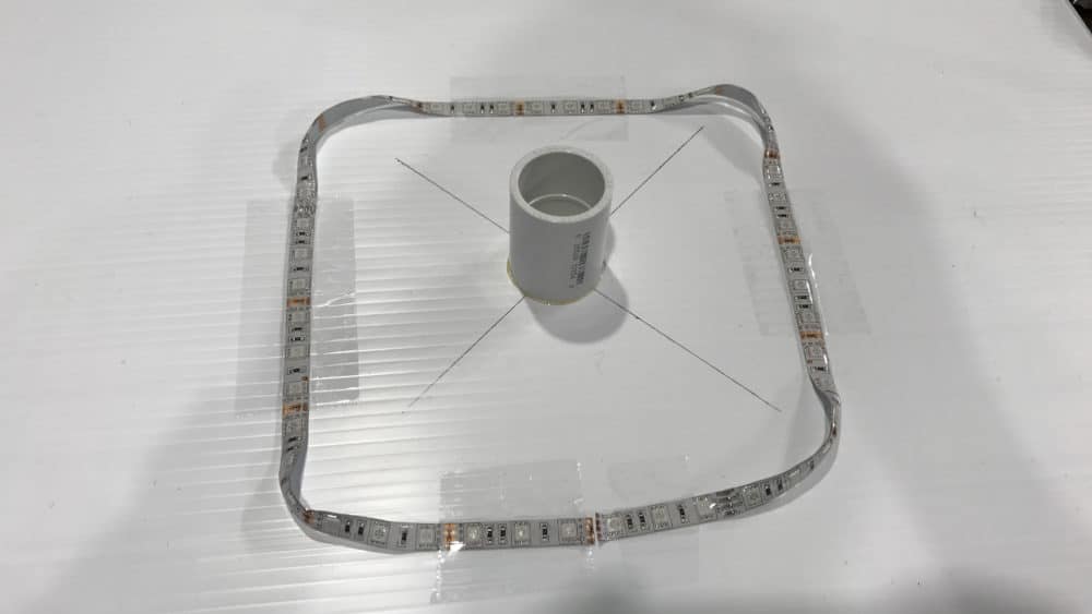 He used PVC pipe to run the wire and hold the small squares with LED strips attached to them. He didn’t want to have to solder the corners together or spend money on corner clips, so he just bent the corners out.