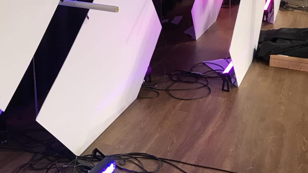 This was made with Coroplast sheets, fishing line, LED strips and LED bars. There were 8 LED bars on the back layer and LED strips on the smaller squares lighting the middle layer.