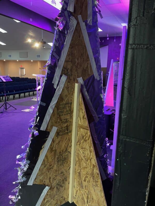 They started by building triangular trees out of 4×8 sheets of plywood. They used a wedge at the back to stand them up. Then they covered them with different materials, including a smooth brown wall panel.