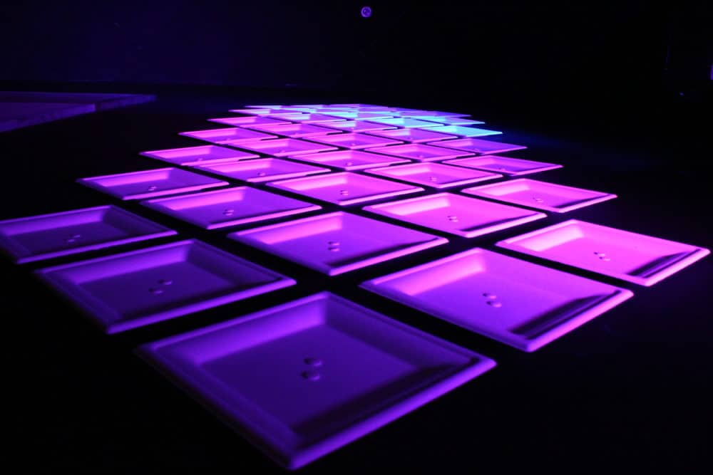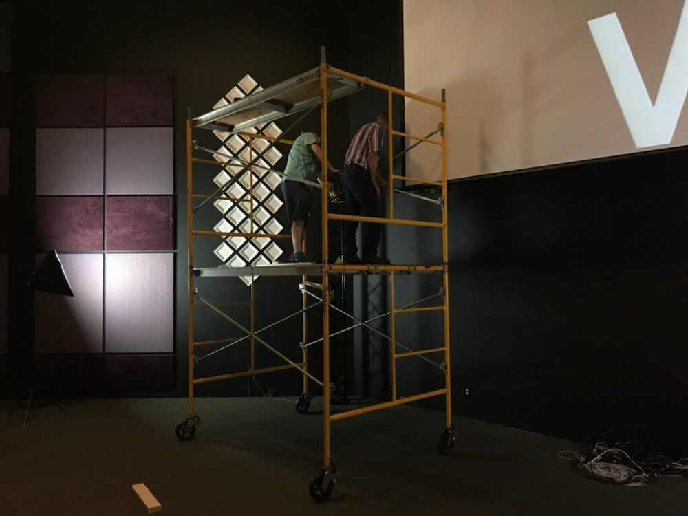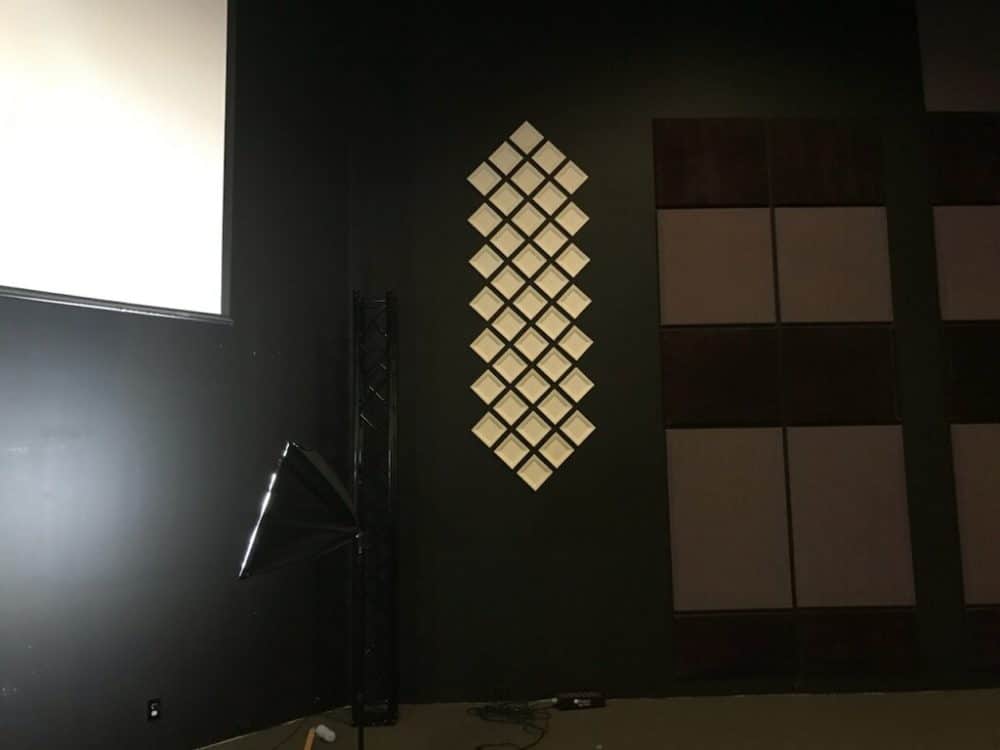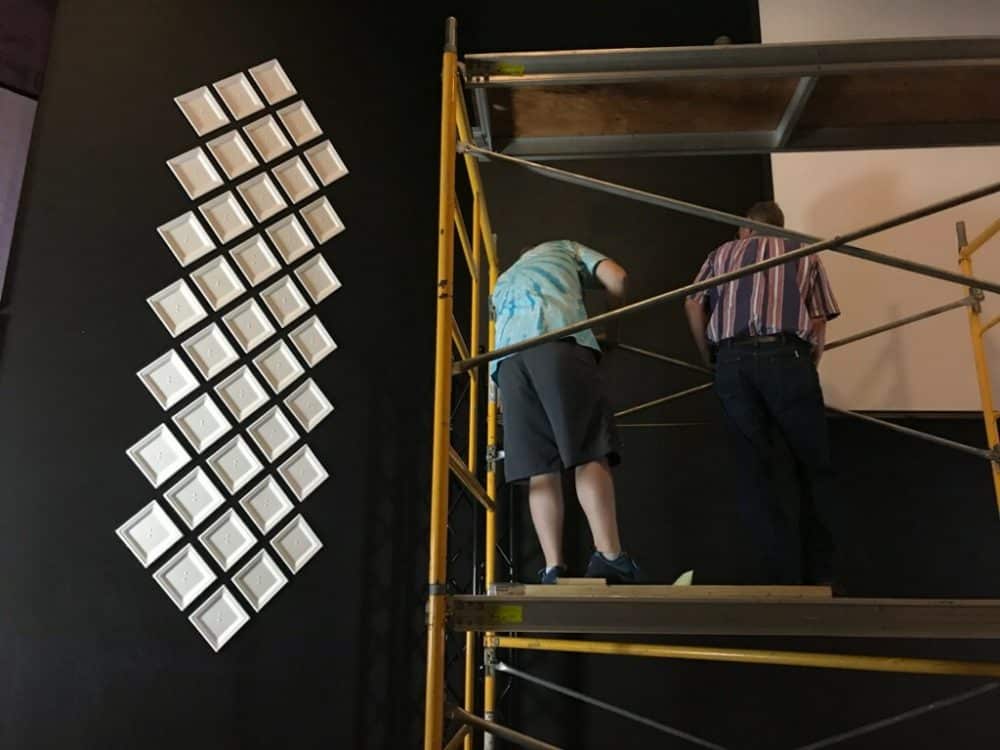 This was inspired by the Portable Plates design. They used square paper plates from Amazon and got white pushpins. They used 2 pins per plate and hung yarn from the top and put their plates on the wall. They laid out plates on the floor to see what design they liked best. They found that wider spacing between plates was best. They used a 2 inch nail when they spaced the center line of plates. Then after the middle column was finished, they used a 2×4 on it’s side to space out the other plates. All in all, this took around 6 hours, 2 guys, and 1 large pizza.