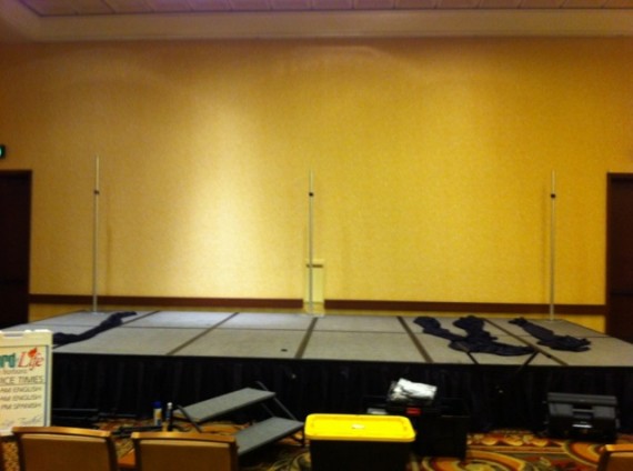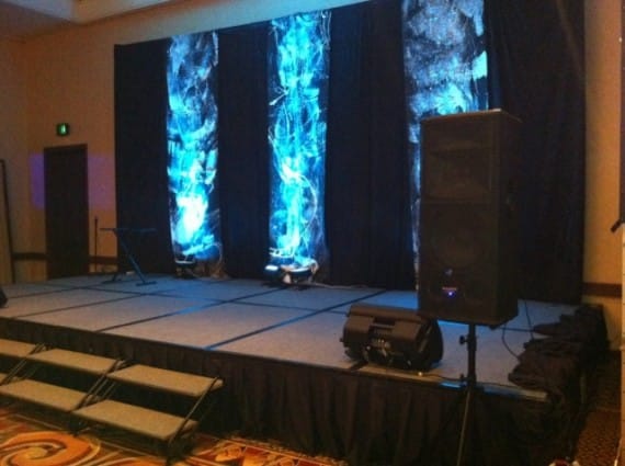 They setup and break down weekly at two different venues (Sundays and Wednesdays). So they wanted a very quick-and-easy to setup element for their stages. So they had someone sew some black curtains for them. Then they used strips of weedblock grunge painted white over the curtains. They used four LED fixtures to light them. Easy setup–only 20 minutes!