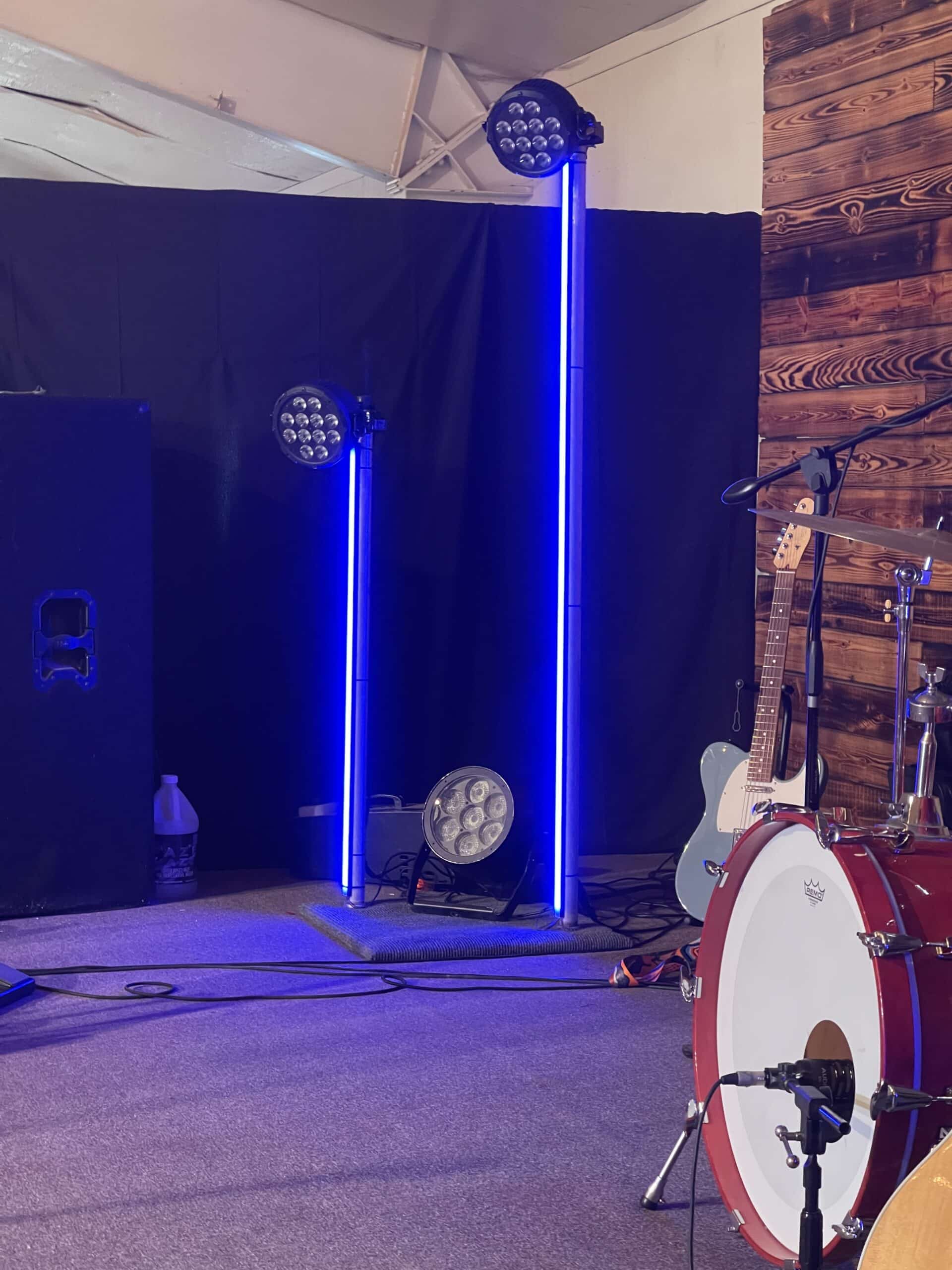 RGB LED strips and LED channels with frosted lenses make up the LED lines. Jeremy double-sided taped them to the pipe and wrapped zip ties at the top and bottom to keep the LED channels attached. The 1 1/4” pipe was chosen because of the fixture clamps he already had to mount the Pars. The RGB strips are controlled with an RGBW DMX decoder. The units are easy to transport.