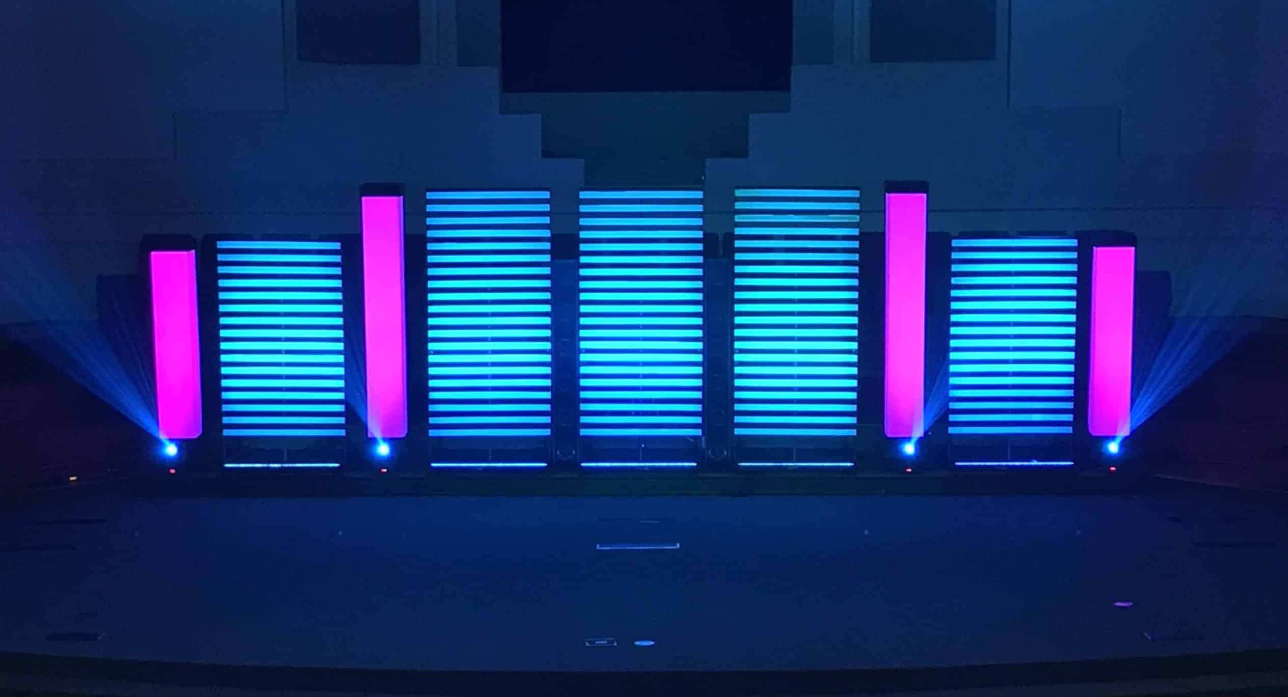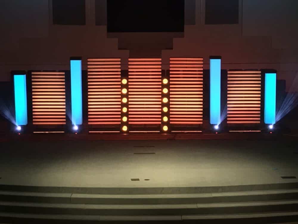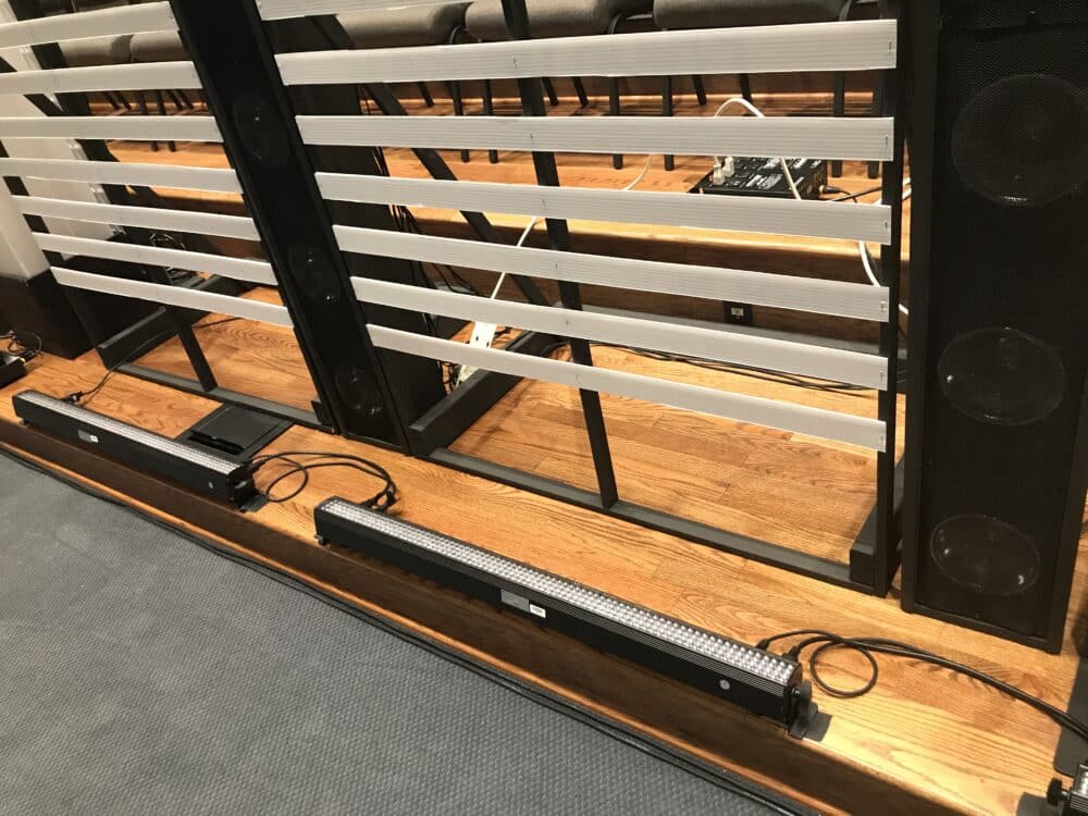 Mark said “We built a blend of Tiny Lines and All the Levels for our summer concert series. The horizontal slats are 2” white Coroplast strips cut with a Coroclaw, stapled to furring strip frames on 2×4 bases, lit by 42” ADJ Mega Bars. The columns are neutral Coroplast lit by a LED par in each base. The blinders were custom-built using clamp lights, 1×8 boards, luan, and window screens, controlled by a dimmer pack. The columns were spaced outward because we didn’t like the look of them on the screen behind the speaker. The total cost for the wood, paint, and Coroplast (bought surplus from a sign shop on Craigslist for $5 per 4×6’ sheet) was under $300, all work done by Mark and Austin Cannon over a couple of weeks. We already had the lights.”