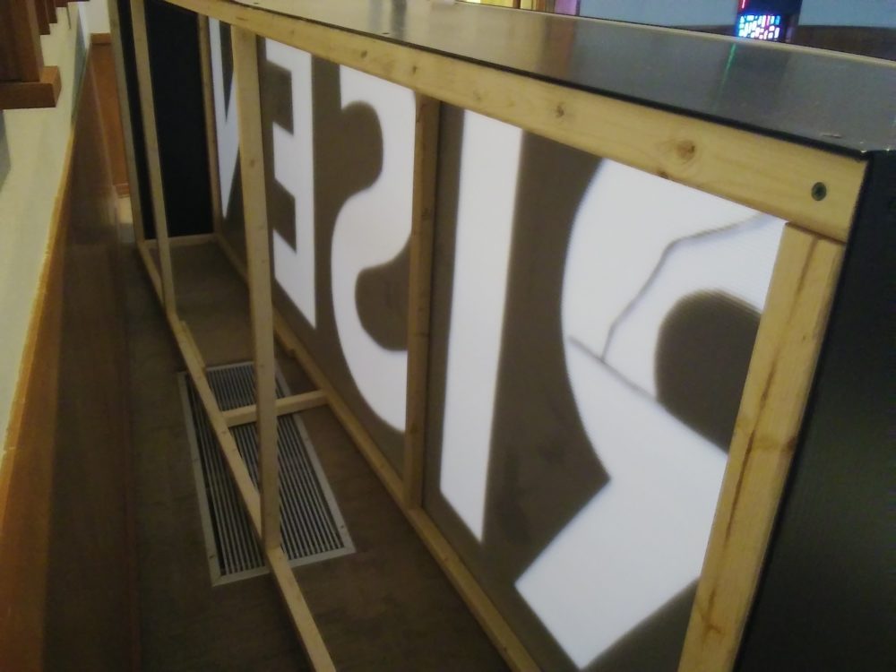 Next we built the 4′ x 12′ box out of furring strips, careful not to put a strip where it would be visible behind clear letter. Fastened strips together with screws (drill a pilot hole first).