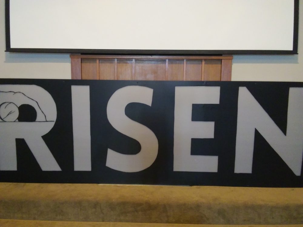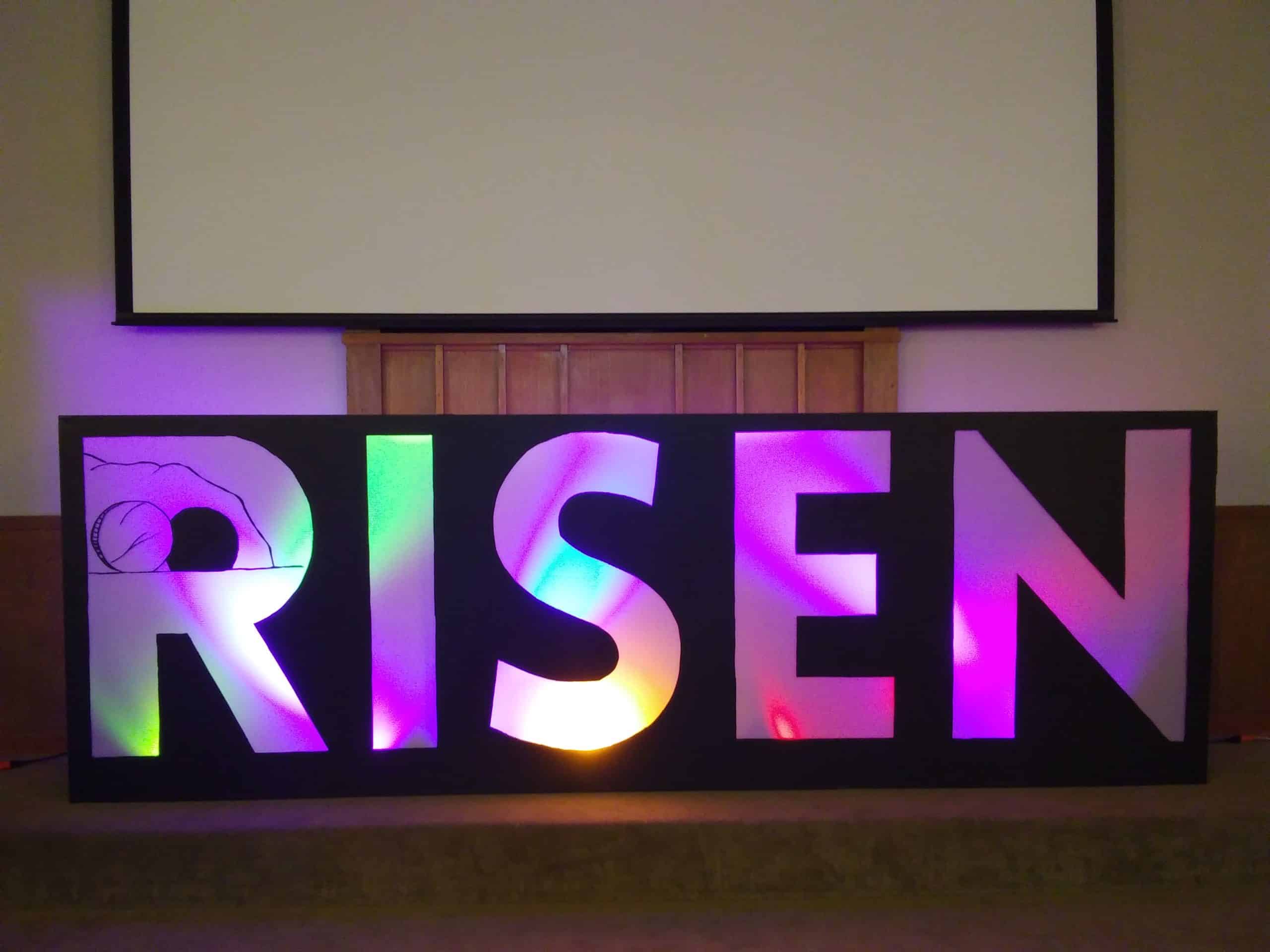 First we projected the word ‘Risen’ onto 1 1/2 sheets of black Coroplast. 4′ tall, 12′ long. Traced the word then cut with Xacto knife.