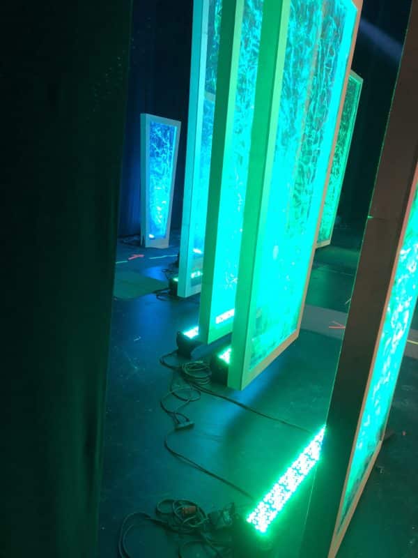 They used 1/2″ MDF for the face of the walls and 3/4″ x 4″ strips of plywood on the back of the wall to give it stability. The middle was 6′ wide bright aluminum screen door rolls from Amazon that they balled up and then stretched out to create the texture. The tallest wall was 16′ and the shortest wall was 4′.