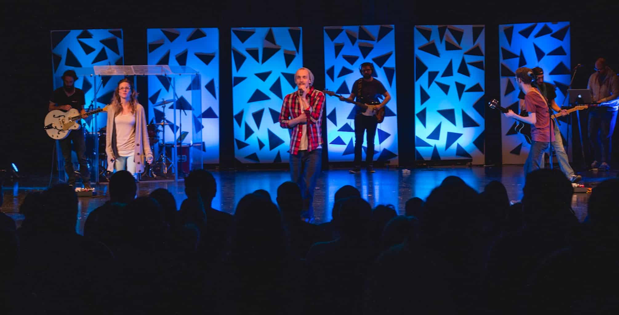 They wanted something with height and portability. They are a portable church and have to load everything on trailers after every Sunday. They meet at a High School Auditorium that holds a lot of nice conventional lighting. So all they have to move in are 14 LED fixtures. They have 10 Chauvet Slim Pro Tri-pars and 4 ADJ Mega Tri Bars.
