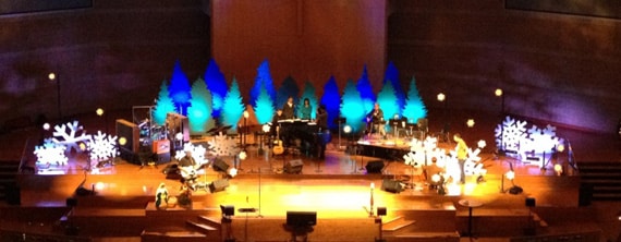 They started by making Christmas trees from foam core painted dark green and blue. Then they screwed wooden frames to the foam at varying heights to create a natural forest look. They did the same thing for the snowflakes in the front. They created the small snowflakes throughout the stage using wooden poles with worklights clamped to them (attached to a dimming system). They clipped foam snowflakes in front of the light.