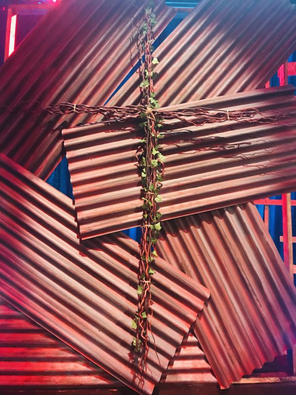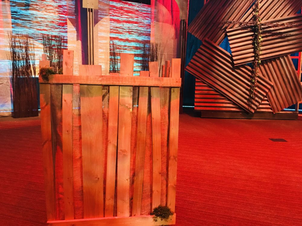 The center of the stage contained a cross made from twisted willow set against a “rusted corrugated metal” wall. The wall was made form corrugated plastic painted with a faux rust paint.