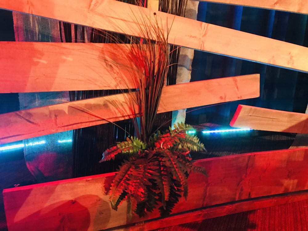 From Brad: Stage right contained a slat wall inspired by the “Third World Design” We purchased “culled lumber” from Home Depot – all of the bent, twisted and unusable pieces most people discarded – which saved us almost 75%. We stained them with a grey stain to give them a weathered appearance.