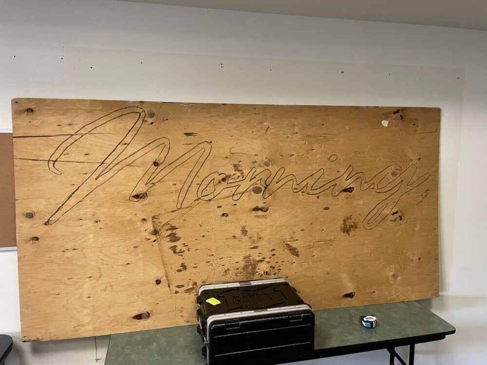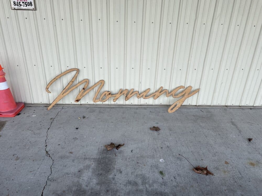 The journey began with our collaborative graphic concept. Justine and I worked together to develop the initial vision, and once we had the design just right, I took a projector and traced the word “morning” onto a sheet of plywood. With careful precision, I cut out the entire word using a jigsaw, making sure to keep it as one piece to simplify the hanging process.