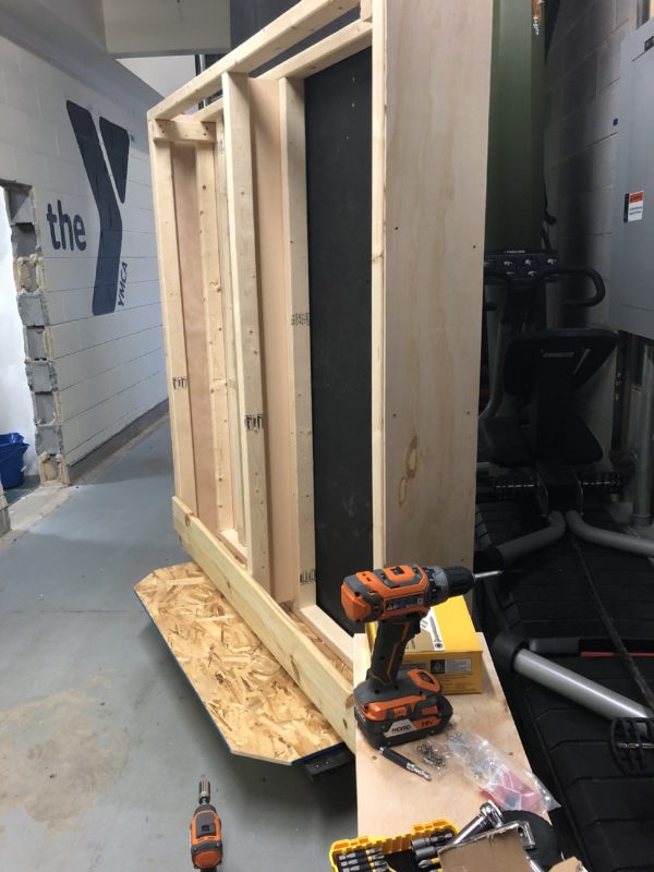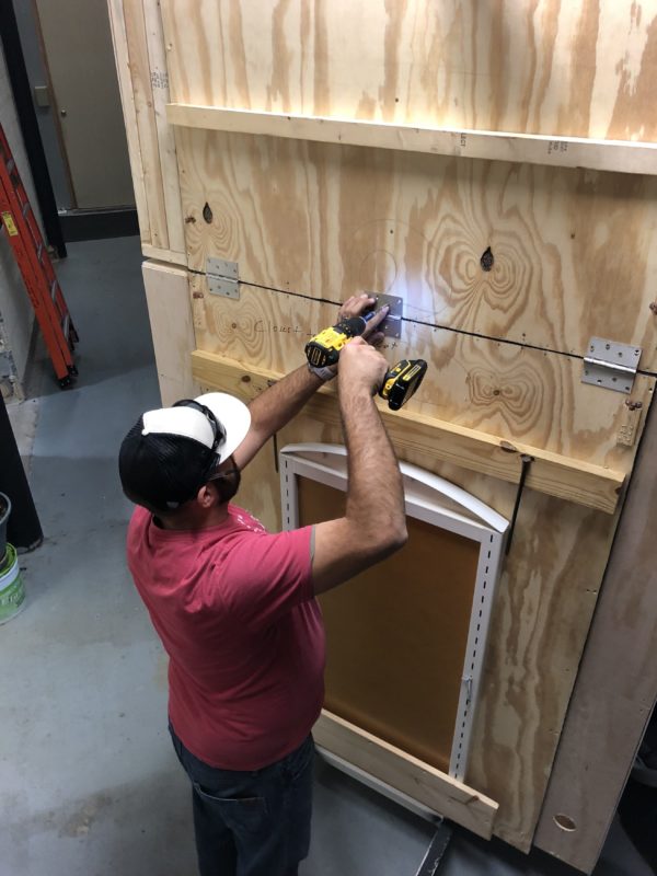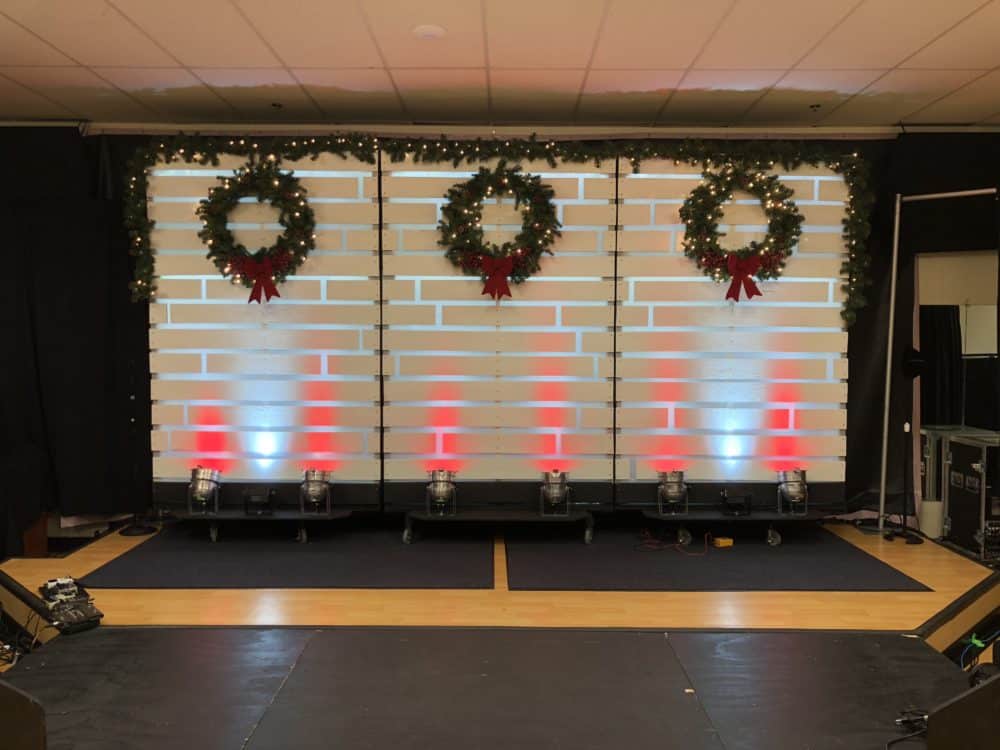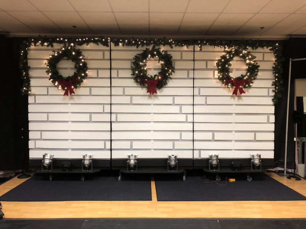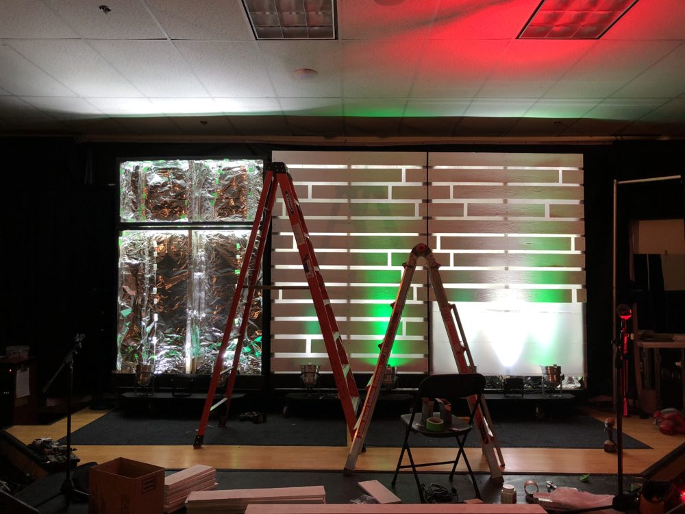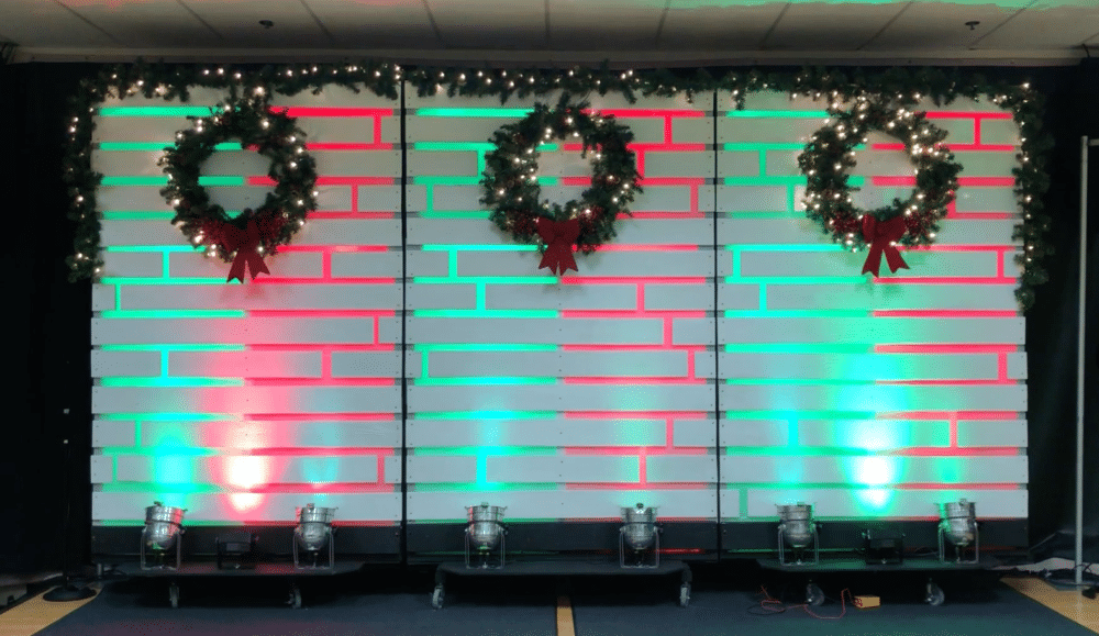 Then they used cheap fencing wood slats found at home depot, painted them white, and affixed them to the front in semi-random patterns. They placed these frames on centerpieces that came from Abercrombie and Fitch. They were moving clothing displays in a former life. You’ll also notice that for each of the 3 structures, there were two frames with hinges. This is because they’re portable and they had to fit through the doorway upon setup/teardown. They also installed a removable black painted board on the bottom of each structure so they could access cables and lights if necessary.