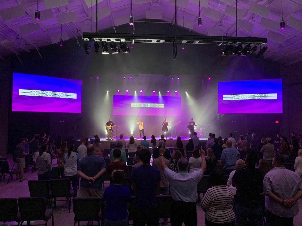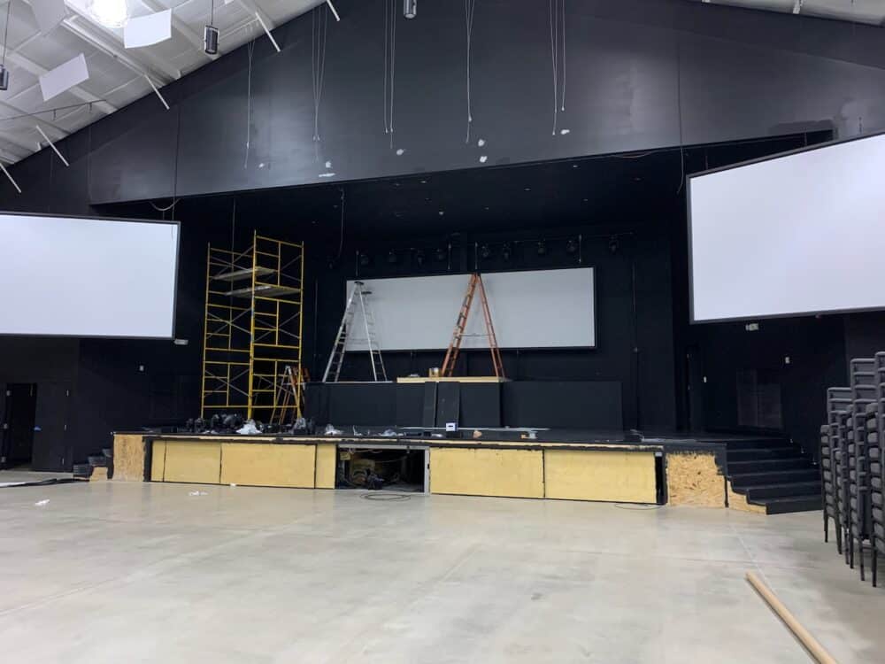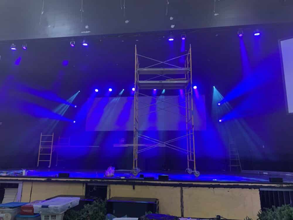 Pro Church Lights provided all of the lighting. They created a lighting design rendering for free before we purchased the lights. The lighting fixtures used allows for many different stage looks to be created very quickly as they are all color changing and mostly moving heads. There are 22 moving head fixtures in total.