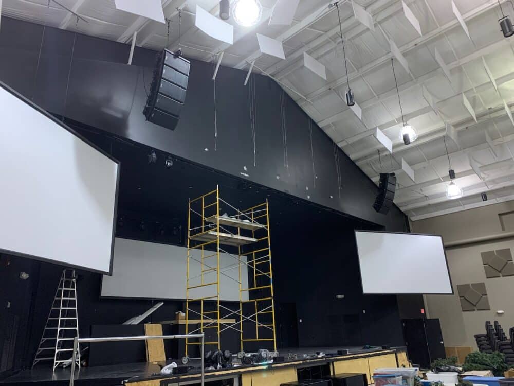 2 Panasonic 6,000 lumen laser projectors (PTVMZ60) were blended to create the center screen. It is driven by ProPresenter7. The center screen is 24′ x 7′.