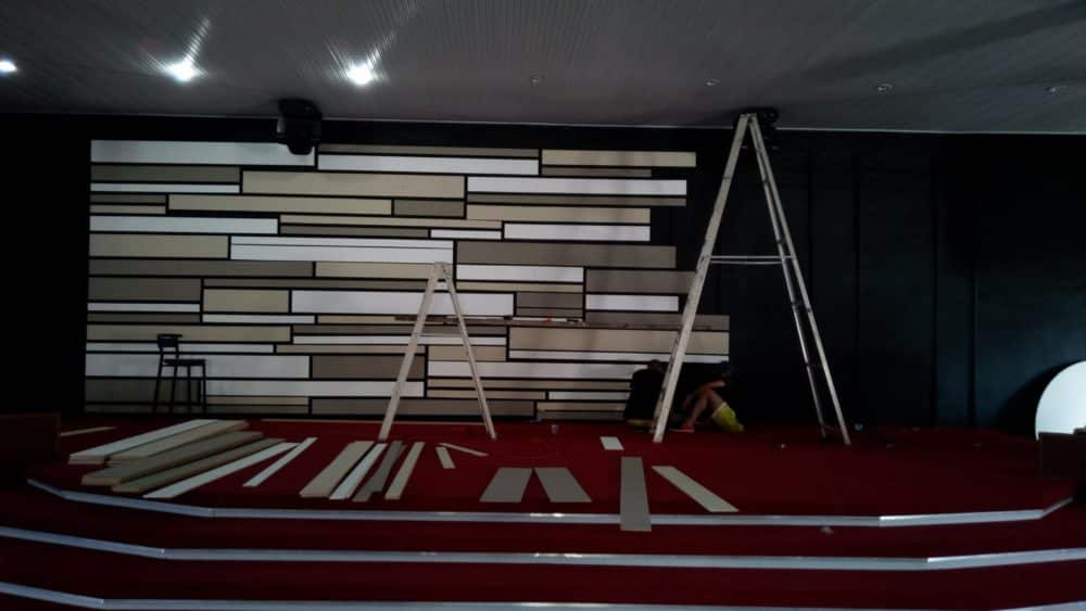 To create this look, they used square metal tubing (1-inch thick) for the structure that was attached to the wall. Then they cut panels out of wood and painted them three different tones – white and two types of gray.