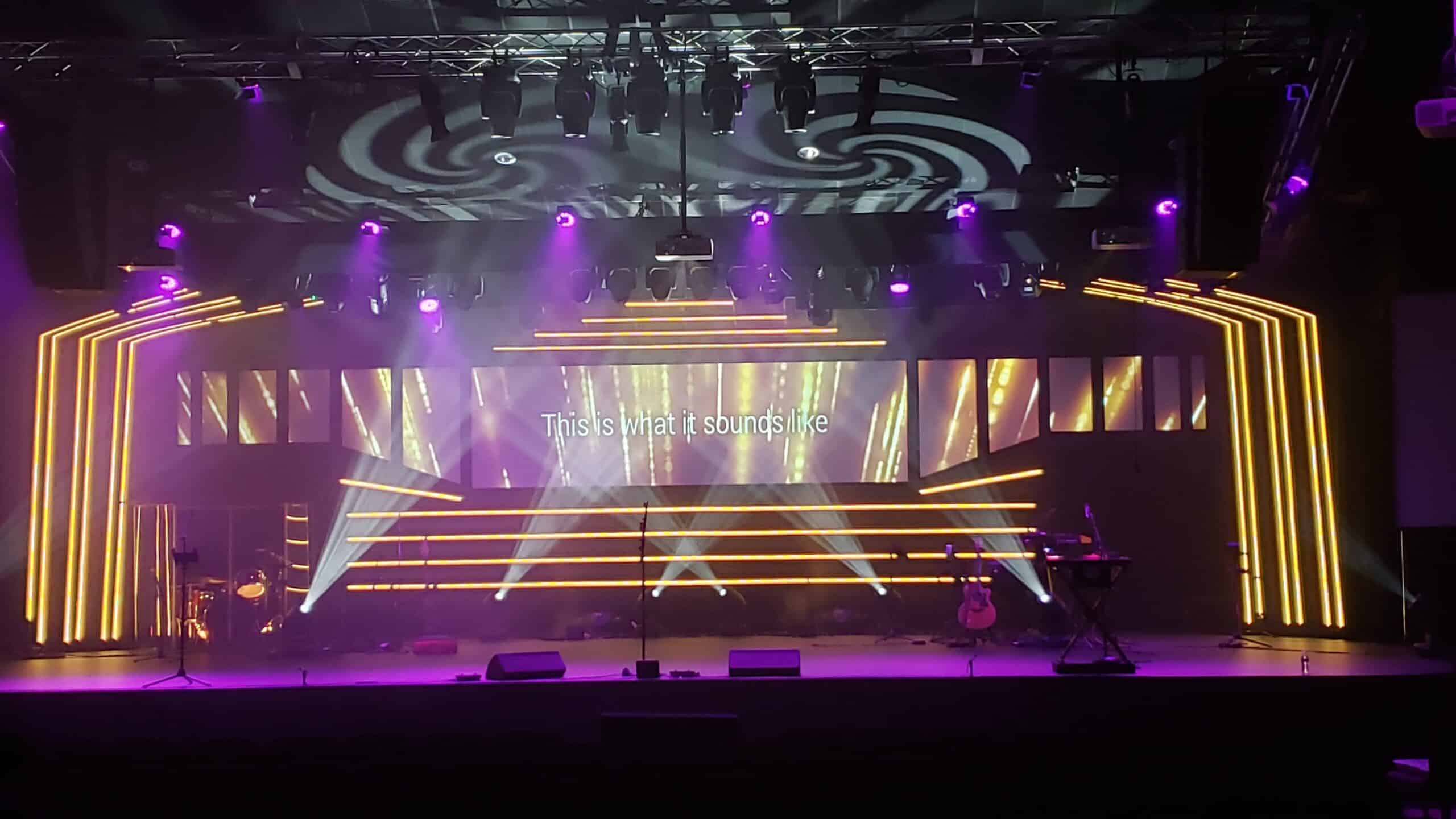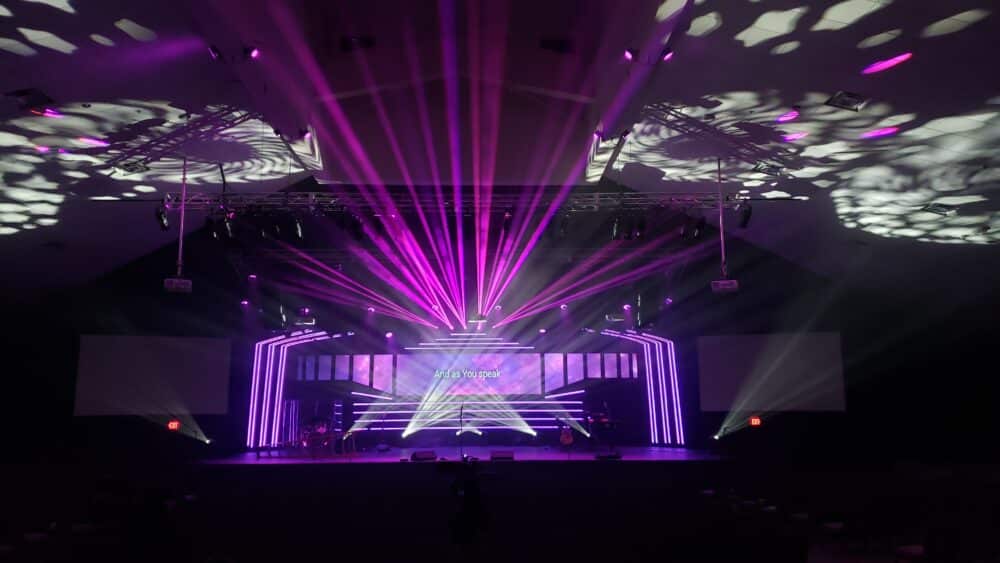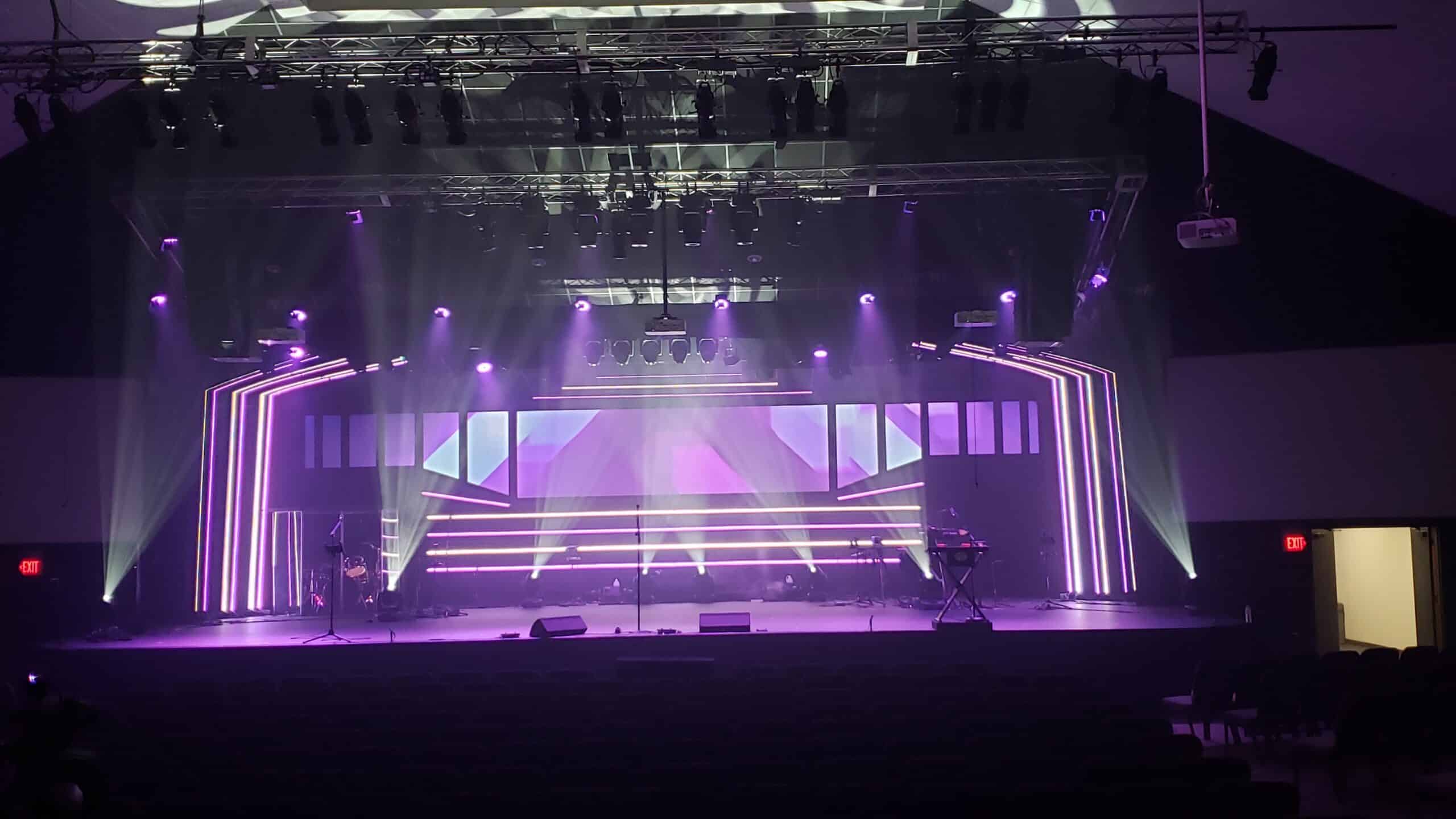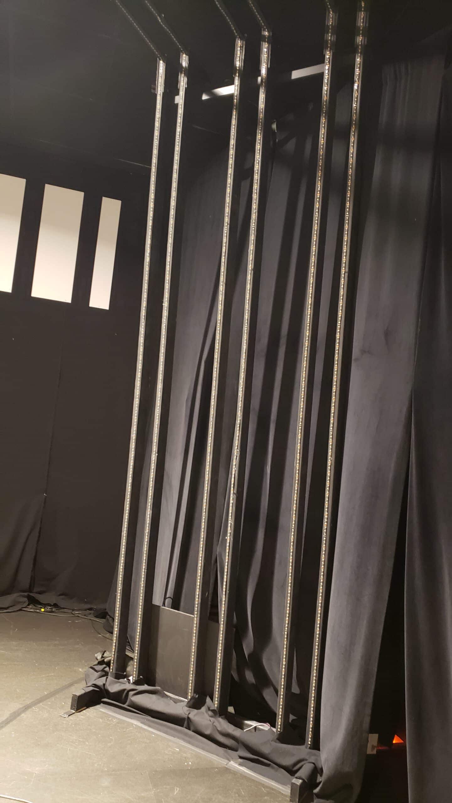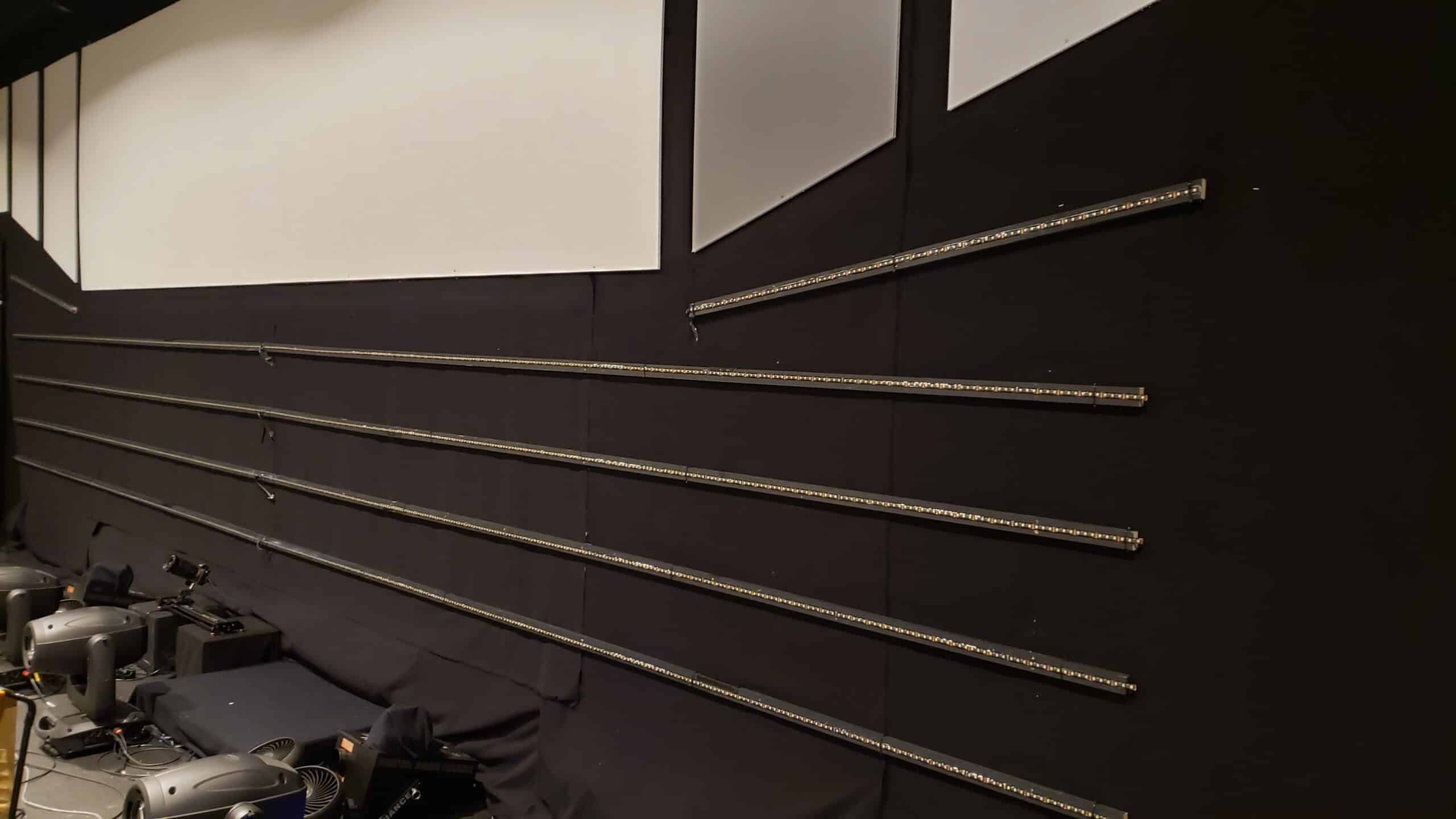 They reused the electronics to power the LEDs, which they reused from “Glowing Pieces”. The screens were 10mm Coroplast and the LED strips were integrated RGBW mounted on 1×2 wood strips with hot glue. They moved their back truss forward and they “set wall” back to give them more stage room and the appearance of a higher ceiling.