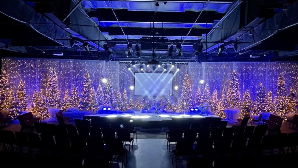 They added three LED Christmas light curtains in the back (from KALE Stage Lighting, two of them were 17’h x 36’w and one was 17’h x 28’), then hung 12 rolls of netting in front of the LED curtains with gaff tape.