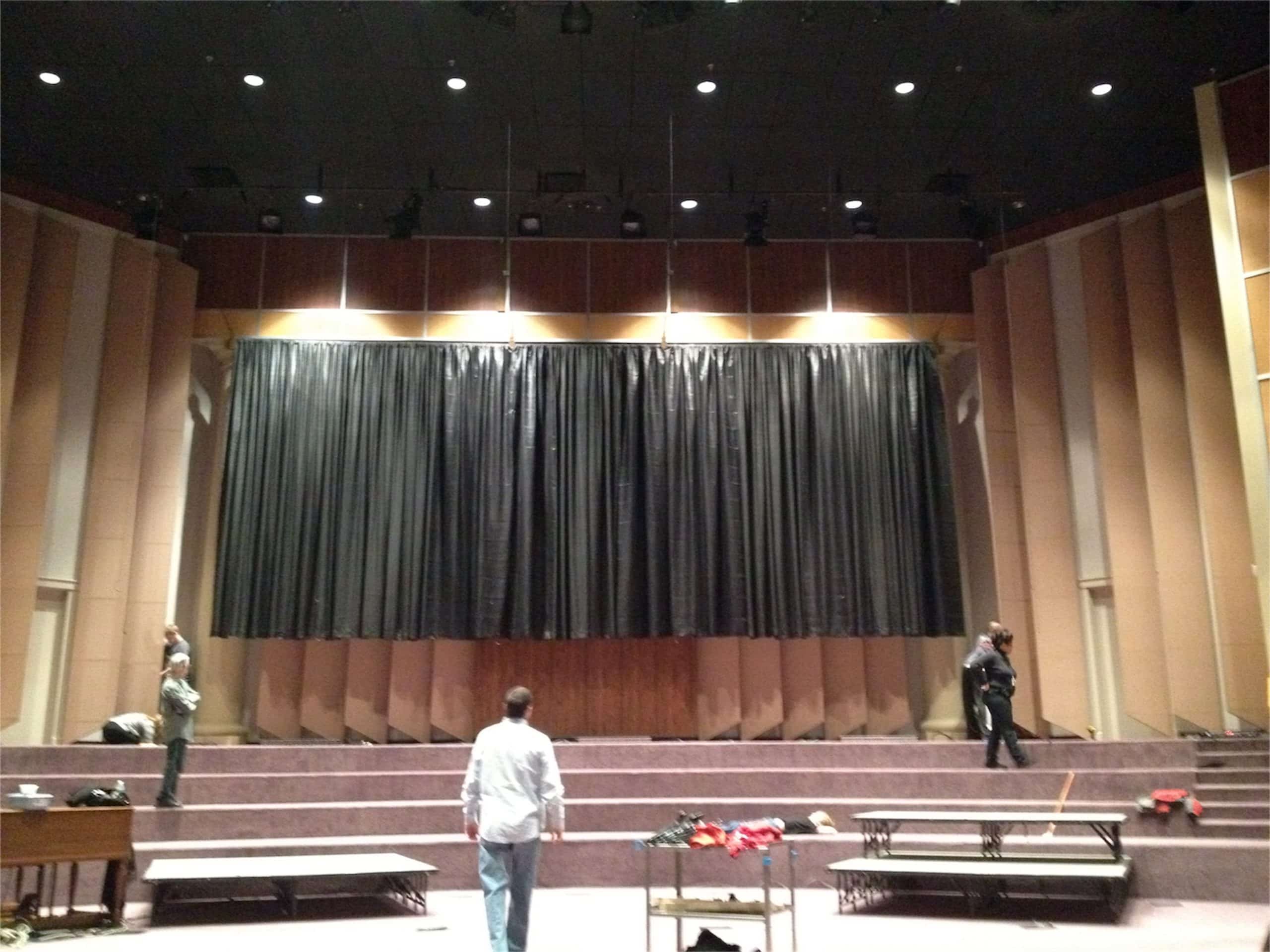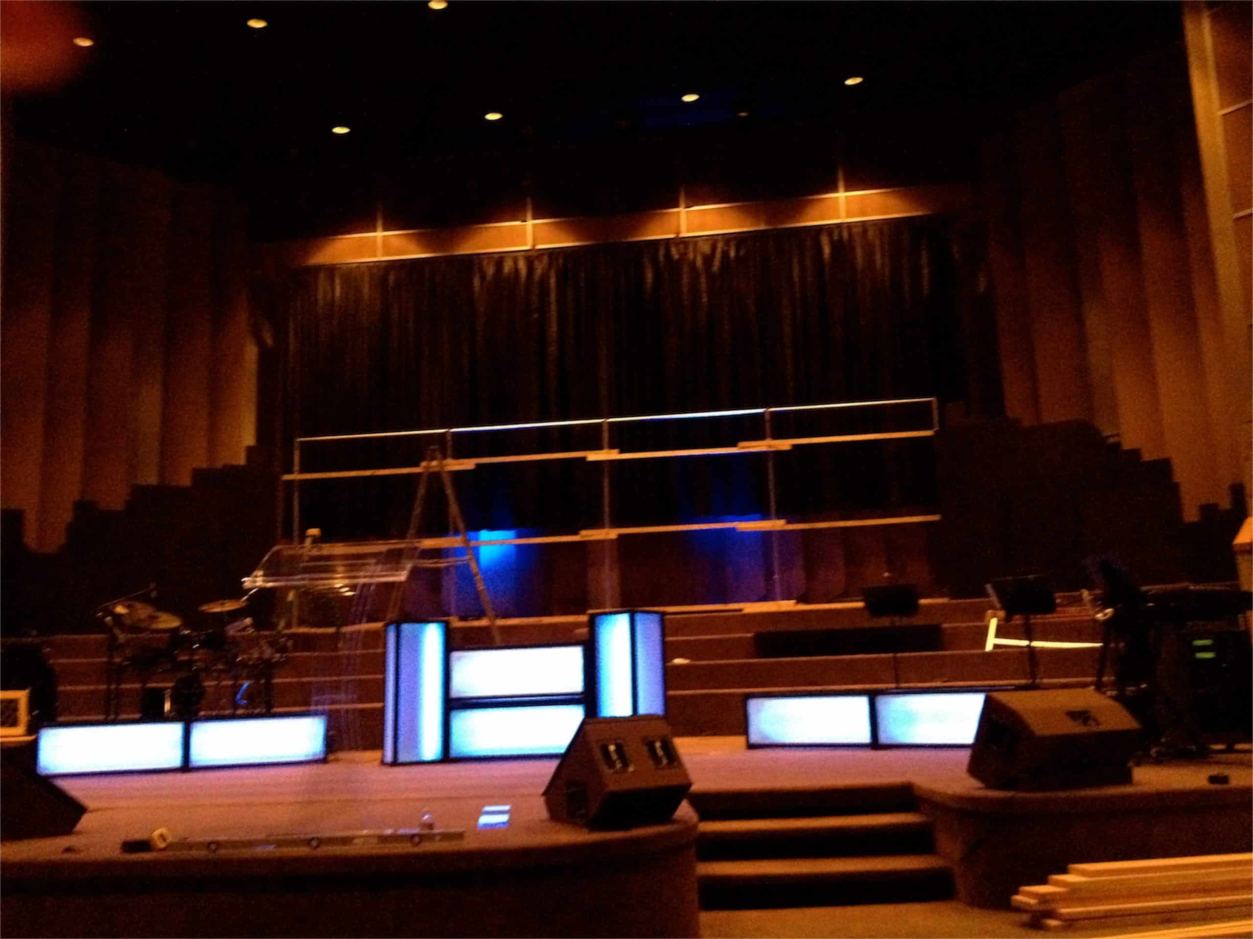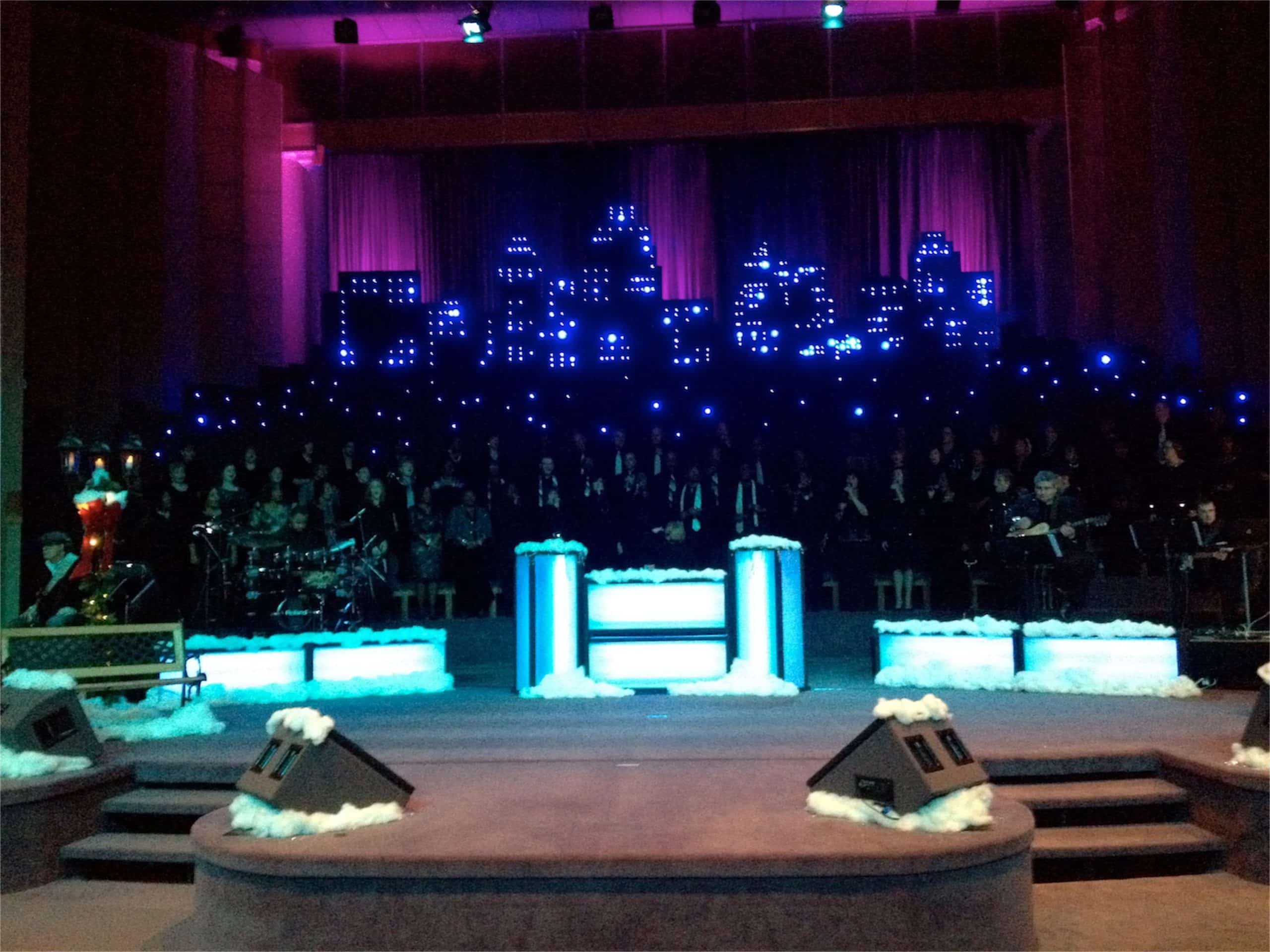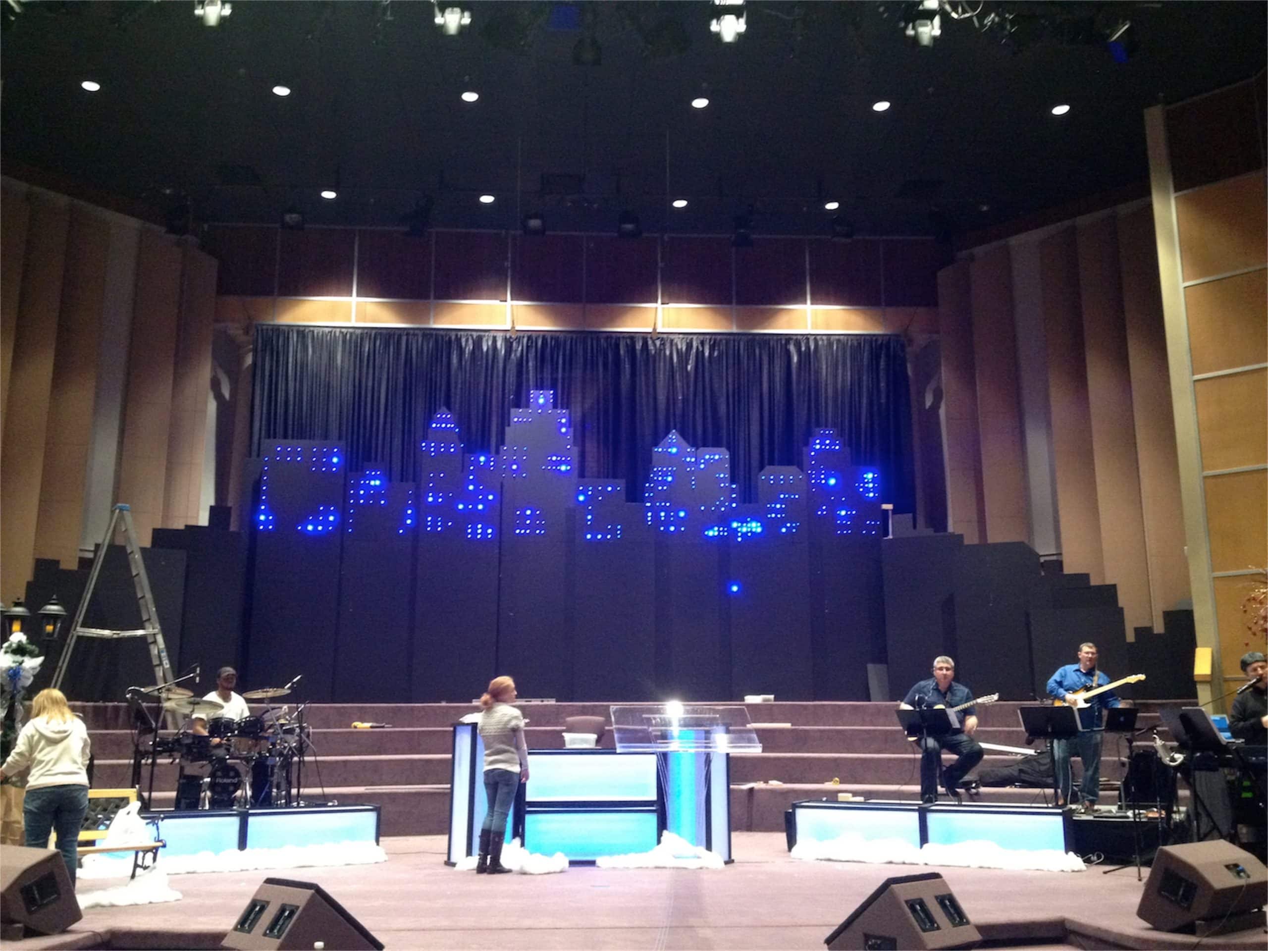 They modeled the buildings at the back of the stage after the Kansas City skyline. They cut the buildings out of 4’x8′ black foam board sheets and punches holes into them with a Bic pen. Then they put blue LED Christmas lights through the holes. At the tallest point, the buildings were 16′ tall.